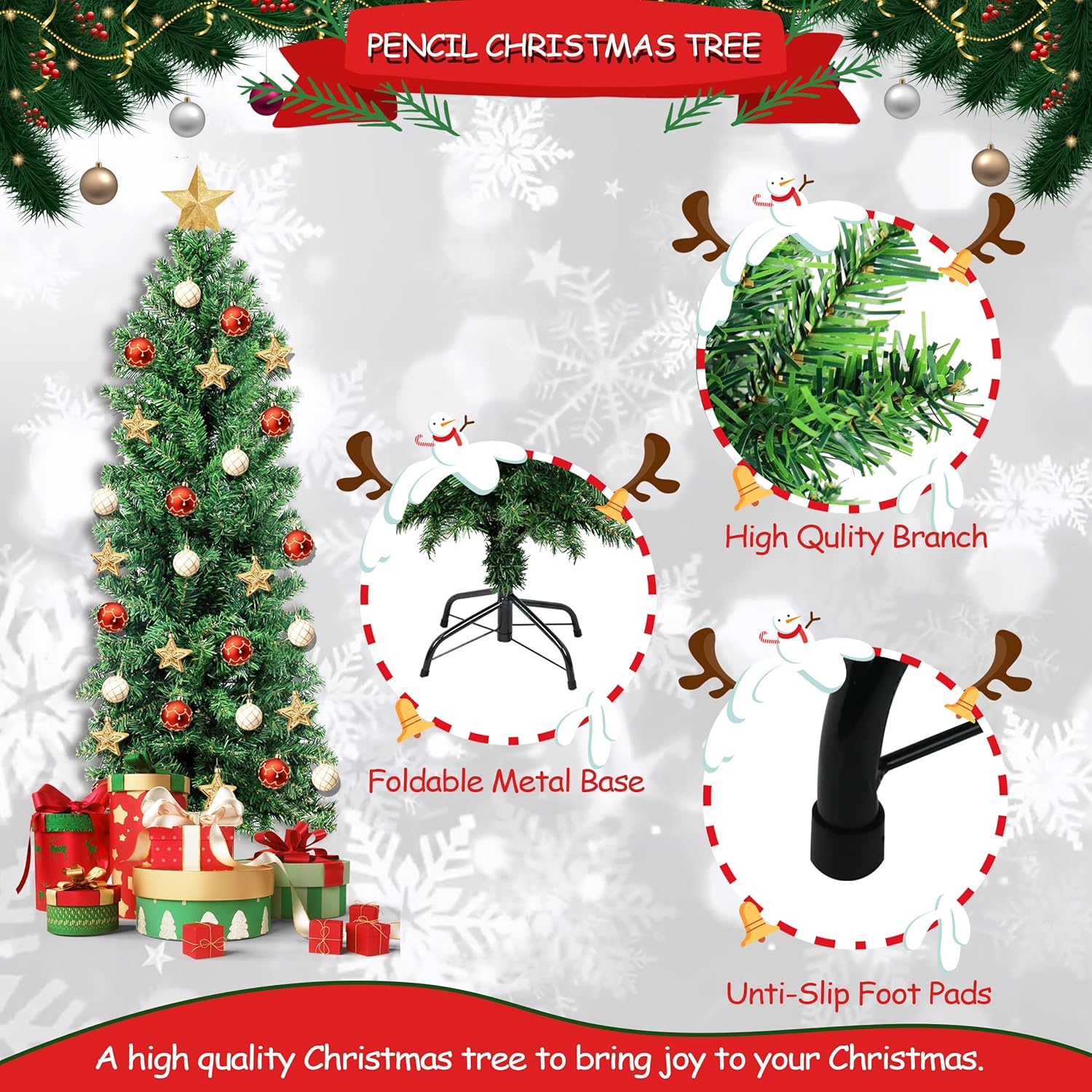Suunyglade 5.5FT Green Artificial Christmas Tree, Premium Hinged Pine Tree with Solid Foldable Metal Legs, Pencil Shape Christmas Tree Perfect for Home, Shops and Holiday Decoration