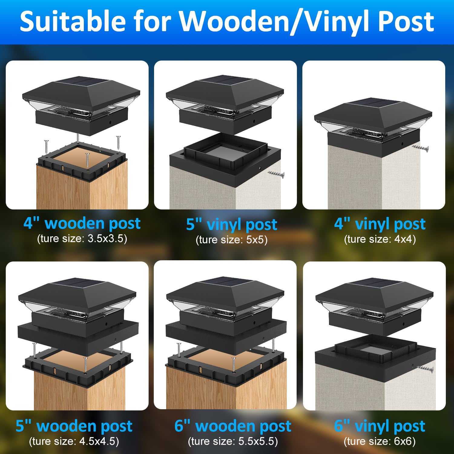 【6 Sizes for Wooden/Vinyl Post】T-SUN solar post cap light simplify your outdoor lighting setup with our easy-to-assemble post cap light. The solar fence post cap light come with ①4x4 wooden post (ture size: 3.5x3.5) ②4x4 vinyl post (ture size: 4x4, need to remove 3.53.5in base to install) ③5x5 vinyl post (ture size: 5x5, need to remove 4.54.5in base) ④5x5 wooden post (ture size: 4.5x4.5) ⑤6x6 wooden post (ture size: 5.5x.5) ⑥6x6 vinyl post (ture size: 6x6, need to remove 5.55.5in base). When you need to install our post cap lights, simply add screws to the two holes inside the large cap. 【8 Colors & 3 Modes】Our solar post cap lights outdoor with 2+6 Colors and 3 Lighting Modes(3000K Warm White, 6000K Cold White, Red, Green, Blue, Yellow, Cyan, Purple). Warm/Cold White are ideal for daily lighting, RGB cycle mode is perfect holiday decoration for Halloween Spider Web, Pumpkin, Bat Wall Decor, Christmas, Year, Festivals or Party. If you're looking for an eco-friendly and partical way to light up your backyard fence, stair, deck and patio, this multi-colored solar post lights is sure to impress.