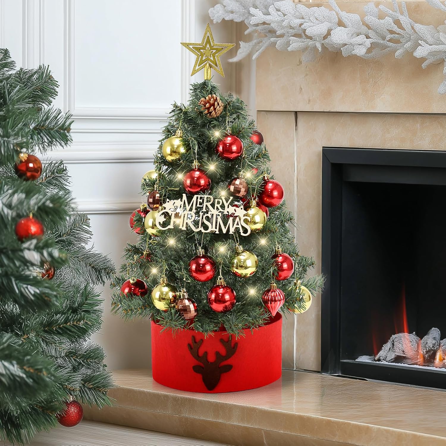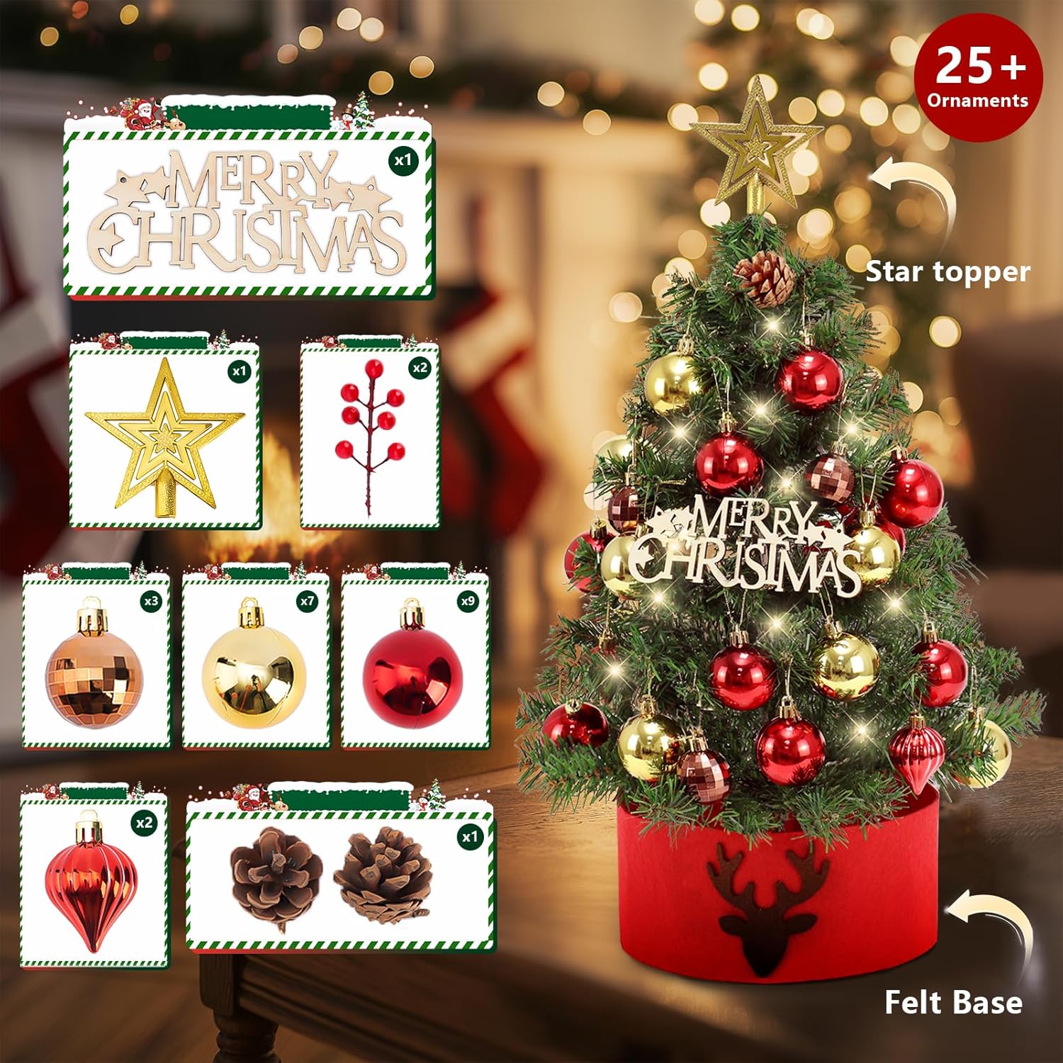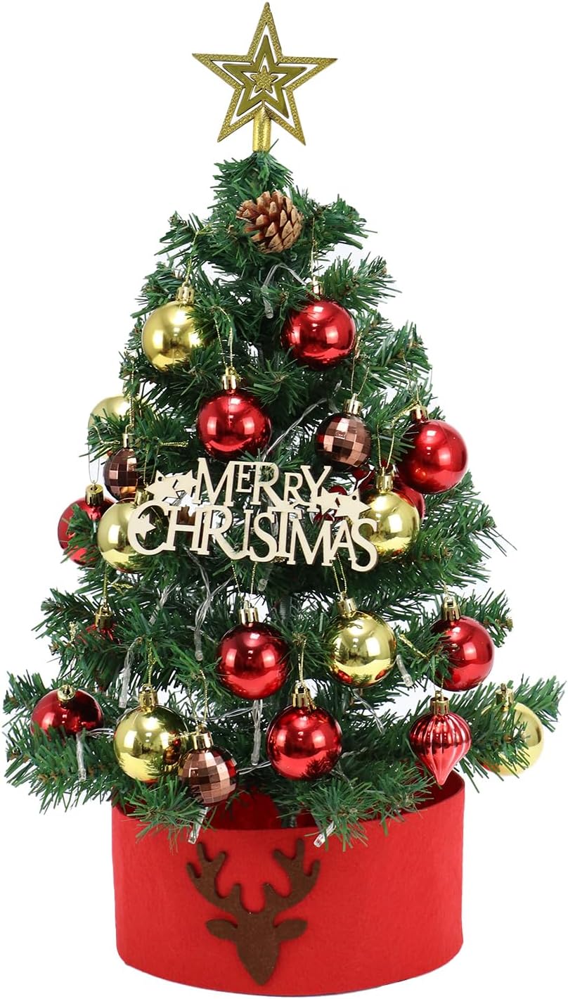 Tabletop Christmas Tree 24 in/60cm Mini Artificial Christmas Tree with LED String Lights,Star Treetop,Ornaments Balls,Pine Cones and DIY Decorations for Holiday décor,Tabletop Small Xmas Tree Green