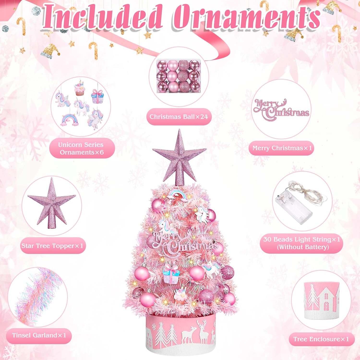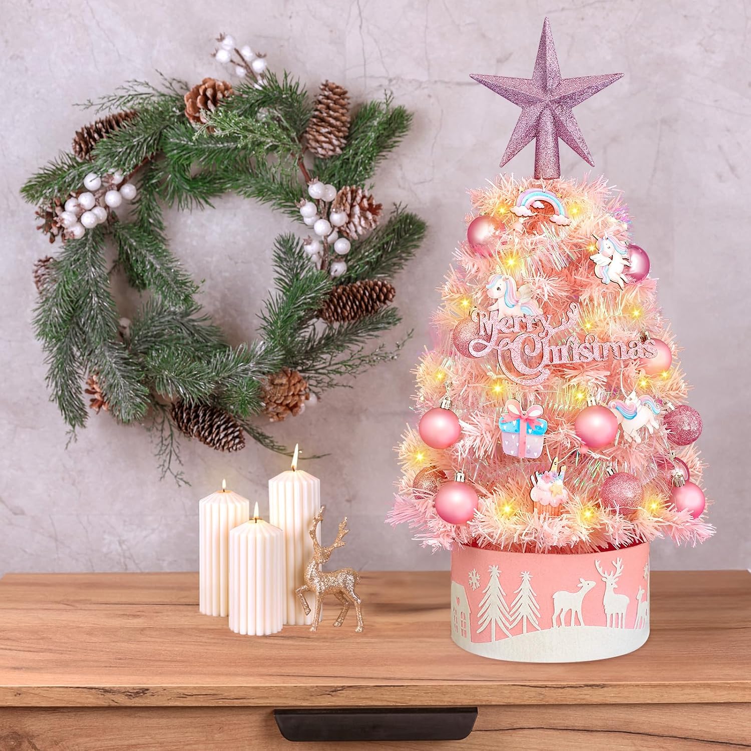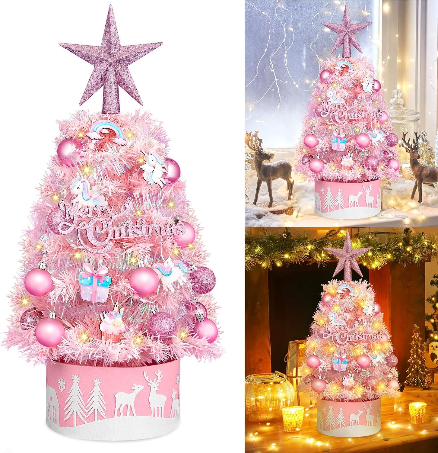 Tabletop Christmas Tree 24-inch Mini Christmas Tree with LED String Lights, Star Treetop, Hanging Ornaments, Tabletop Small Xmas Tree for Holiday Indoor DIY Christmas Decor Pink