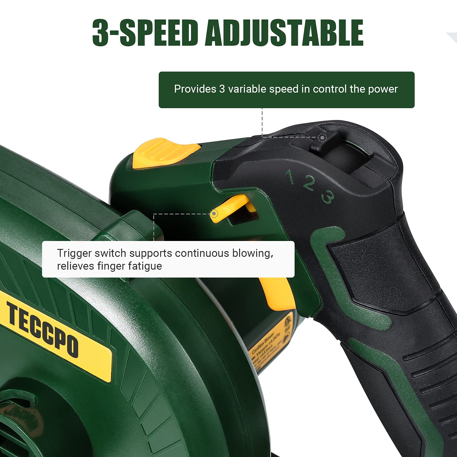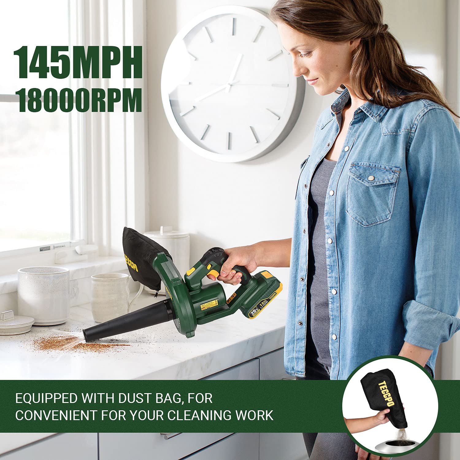 • HIGH-EFFICIENCY MOTOR & 3 VARIABLE SPEED: Built-in advanced copper motor which can provide Max 145MPH air velocity and 18000RPM no-load speed. Variable-speed setting meets different needs, suitable for indoor or outdoor work; Ideal for cleaning woodworking room, garages, driveways, car inside, computer host, porch, engine compartment, etc.