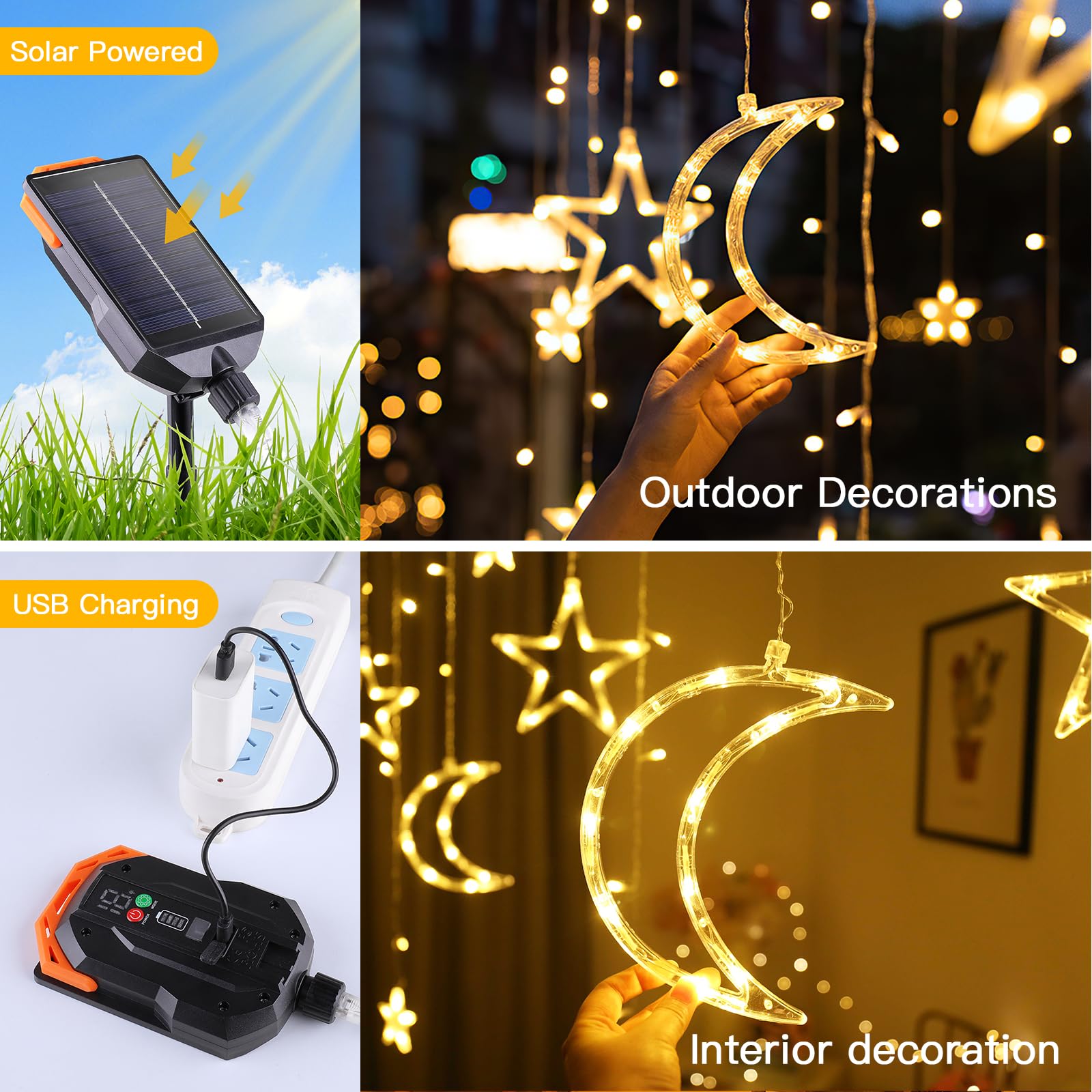 • 【Adjust Lightness & Timer & Memory Function】The solar string light has 3 lighting modes and comes with a memory function. Soft mode not only meets your brightness needs, but also extends the lighting time. Techip solar star and moon lights can create a comfortable and romantic atmosphere, making it perfect for various festivals and occasions, such as weddings, parties, Ramadan, Christmas, etc