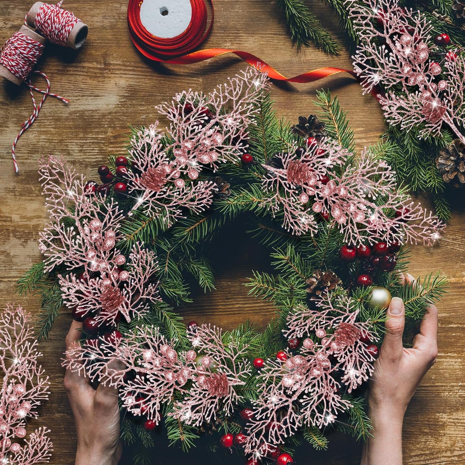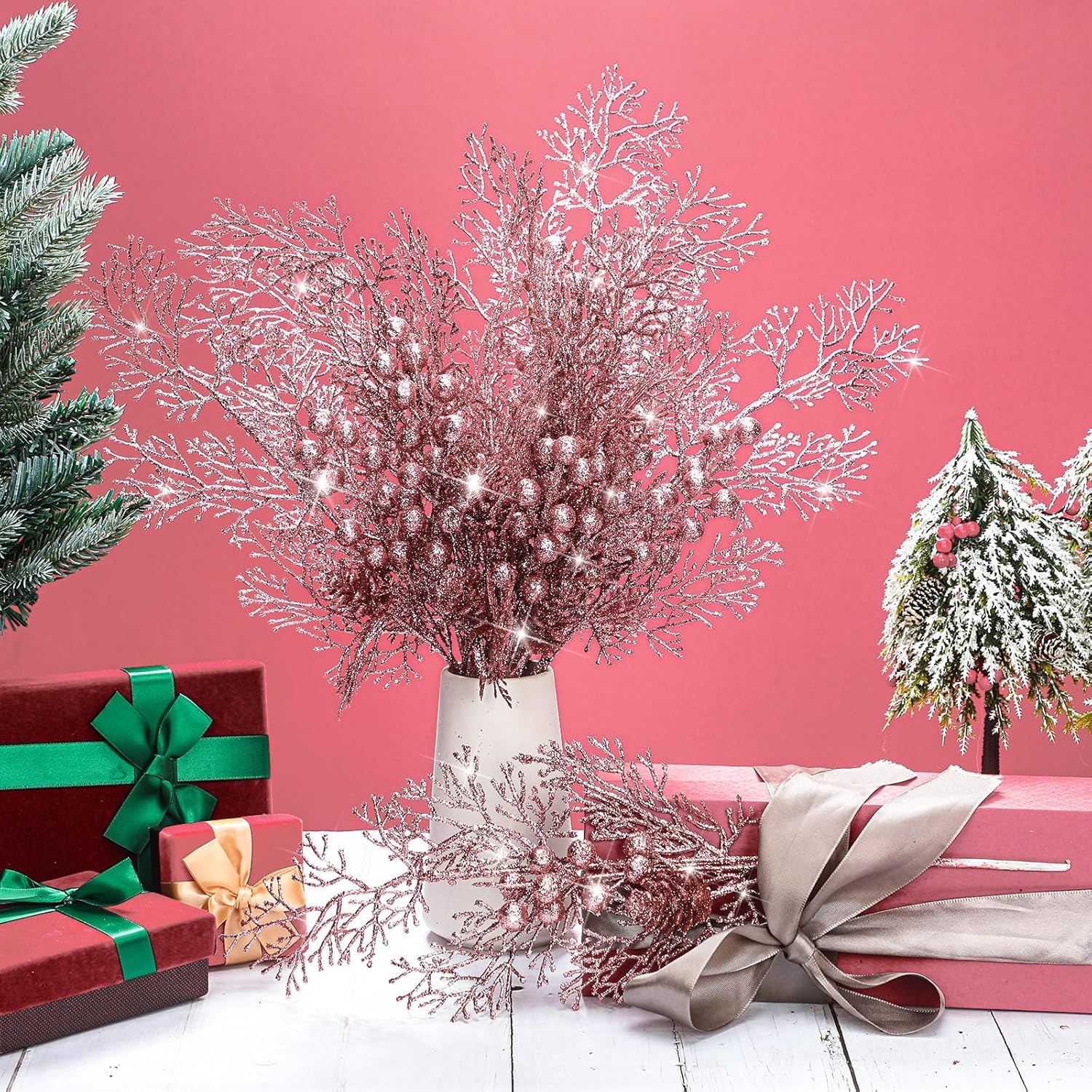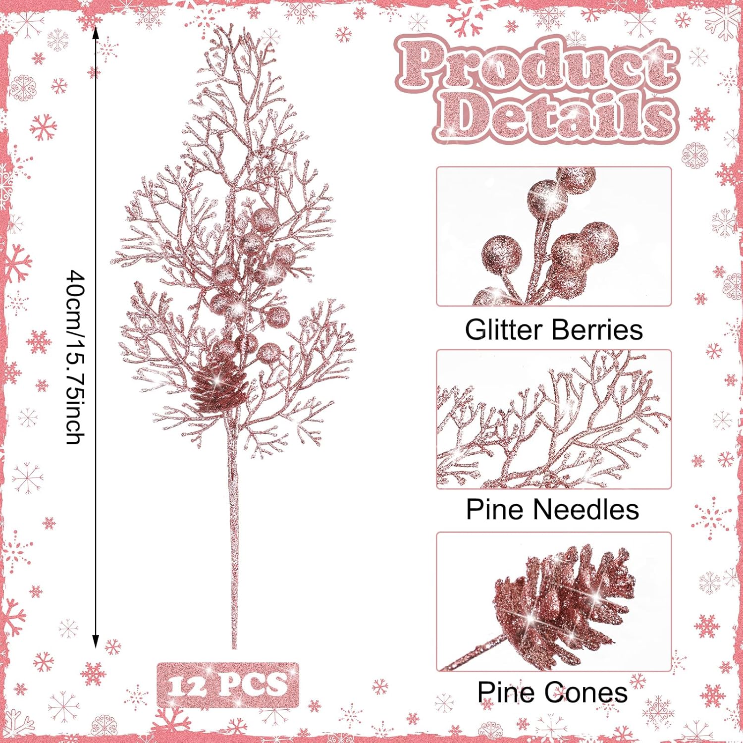 Tigeen 12 Pcs Large Christmas Tree Picks Bulk Glitter Branches Berries Stems Decorations 15.75'' Christmas Twigs Filler Berry Picks for Vase Christmas Tree Ornaments (Rose Gold)
