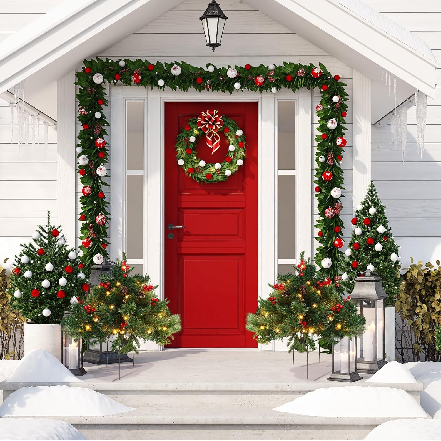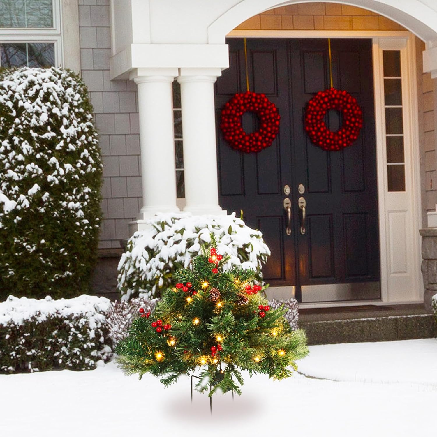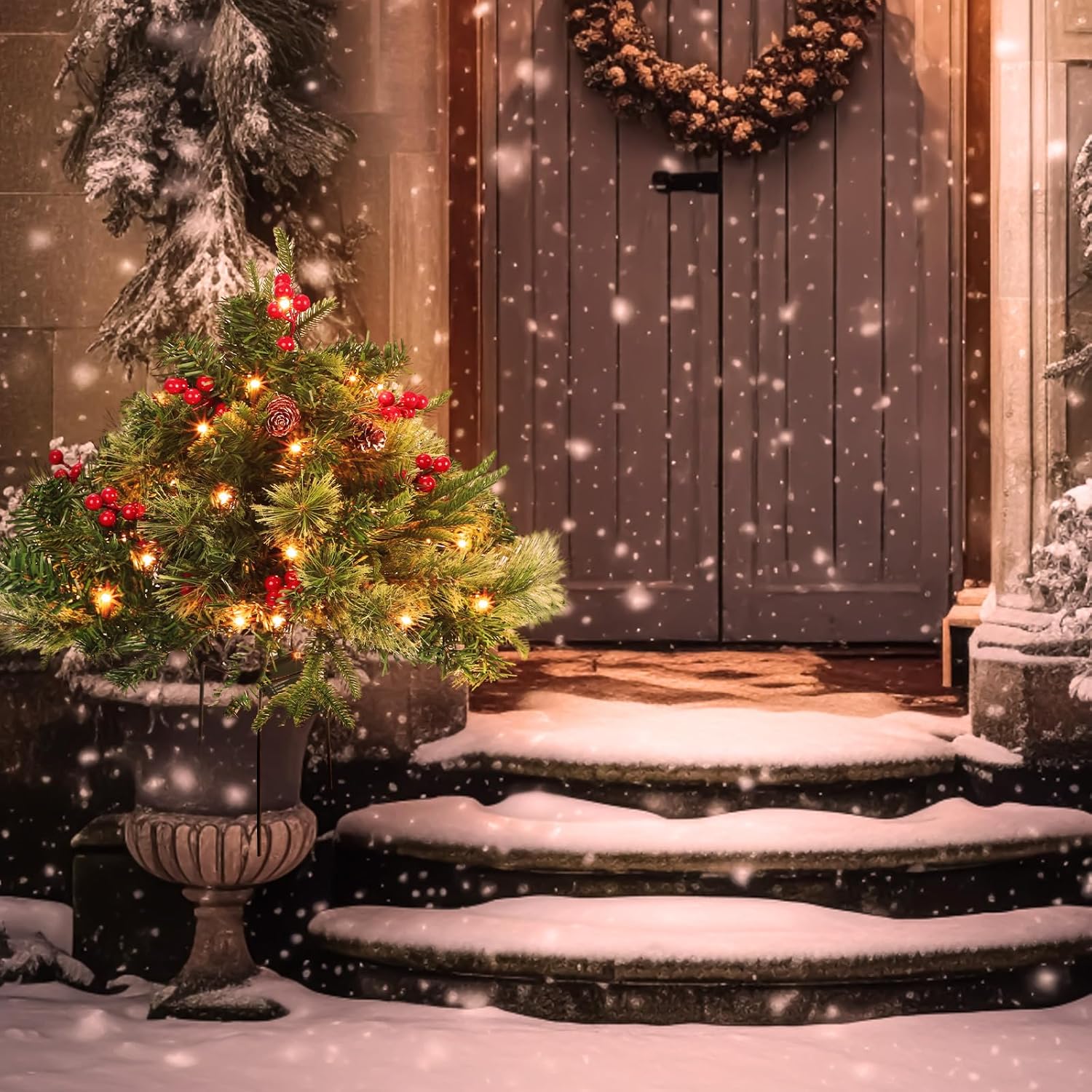 Tigeen 2 Pcs 22 Inch Christmas Tree Frosted Urn Filler Outdoor Planter Pots Filler Prelit Xmas Pine Trees with Cones and Red Berries 50 Warm White LED with 8 Light Modes and Timer for Yard(Common)