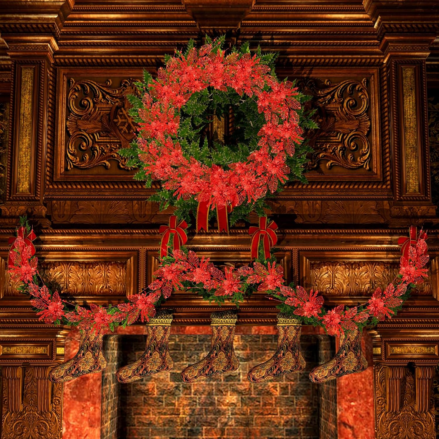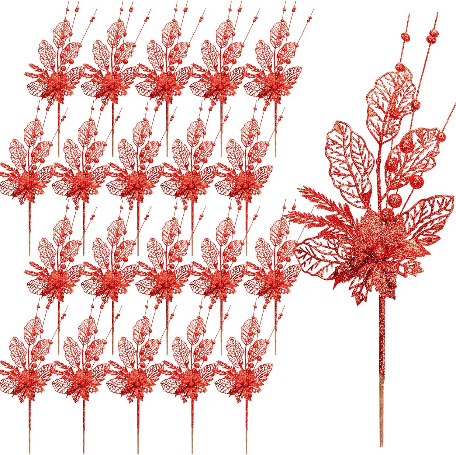 Tigeen 20 Pcs 16.5 Inch Artificial Christmas Picks for Christmas Tree Glitters Christmas Picks Sprays with Flowers Berry Leaves Christmas Glitter Berries Stems for Xmas Tree Ornaments (Red)