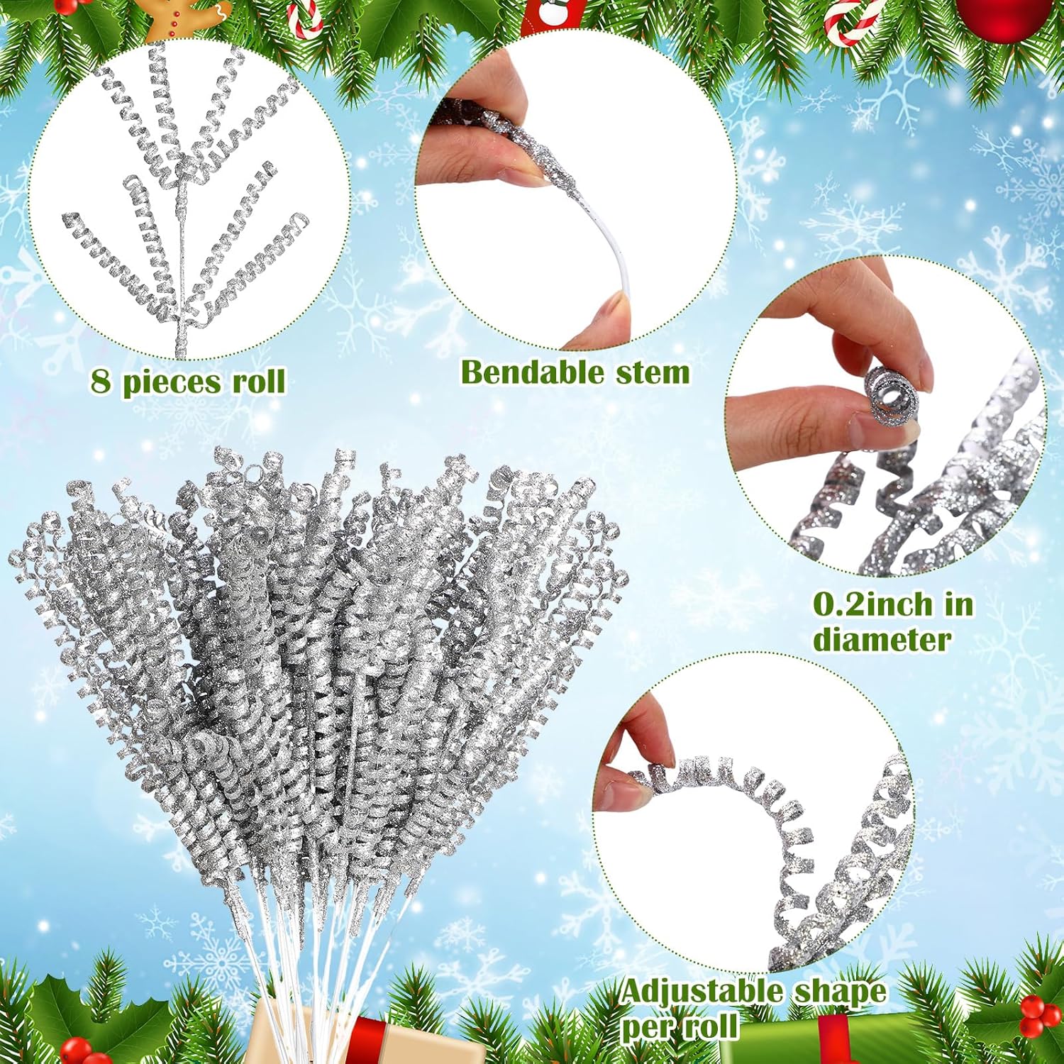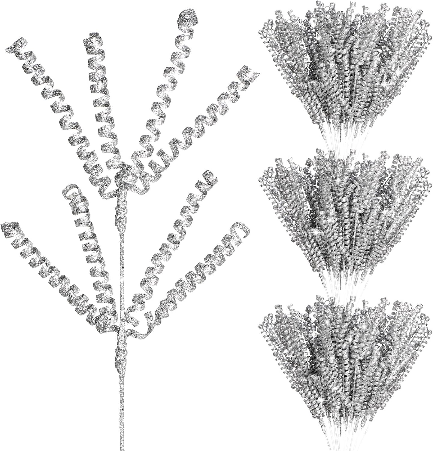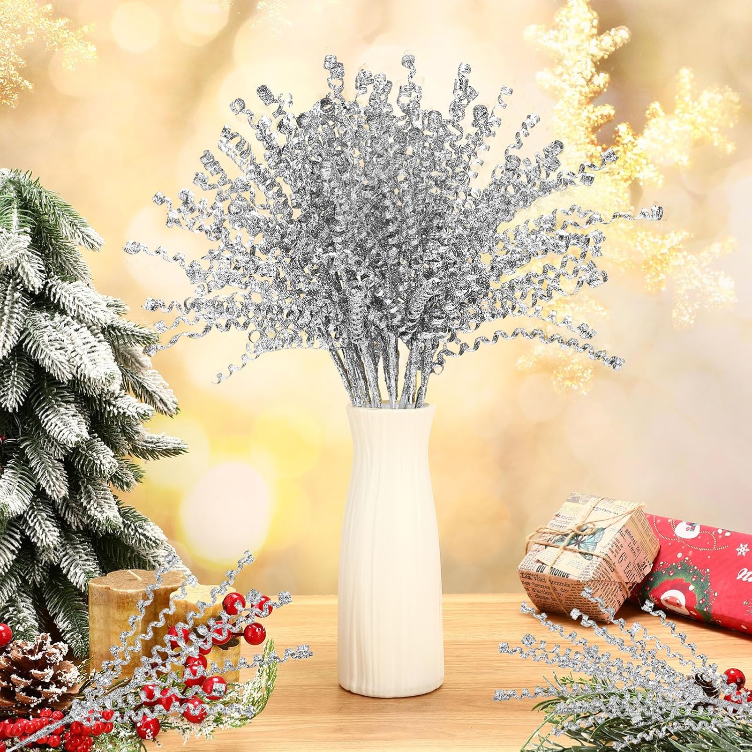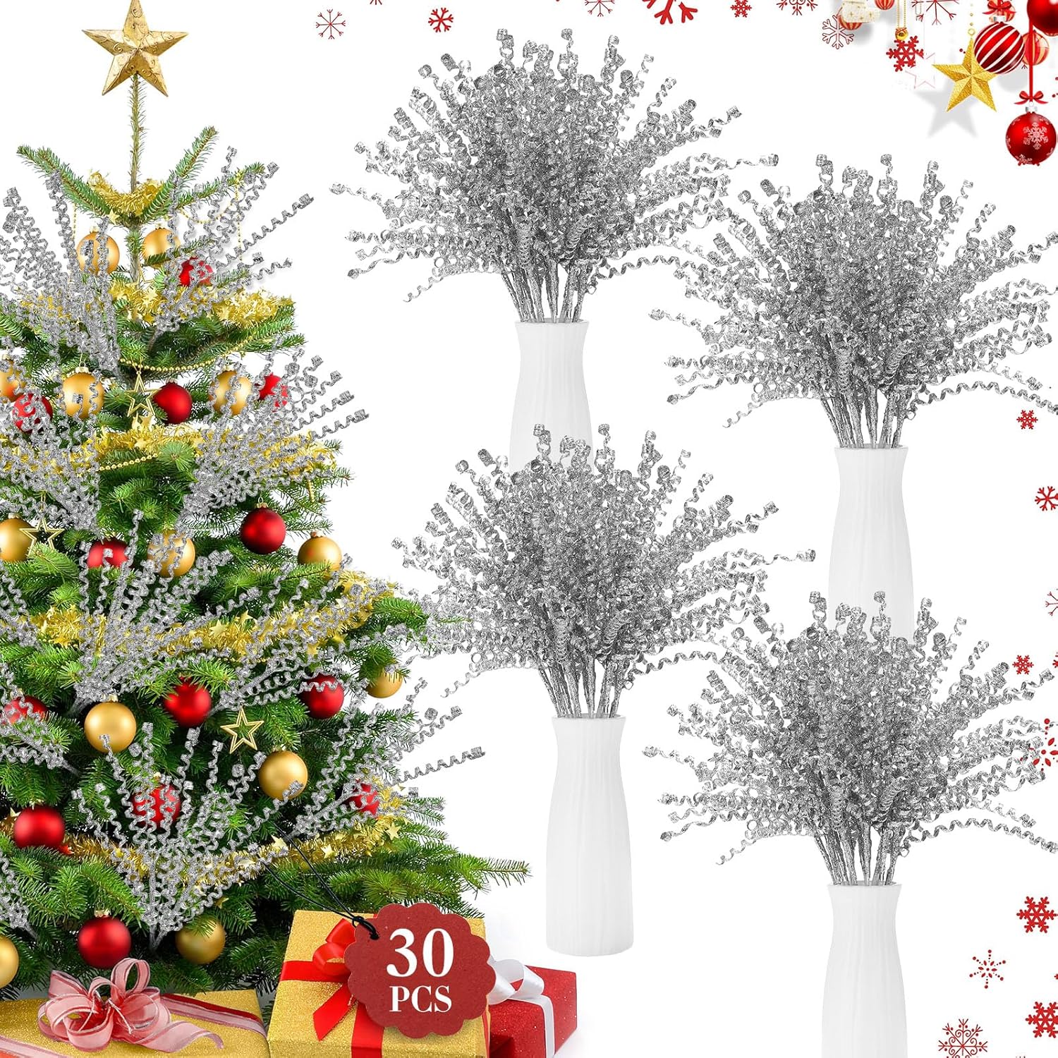 Tigeen 30 Pcs 16.5" Silver Christmas Tree Curly Picks Sprays Artificial Glitter Stems Glittery Twigs Branches for Christmas Tree Ornament Vase Filler DIY Garland Wreath Crafts Holiday Home Decor