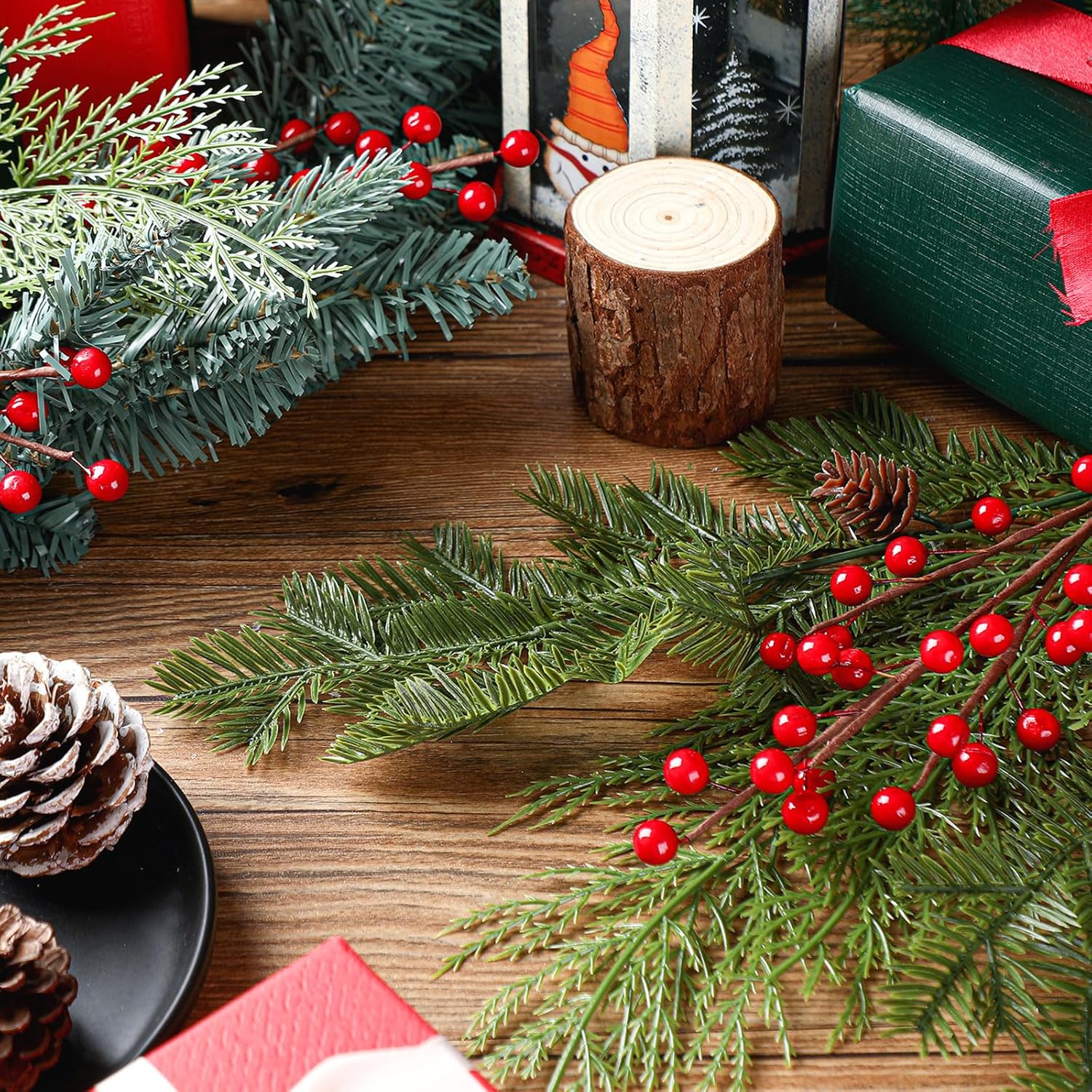 Tigeen 30 Pcs Christmas Artificial Pine Branches with Berry Stems 16 Inch Christmas Greenery Stems with Pine Cone Faux Cedar Pine Needles Picks for Xmas Tree Vase Wreath Garland DIY(Red)