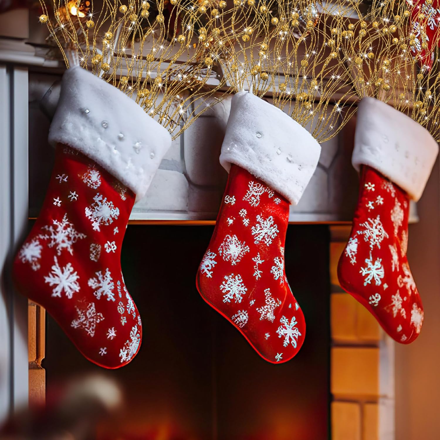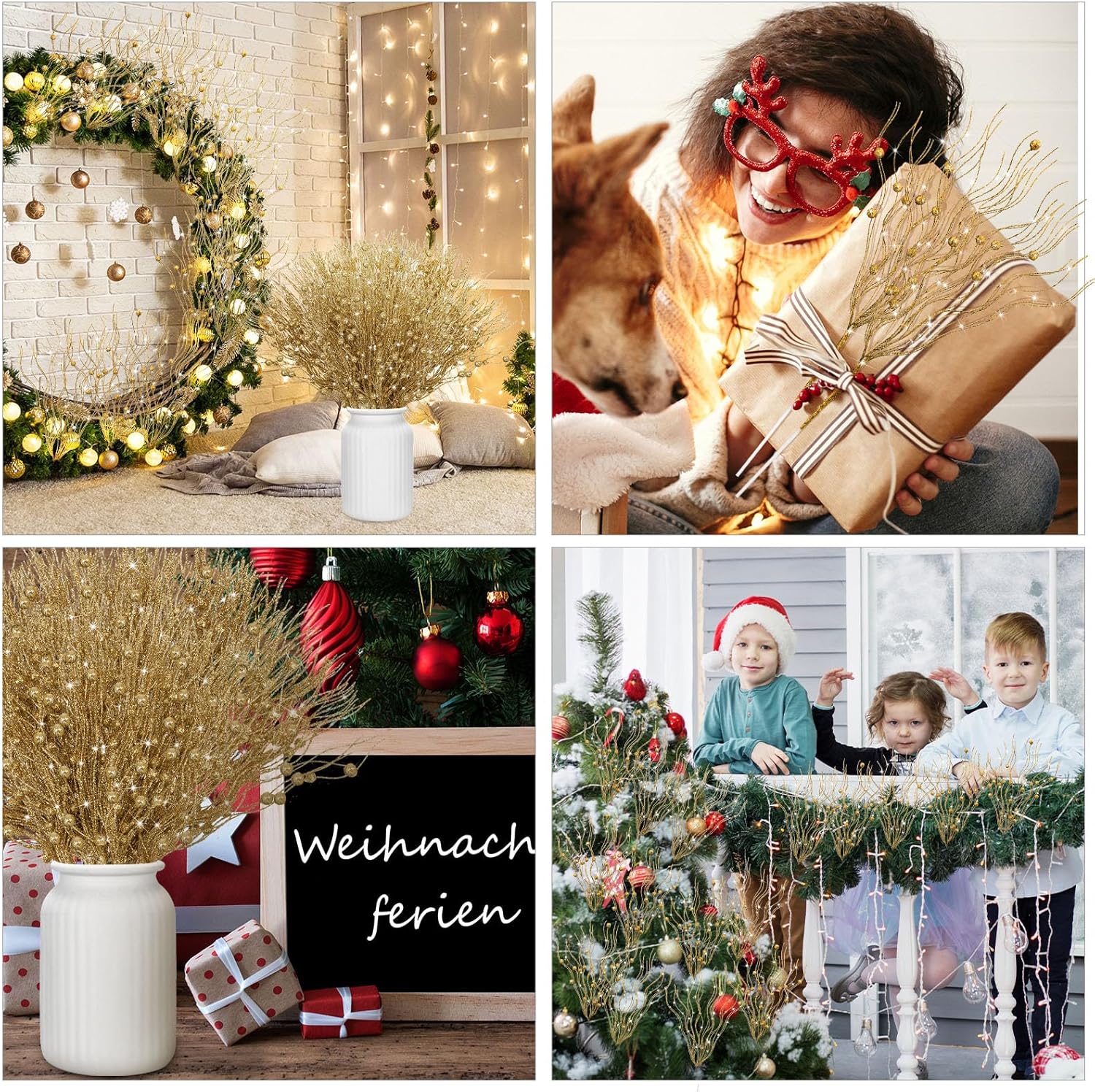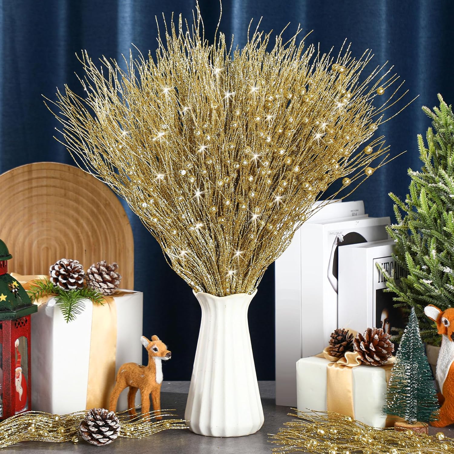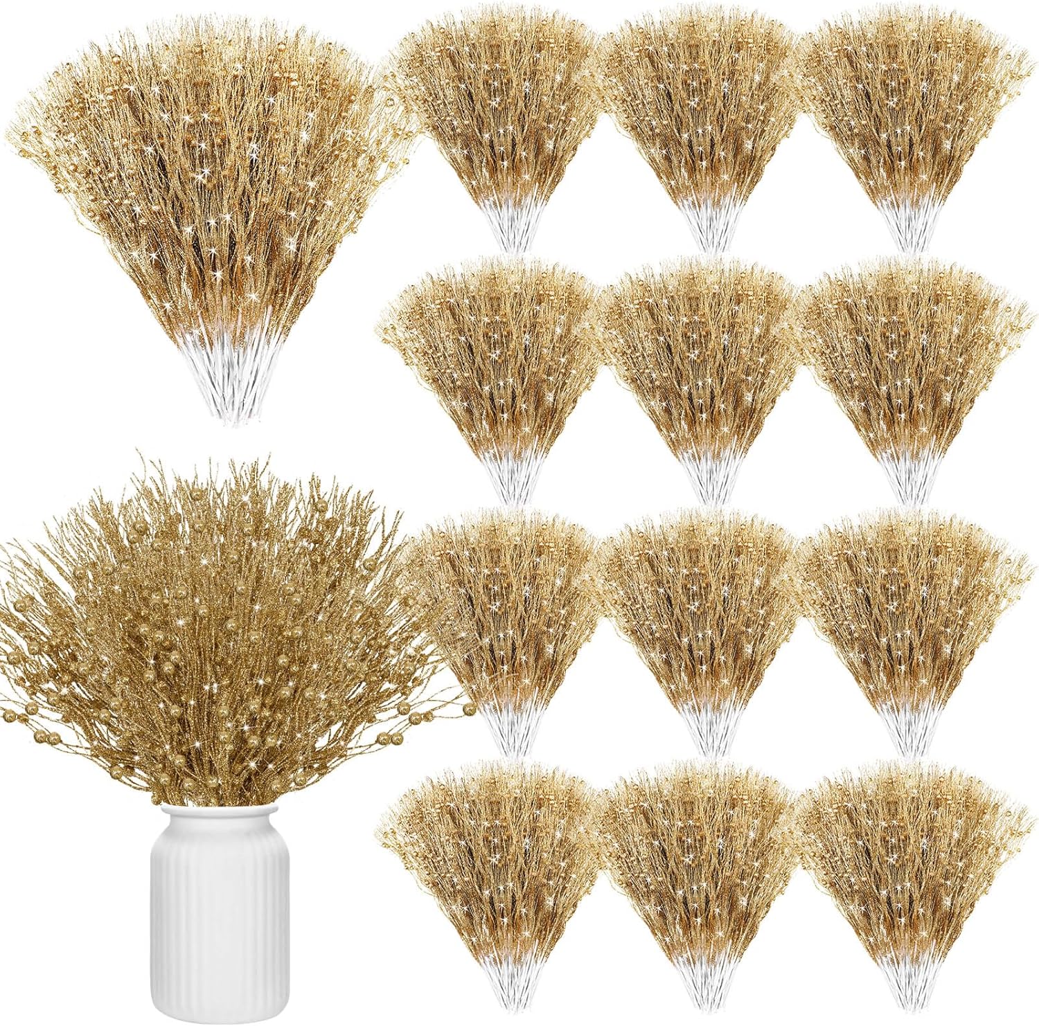 Tigeen 60 Pcs Christmas Artificial Glitter Berry Stem Decoration Bead Stick Pick 17 Inch Glittery Twig Branches for Xmas Tree Small Vase DIY Craft Wreath Home Decor Party Ornament(Gold)