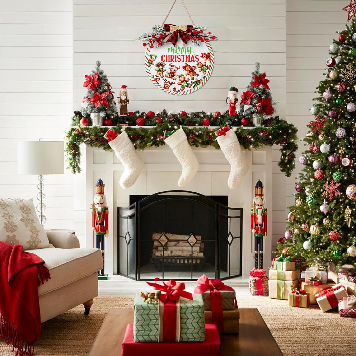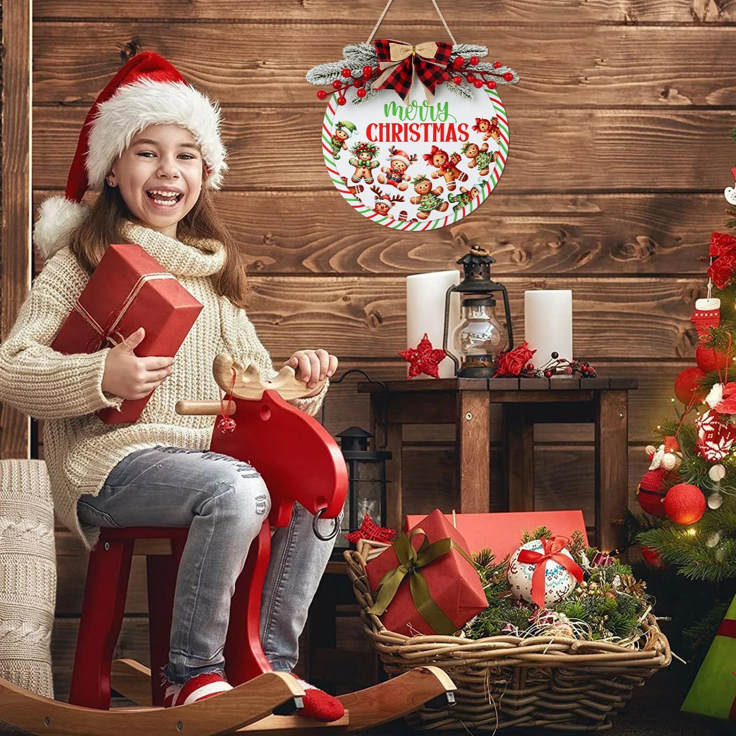 TOARTi Merry Christmas Sign for Front Door Decor Merry Christmas Wooden Door Sign for Xmas Christmas Gingerbread Sign Wooden Wreath Wall Hanging with Plaid Bow Red Berry