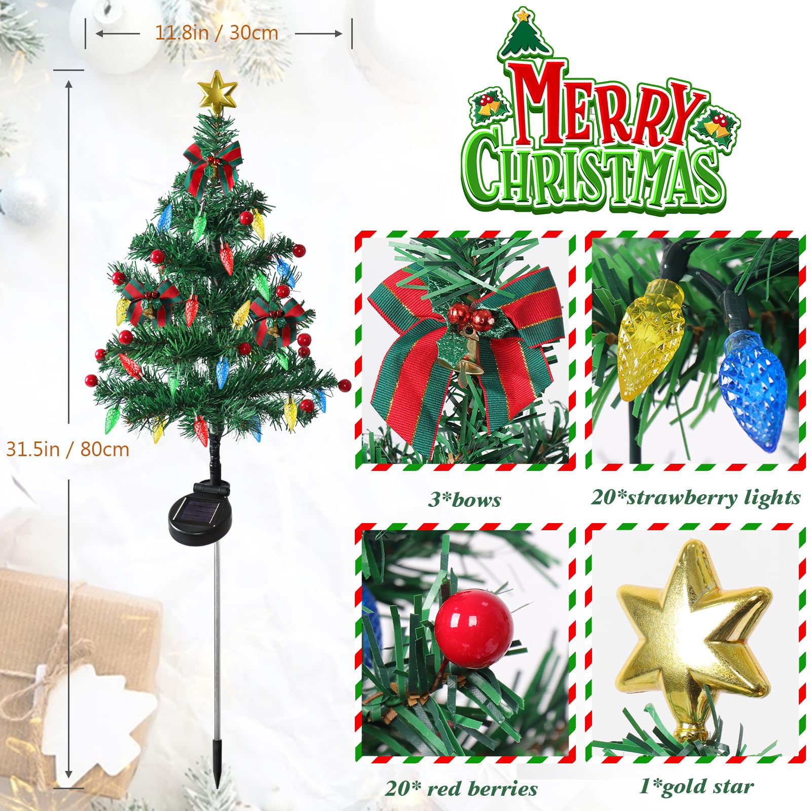 【4-In-1 Solar Christmas Tree Lights】--4 Packs Christmas tree stake lights,each Christmas tree is 83cm/32inches high,prelit Christmas trees with a solar panel,each Xmas tree comes with sturdy stakes,20 leds C6 multi-color strawberry lights,and 1 gold star treetop,3 festive boxes,3 bells,80 vibrant red balls,bright and eye-catching colors, bring a festive atmosphere,perfect for outdoor Christmas decoration. 【Natural and Realistic Christmas Tree】--Set of 4 lighted Christmas trees, looking natural and realistic, they have a festive appearance during the day and a colorful touch at night. Completely fluffy branches provide a natural look that makes your Christmas tree resemble a real pine, making a striking Christmas tree that lights up your path or front yard lawn.