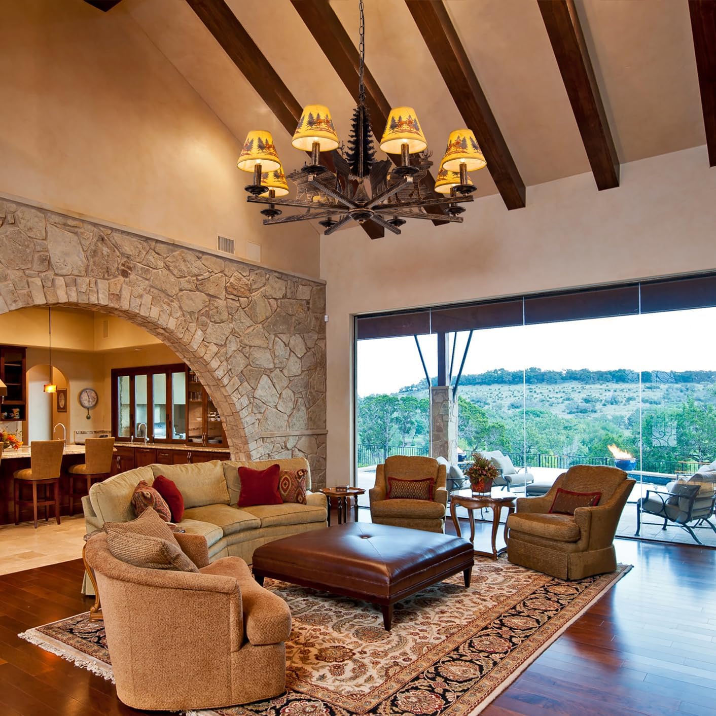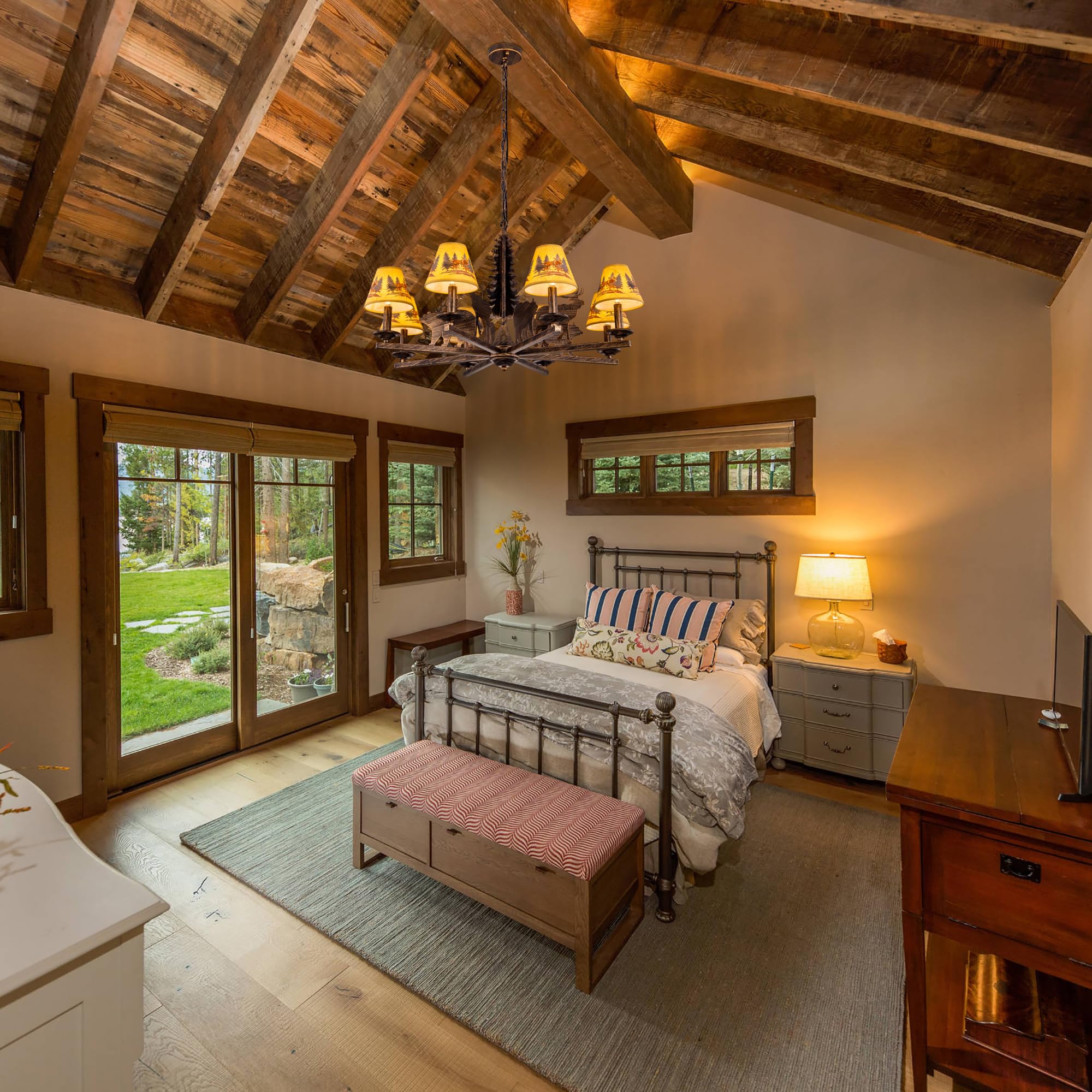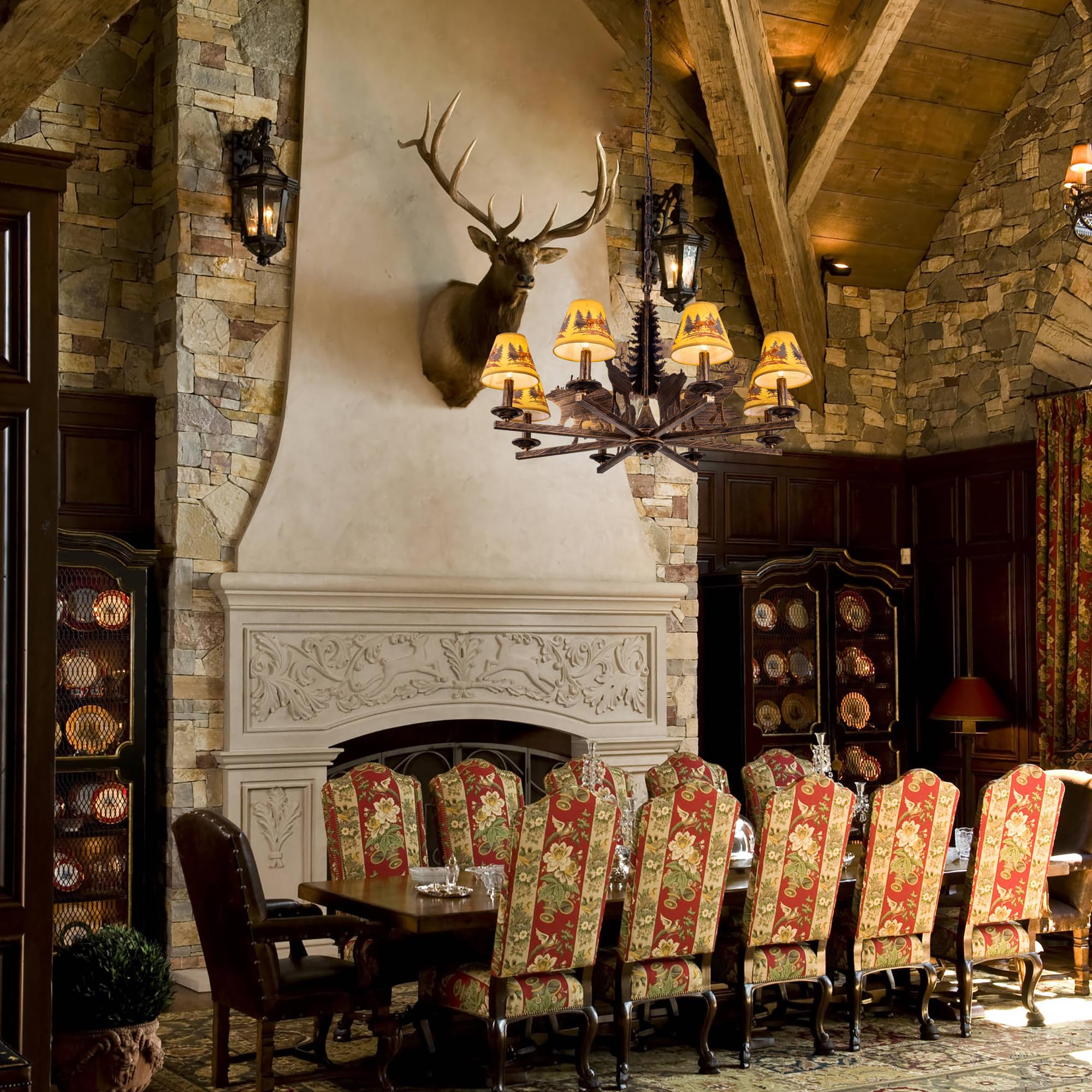Farmhouse Chandelier: The western chandelier is accented by a large pine tree in the center, features bold wildlife metal decor and amber lampshade with deer forest patterned, would look great in a rustic or southwestern scenes Suitable Place: The vintage chandelier inspired by natural elements, bringing a touch of rustic charm to cabin, log home, bedroom, living room, dining table, kitchen island, hallway, cafe, bar, stair, foyer
