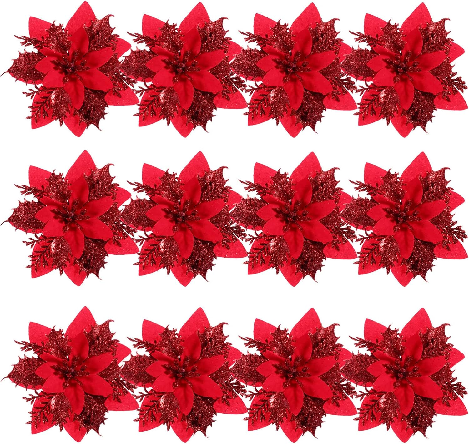 • Christmas Poinsettia Flowers measure about 5. 9inch in diameter, color, added with glitter powders, sparkly and gorgeous. Can be used to decorate anywhere as you. Such as your Christmas tree, Christmas wreath, Christmas , wall, fireplace, bedroom, living room and more.