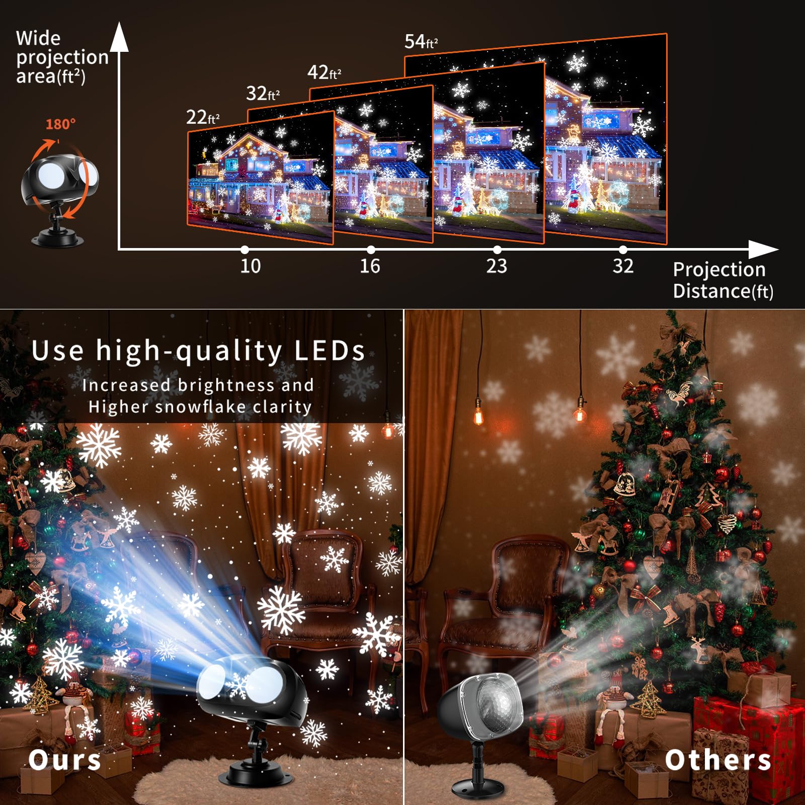 Trakxy christmas projector lights features eye-catching fairy rotating white snowflakes animation. Built in 8000-15000K LED which is much more steady and brighter than other projection light. The long-range projection remains stable and clear. With 180°adjustable projector head, displays the snowflake that cover 22- 54sq from a distance of 3-10M, you can use the christmas snow projector lights in any place and at any angle as you like for better visual experience. Low Power Consumption: 11W/0.64A, with high-quality, eye-protecting led light, you can showcase your home in a vivid Christmas atmosphere while saving greater energy over standard super bright and efficient lights, help you to saves electricity bill and environmentally friendly. The machine has a 6-hour automatic stop function, it will automatically stops for 18 hours after working for 6 hours, and then automatically starts and cycles.