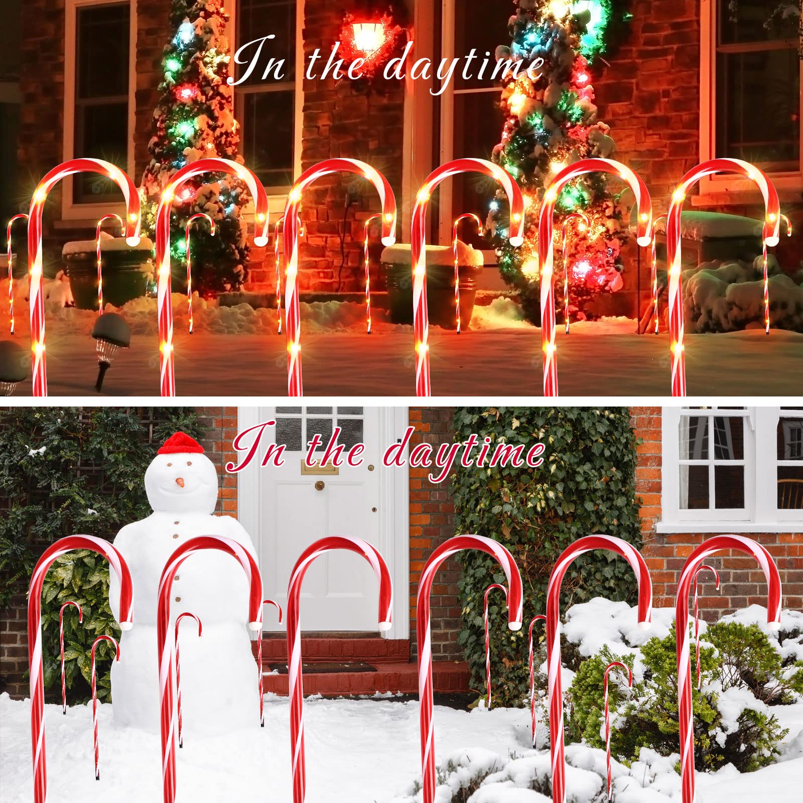 • Easy to Use: the pathway markers lights adopt Christmas cane design to create fantastic scene With fixed and sturdy stake design, the plastic stake allows you to easily place the lights upright in the yard, put the nail in by hand or with a rubber hammer, and then put the cane on the top of the stake to enjoy Christmas with your family