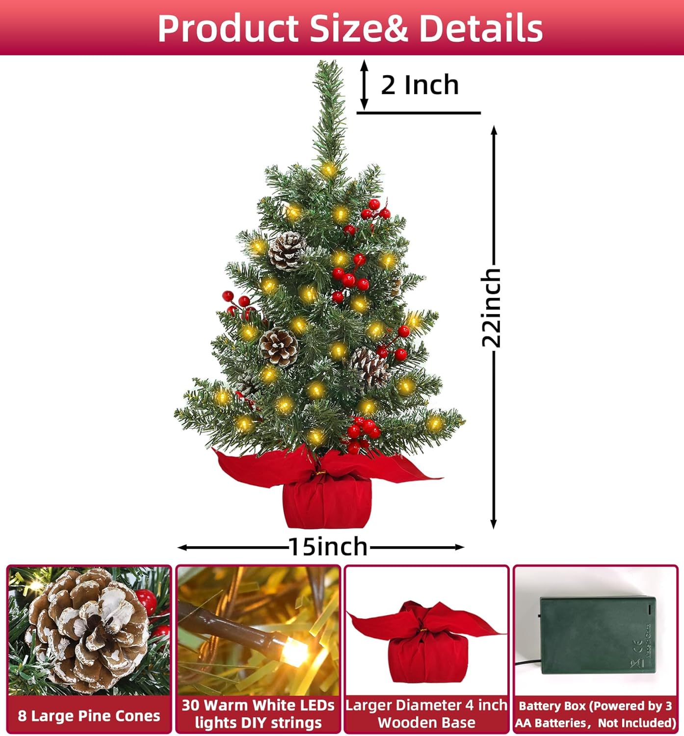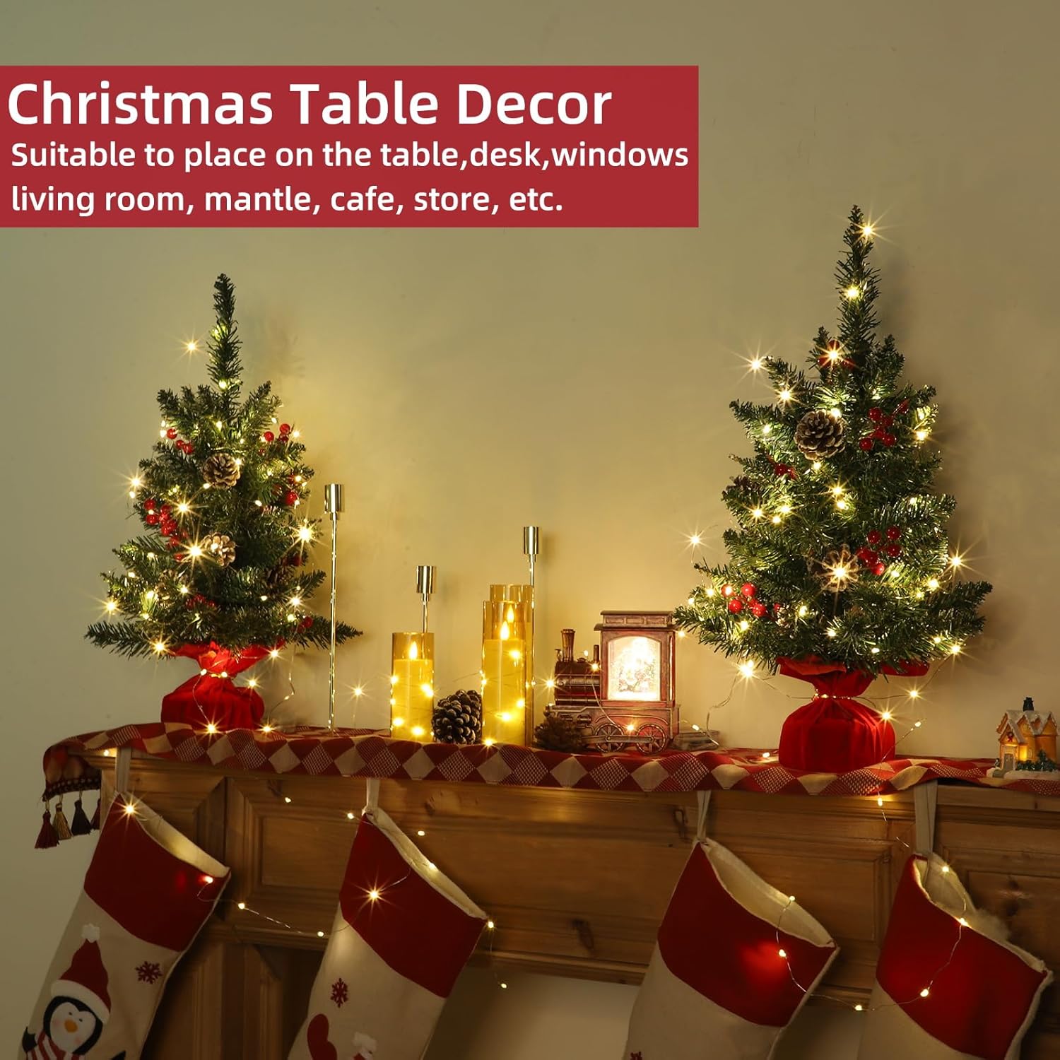 TURNMEON 2 Pack 24 Inch Lighted Small Christmas Trees, Artificial Tabletop Mini Xmas Tree with Timer 30 LED Lights 8 Pine Cones 8 Red Berried and Lifelike Branches for Christmas Holiday Indoor Decor