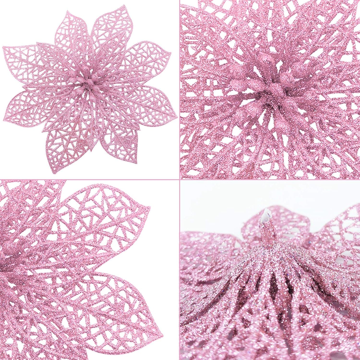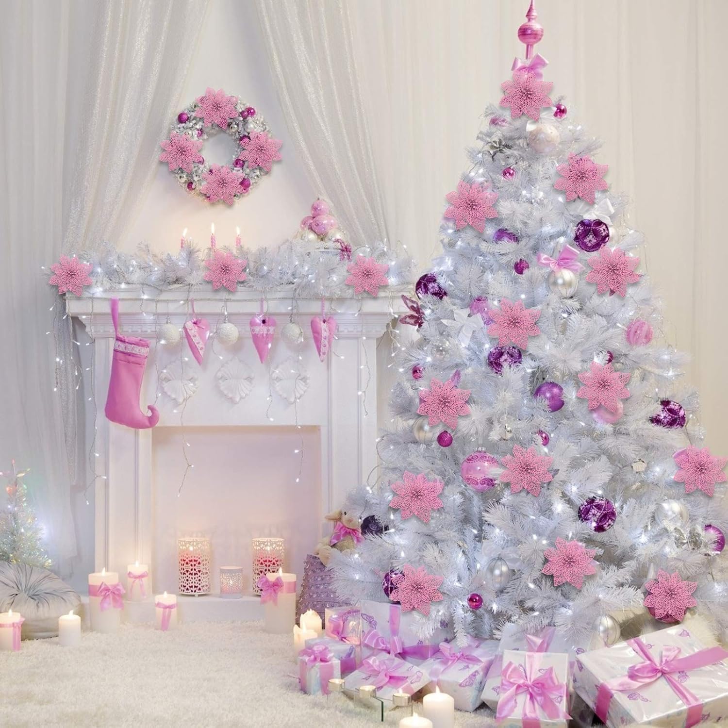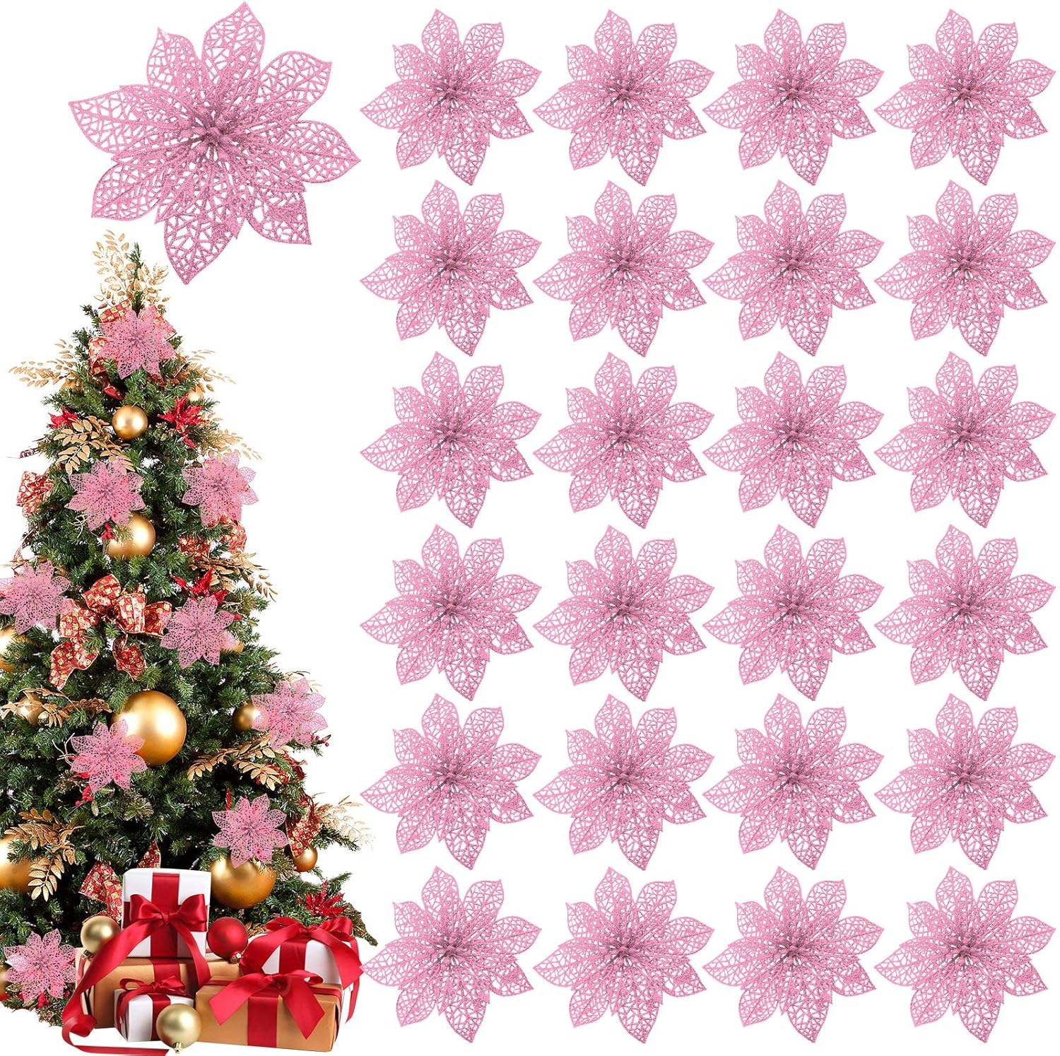TURNMEON 24 Pack 6 Inch Pink Christmas Glitter Poinsettia Artificial Silk Flowers Picks Christmas Tree Ornaments for Pink Christmas Tree Wreaths Garland Holiday Decoration (Pink)