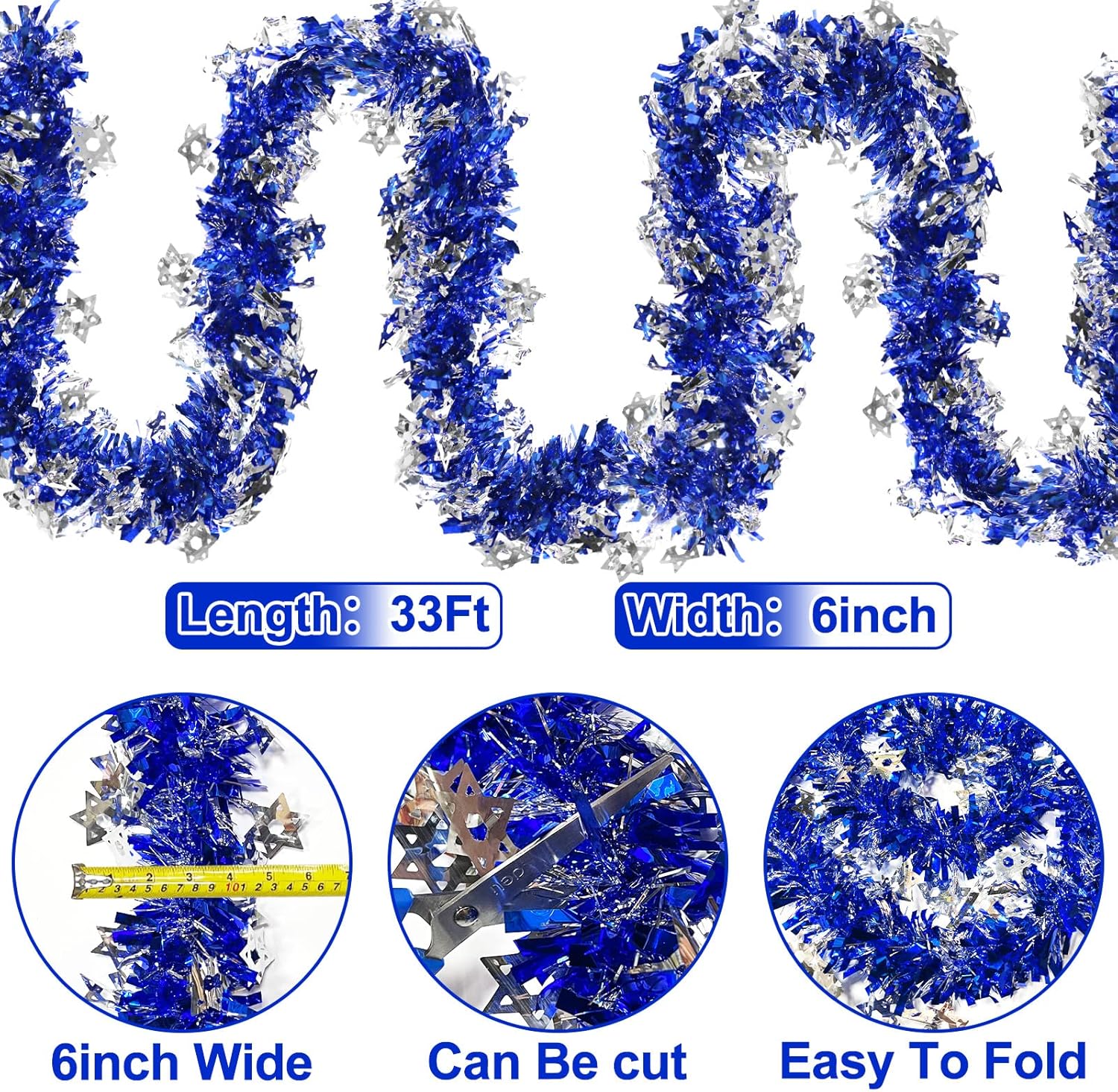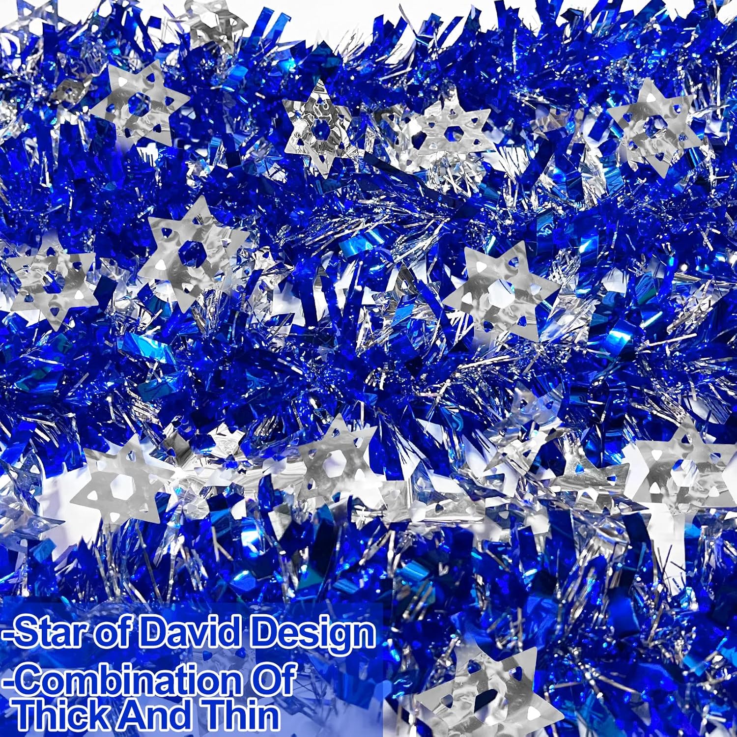 TURNMEON 33 Ft by 6 Inch Hanukkah Tinsel Garland Hanukkah Decorations with Star of David Silver Ornaments Blue Metallic Streamers Hanukkah Decoration Home Indoor Outdoor Chanukah Party Supplies