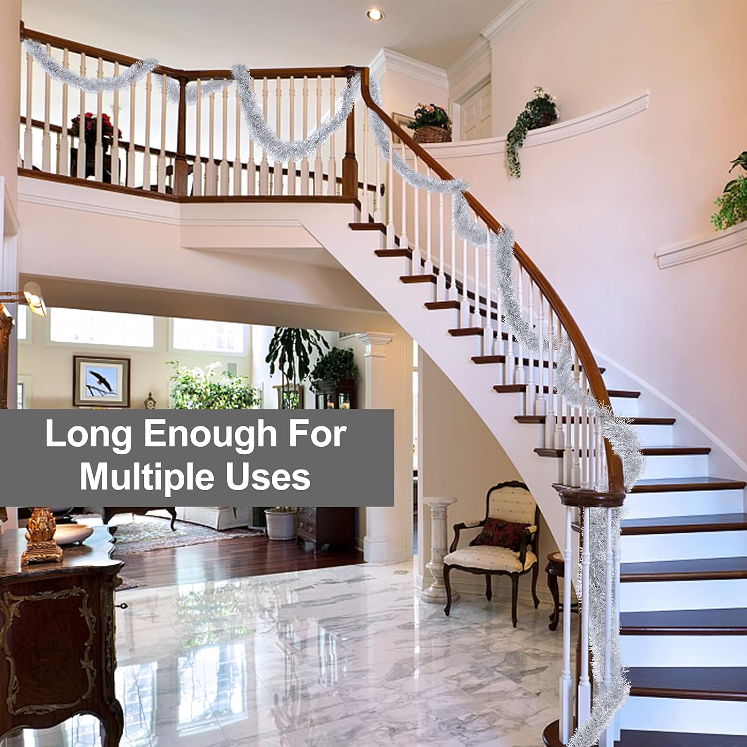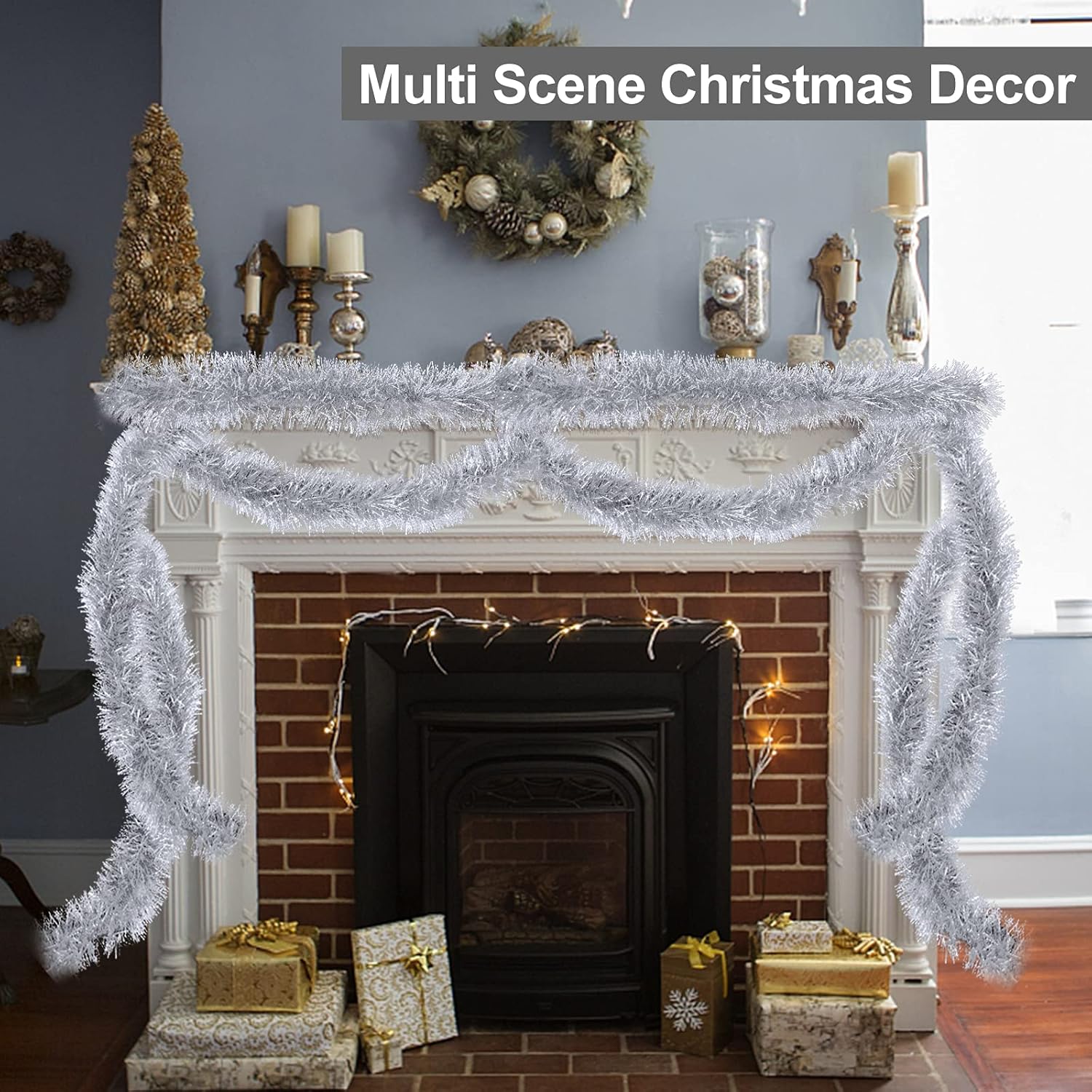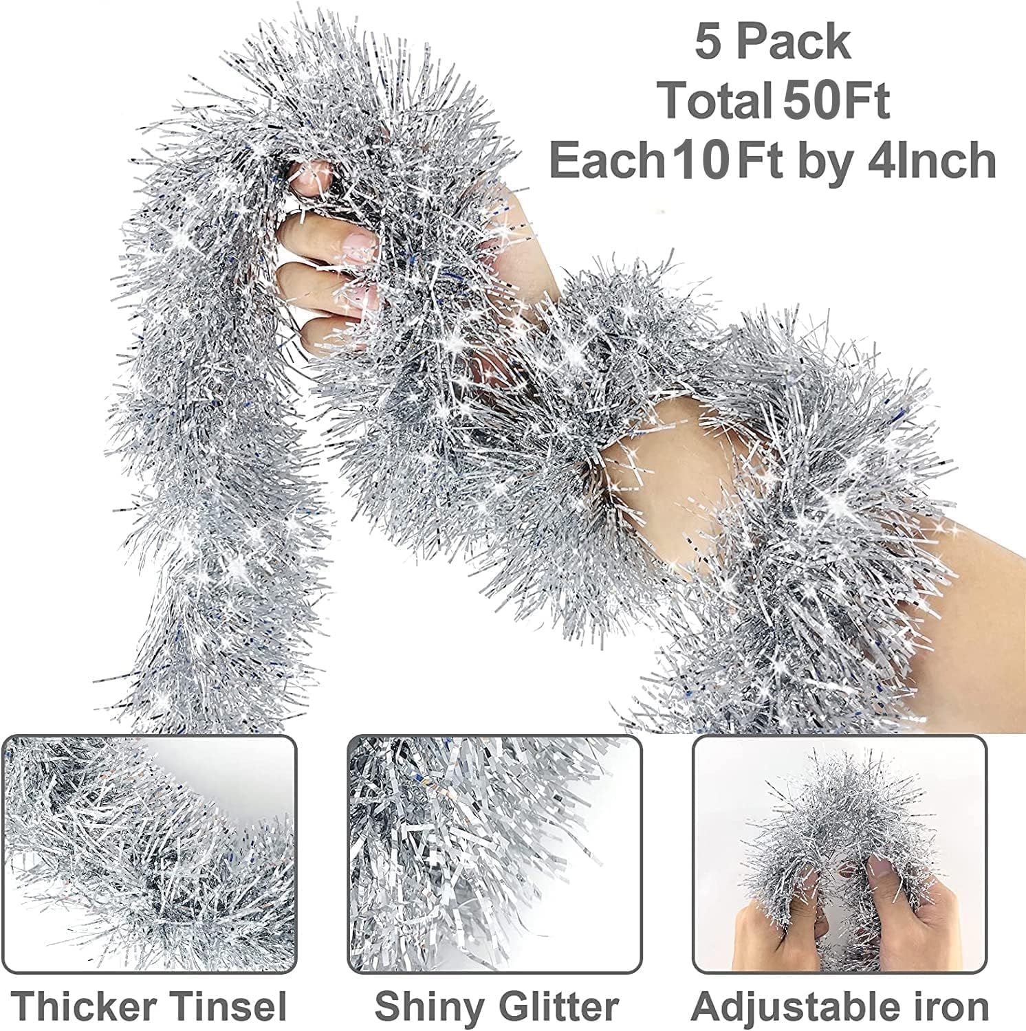 TURNMEON 5 String Total 50 Ft Tinsel Christmas Garlands Decorations White Edge Metallic Streamers Xmas Tree Decorations Indoor Outdoor Home Xmas Party Supplies, Each 10 Ft by 4 Inch(Silver)