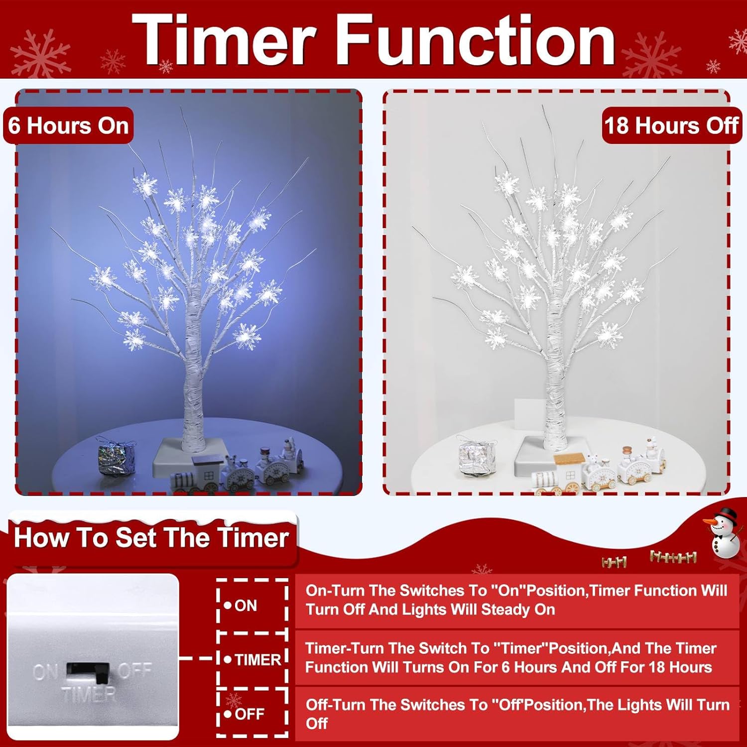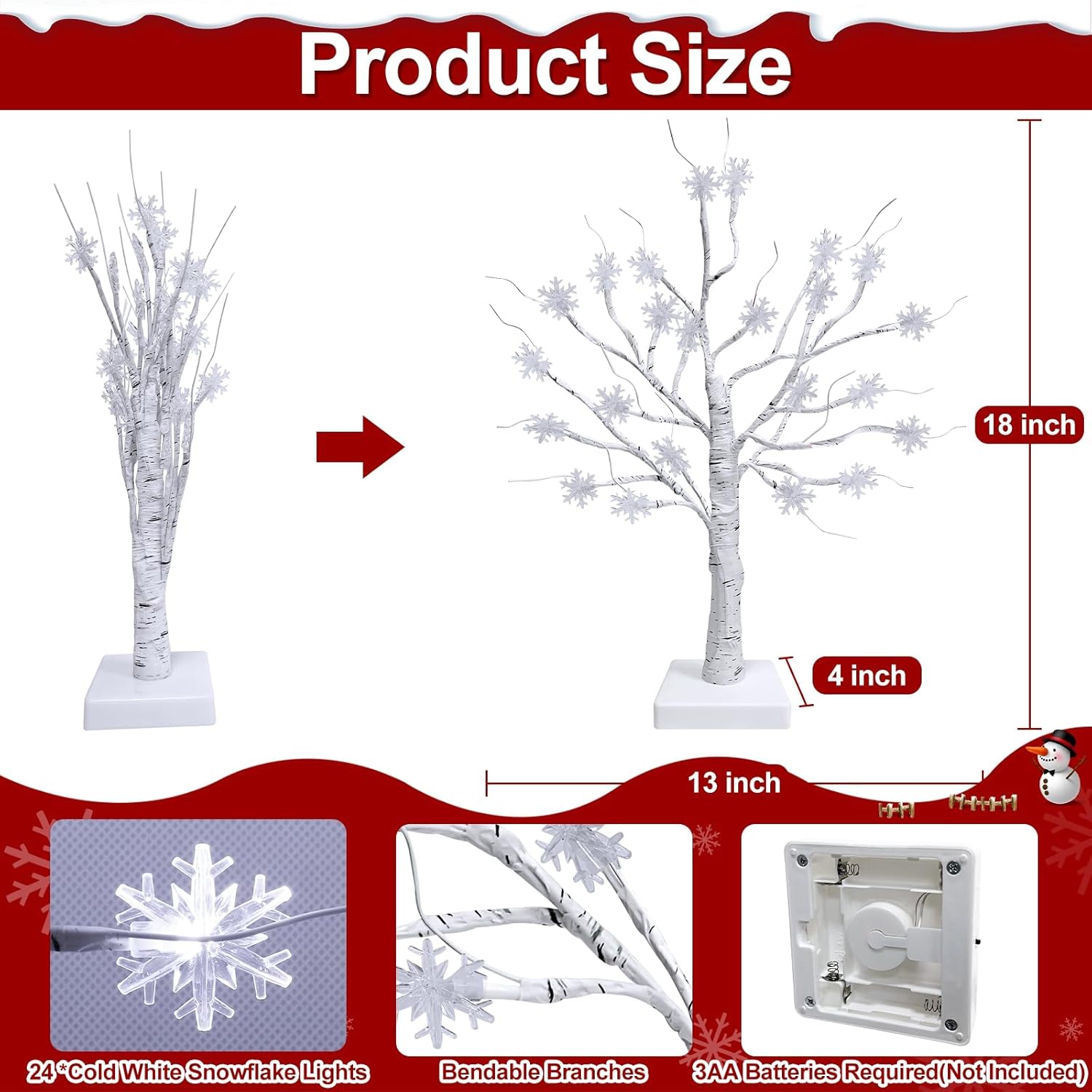 TURNMEON Tabletop Christmas Tree, 2 Pack Lighted Birches Tree Small Christmas Tree, Prelit 48 Snowflake White Lights Timer, Battery Operated Adjustable Branches Xmas Decor Home Indoor Mantel 18 inch