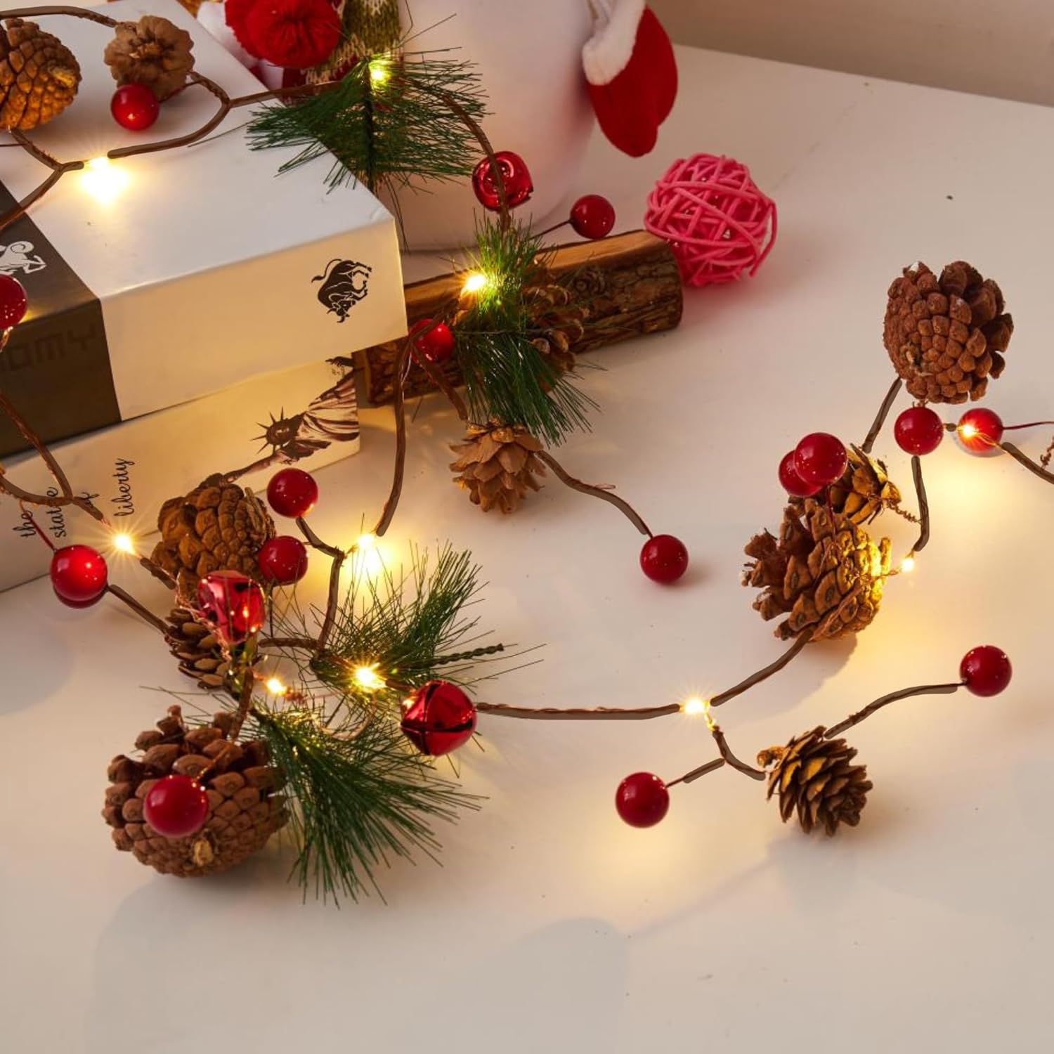 TW SHINE 2 Pack Christmas Pine Cone String Lights, 13 FT 40 LED Total Prelit Battery Operated Garland with Red Berry for Indoor Outdoor Xmas Fireplace Decorations