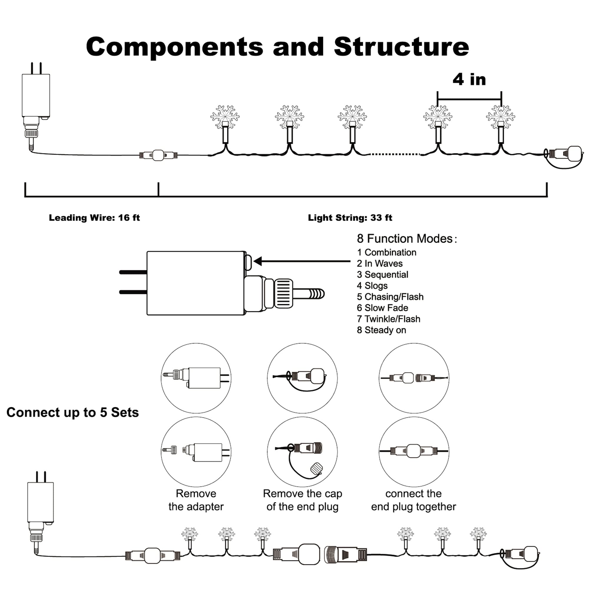 • 8 Modes : 8 Functions to fit different occasions, moods, feelings, holidays, festivals, anniversaries, etc. Satisfied different requirement. (Combination, In waves, Sequential, Slow Glow, Chasing/Flash, Slow fade, Twinkle/Flash, Steady on)