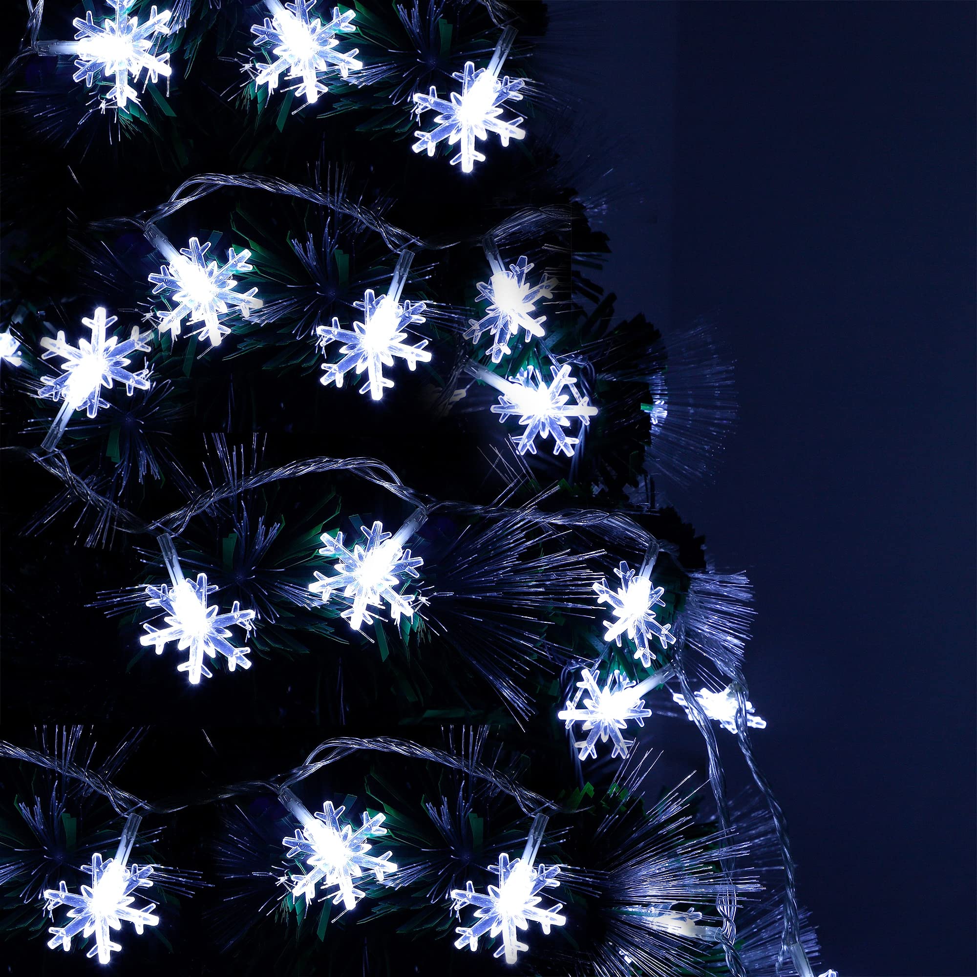 High Quality: 100 LED 49 FT snowflake shaped cool white string lights with solid construction plastic material, adapter powered. 30V low voltage string lights with UL 588 for safety use. Length between lights : 3.9 Inches/ 10cm, power line: 5m/16.5ft. light string: 10m/33ft, length totally: 15m/49ft approx. Extendable: LED Snowflake String Lights with Male and Female Safe Plug, could be extended to a maximum of 10 light chains, from 49.2 ft to 344.5 ft (maximum 1000 LED). Please note that the transformer is IP 44 waterproof, so it can meet normal use outside but not enough to put under water directly.