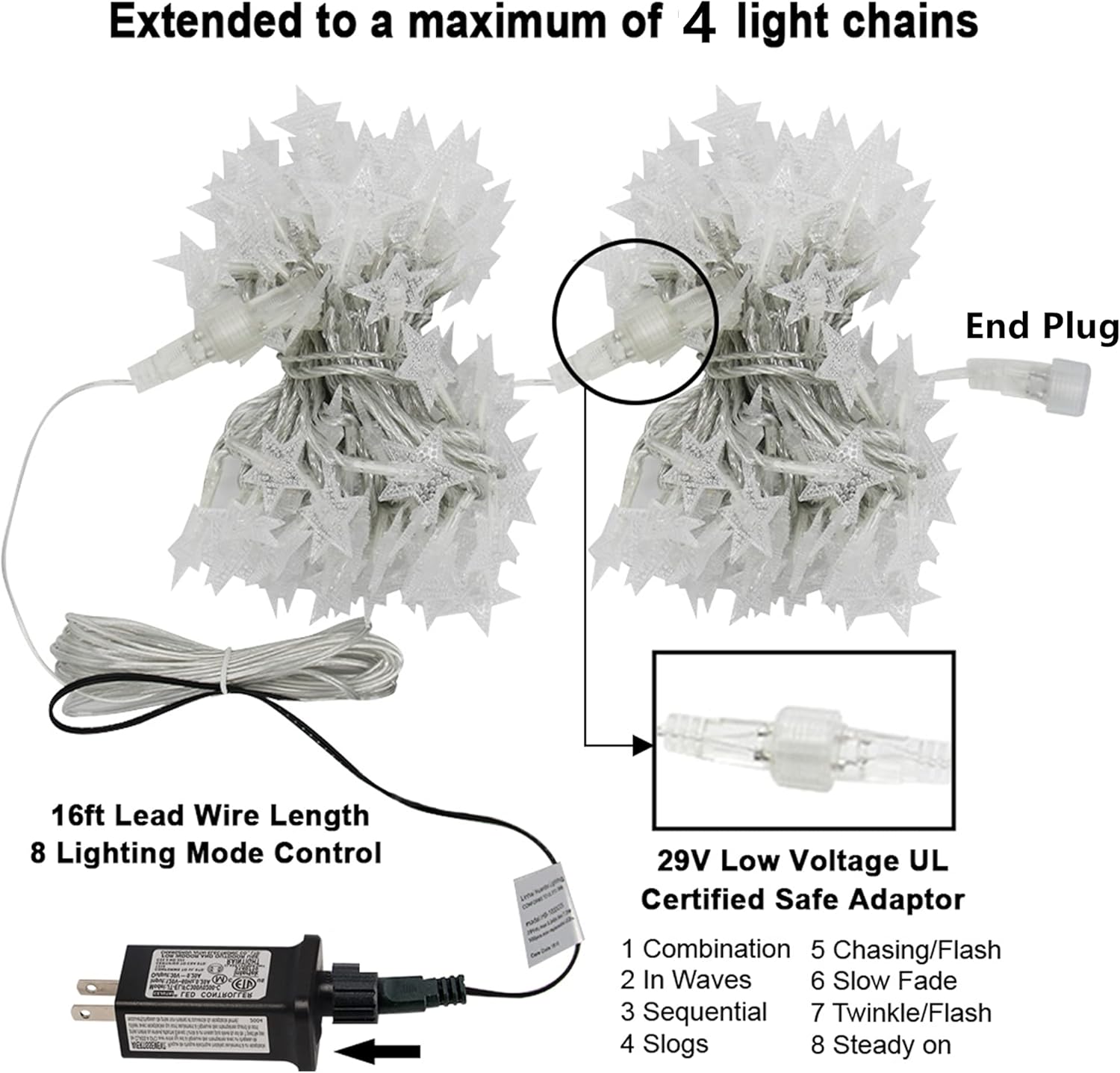 High Quality: 100 LED 49 FT star shaped string lights with solid construction plastic material, adapter powered. 30 V low voltage string lights with UL 588 for safety use. Length between lights : 3.9 Inches/ 10 cm, power line: 5 m/16.5 ft. light string: 10 m/33 ft, length totally: 15 m/49 ft approxExtendable- LED Star String Lights with Male and Female Safe Plug, could be extended to a maximum of 10 light chains, from 49.2 ft to 344.5 ft (maximum 1000 LED). Please note that the transformer is IP 44 waterproof, so it can meet normal use outside but not enough to put under water directly