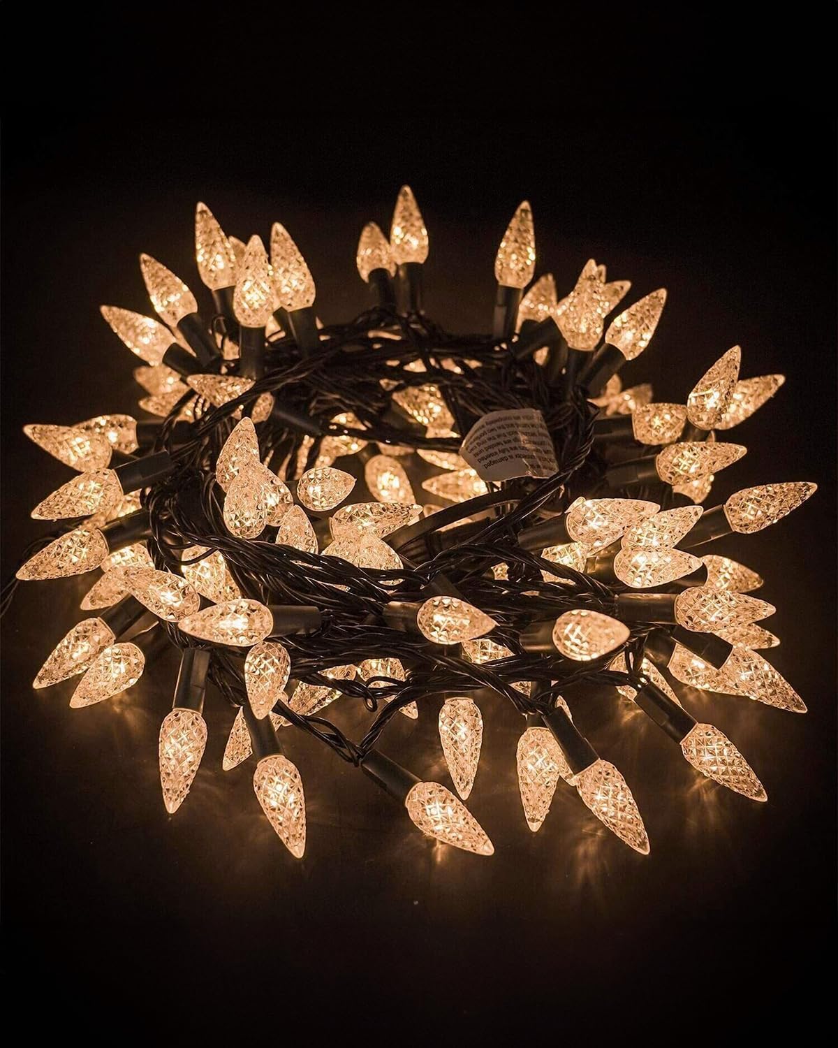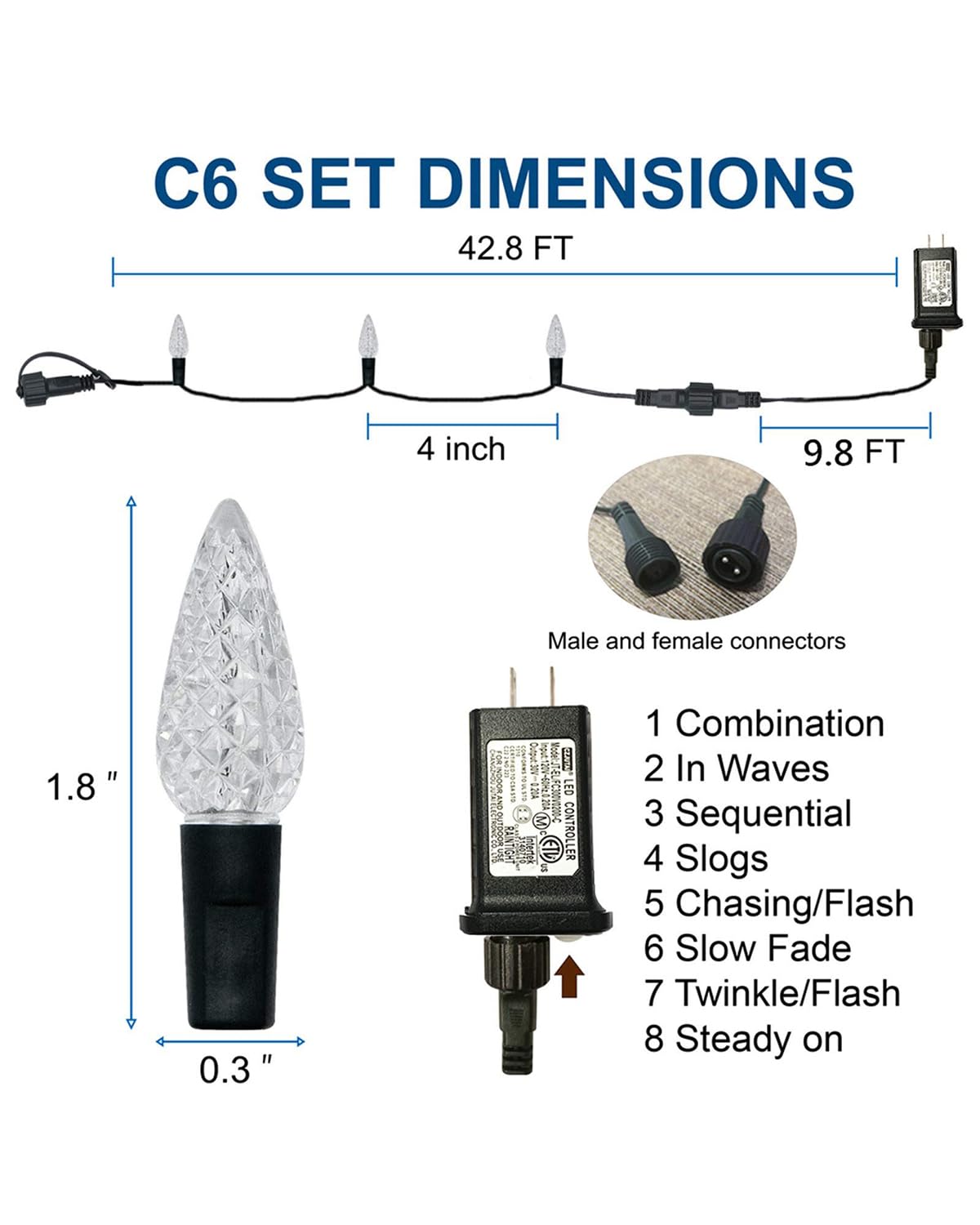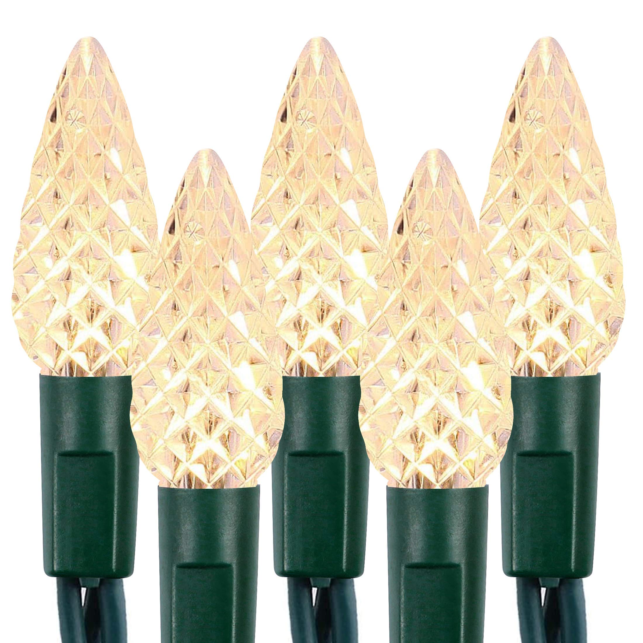 【C6 Christmas String Lights】Made easy and light up your holidays with Twinkle Star 100 warm white LED C6 Christmas strawberry string lights. These lights are sure to bring brightness and adds a pleasure festive atmosphere to your home. The set comes with a super long 9.8 ft leading wire for convenient use. The length of the lights string is 33ft, resulting in a total length of 42.8ft. 【8 Lighting Modes】 8 lighting functions to fit different occasions, moods, feelings, holidays, festivals, anniversaries, etc. (Combination, In waves, Sequential, Slow Glow, Chasing/Flash, Slow fade, Twinkle/Flash, Steady on). Adjust the lighting modes by pressing the round button on the transformer.