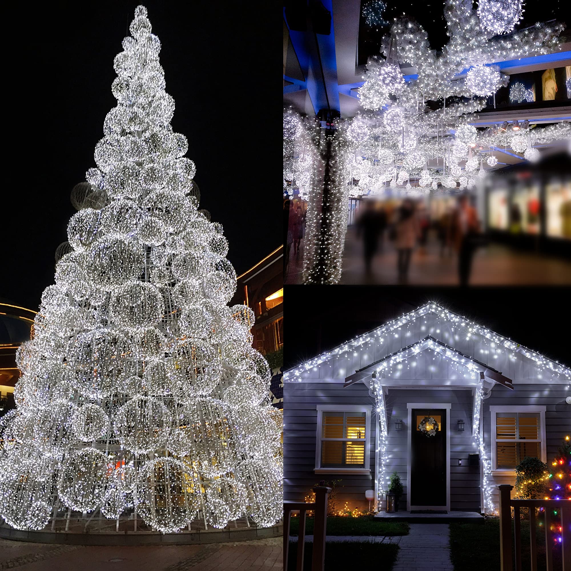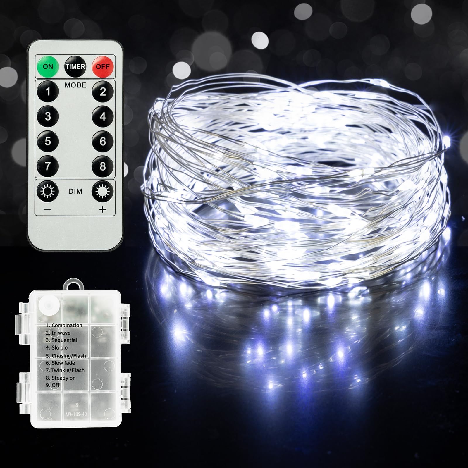 Christmas Decoration white silver wire string lights, with waterproof battery box and remote control. Each 33ft 100 led string lights glow a white light, which make every night starry nights, adding some whimsical ambiance. High quality bendable copper wire, you can build the shapes you want easily. 8 Modes Settings: combination, in waves, sequential, slogs, chasing/flash, slow fade, twinkle/flash, and steady on, creates a starry night and festive ambiance to your family and your friends.