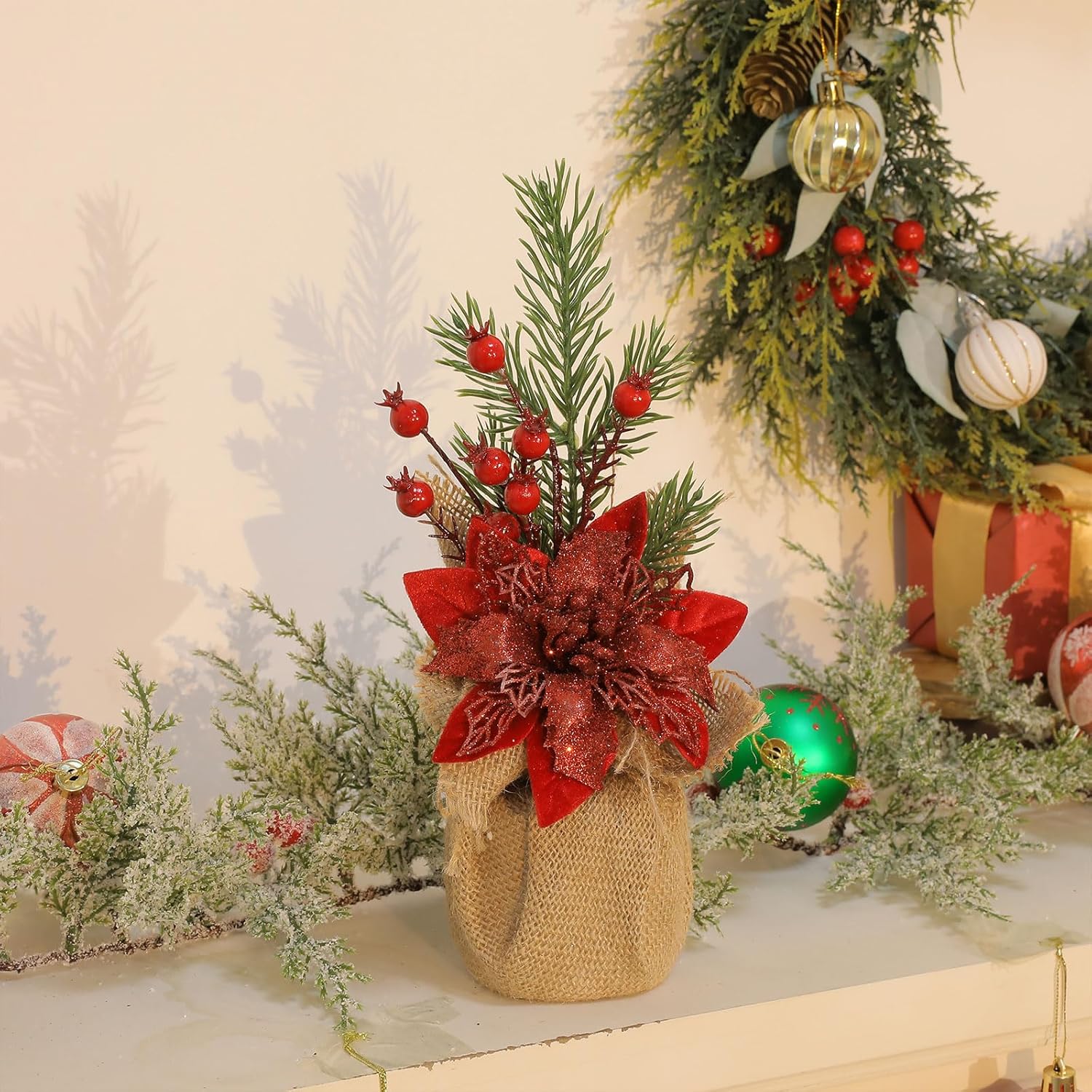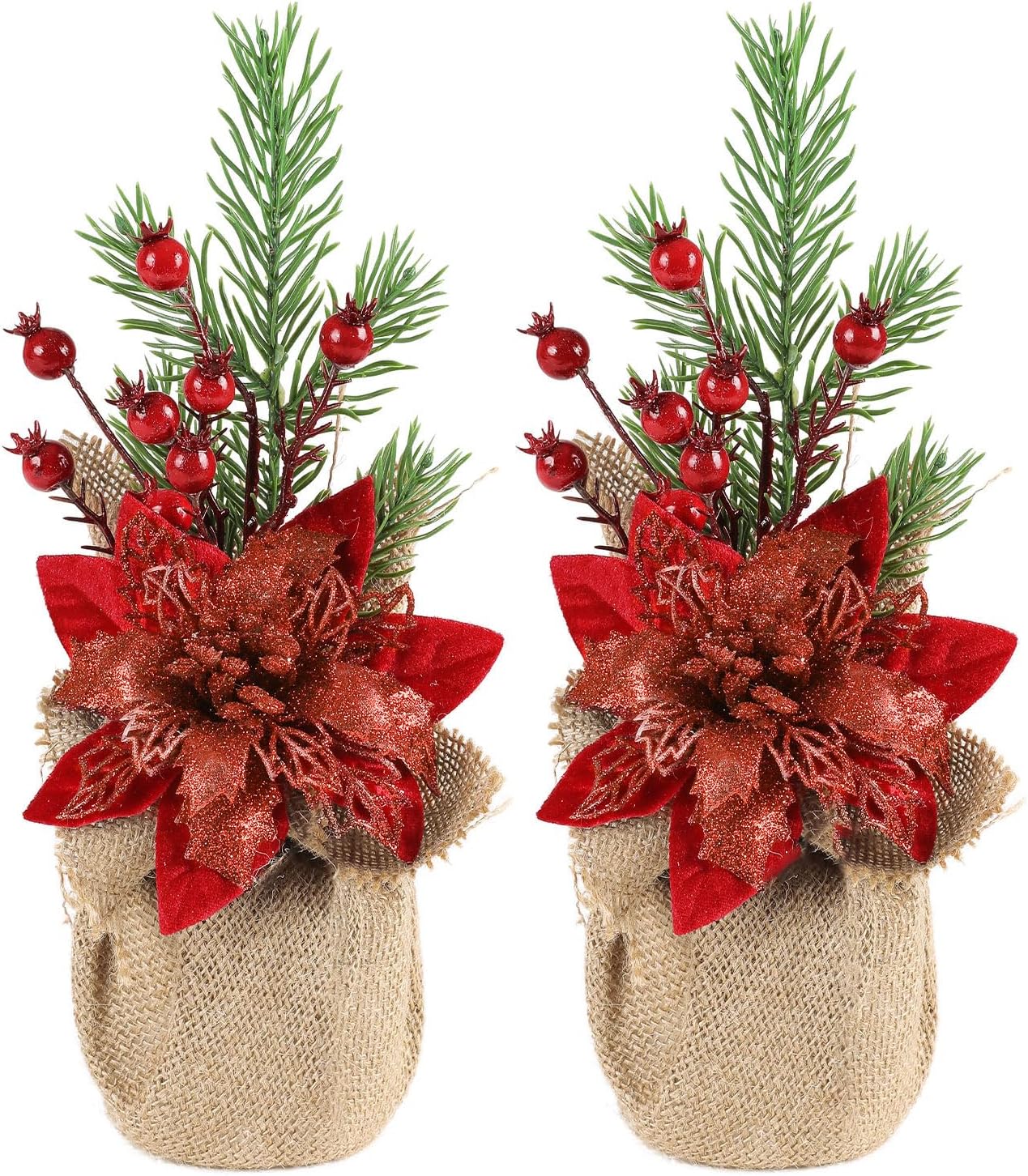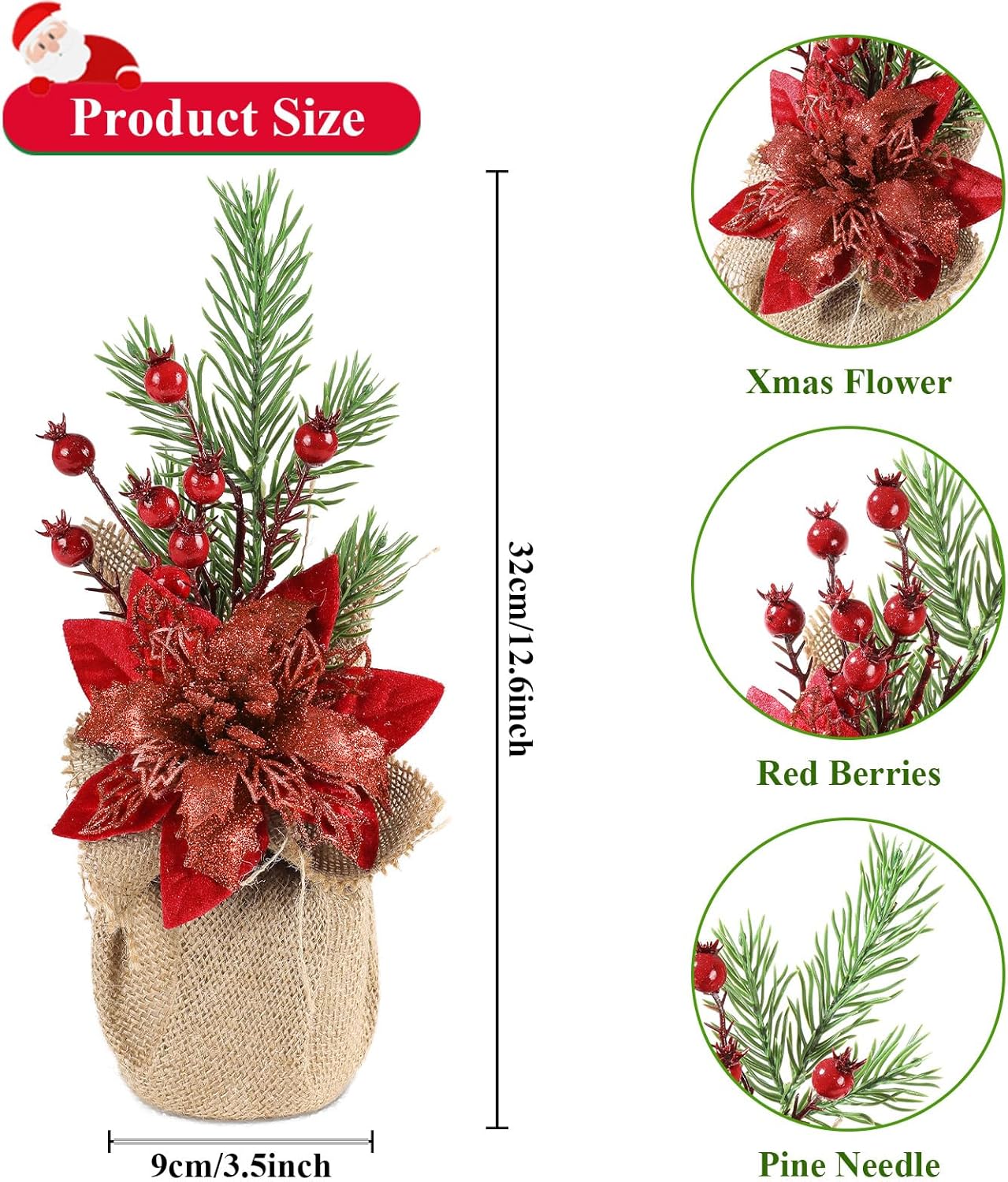 U'Artlines 2Pcs Artificial Christmas Tabletop Decorations, 12.6 Inch Mini Artificial Christmas Tree with Poinsettia Flower Red Berry Pine Branch for Home Table Xmas Party Decoration