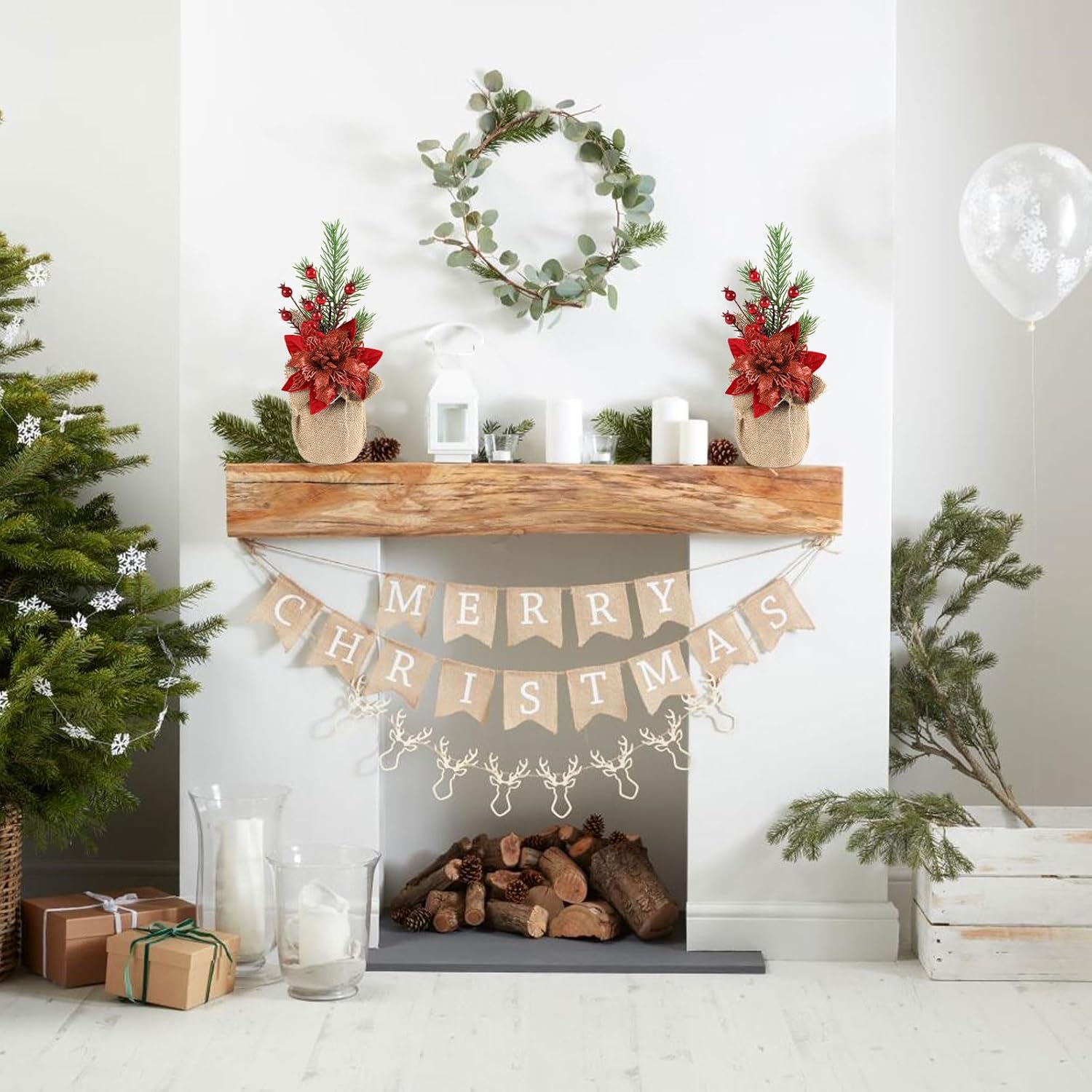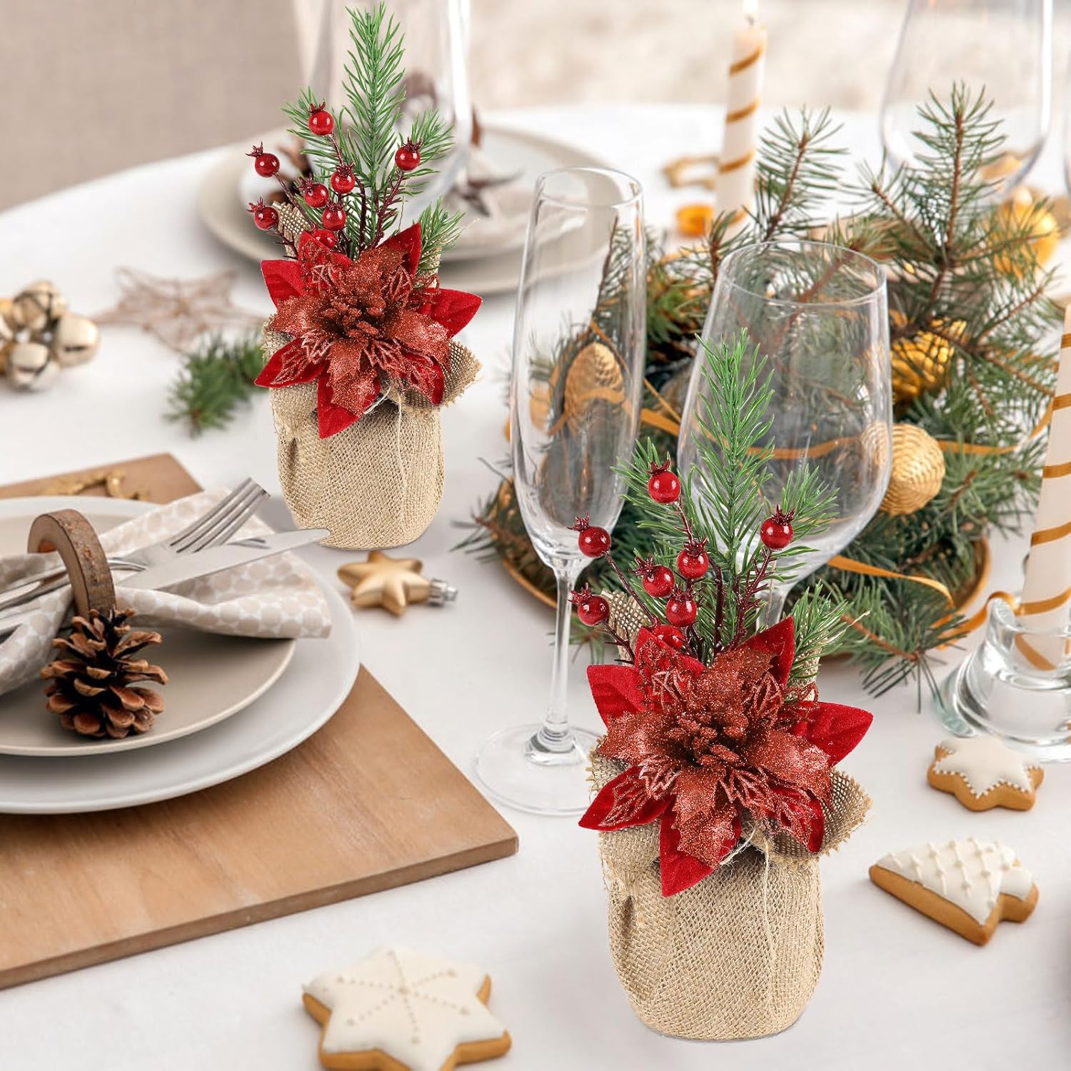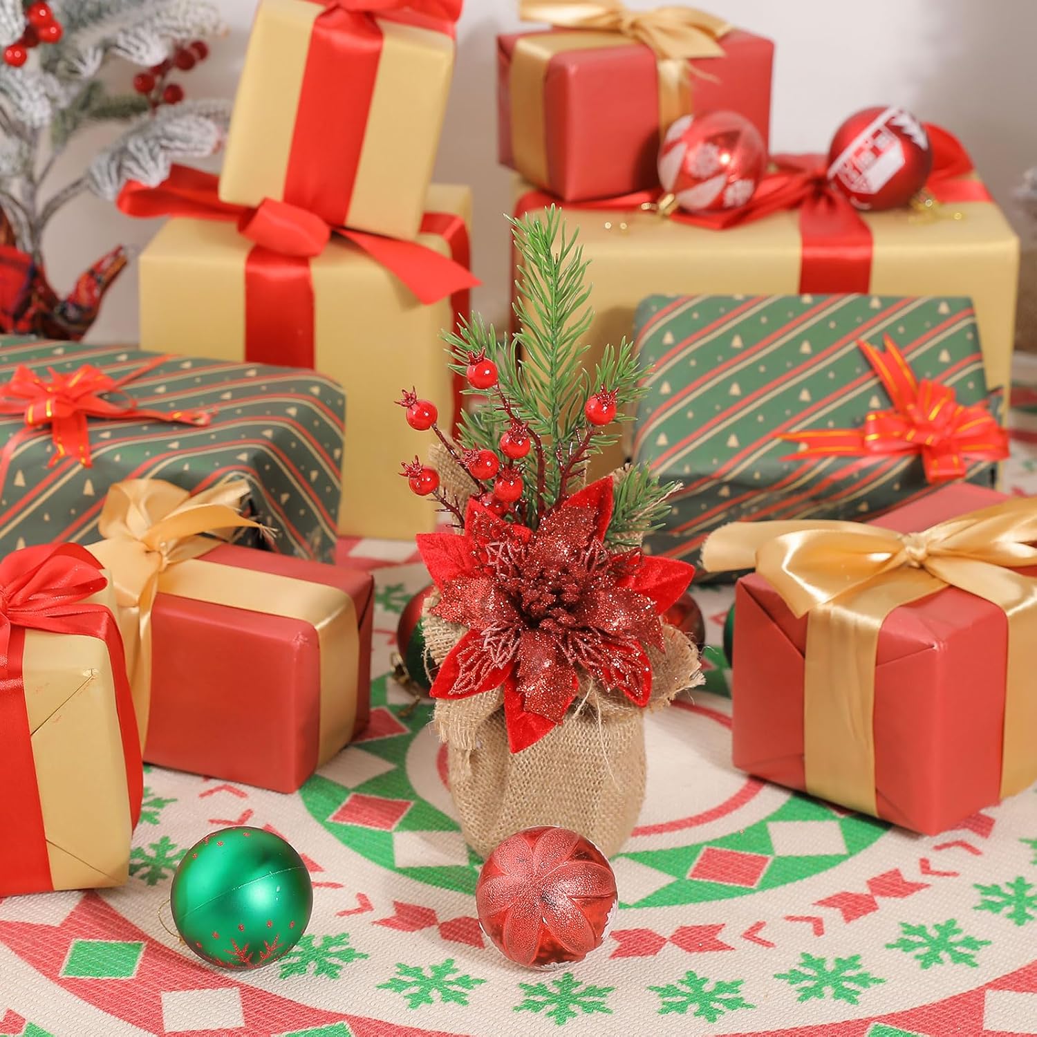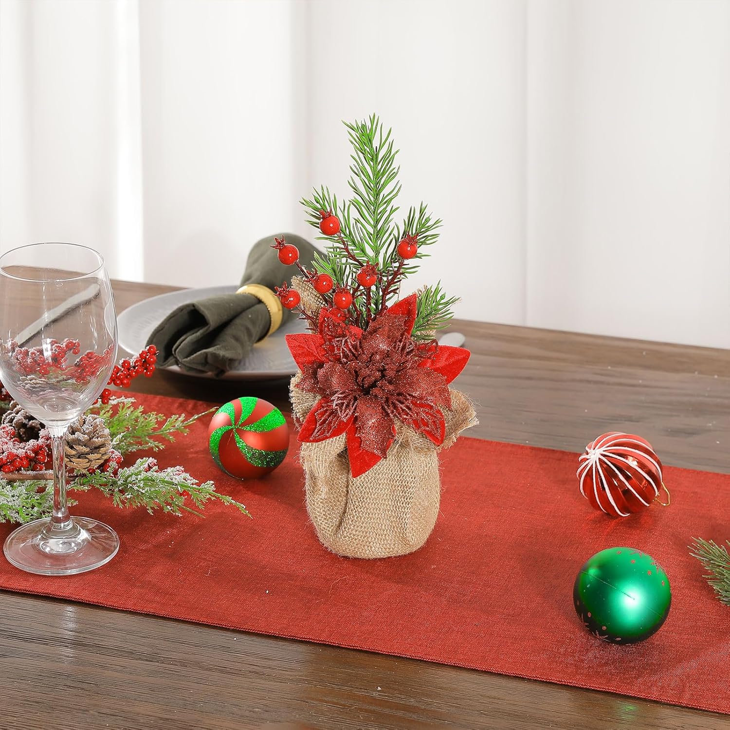 U'Artlines 2Pcs Artificial Christmas Tabletop Decorations, 12.6 Inch Mini Artificial Christmas Tree with Poinsettia Flower Red Berry Pine Branch for Home Table Xmas Party Decoration