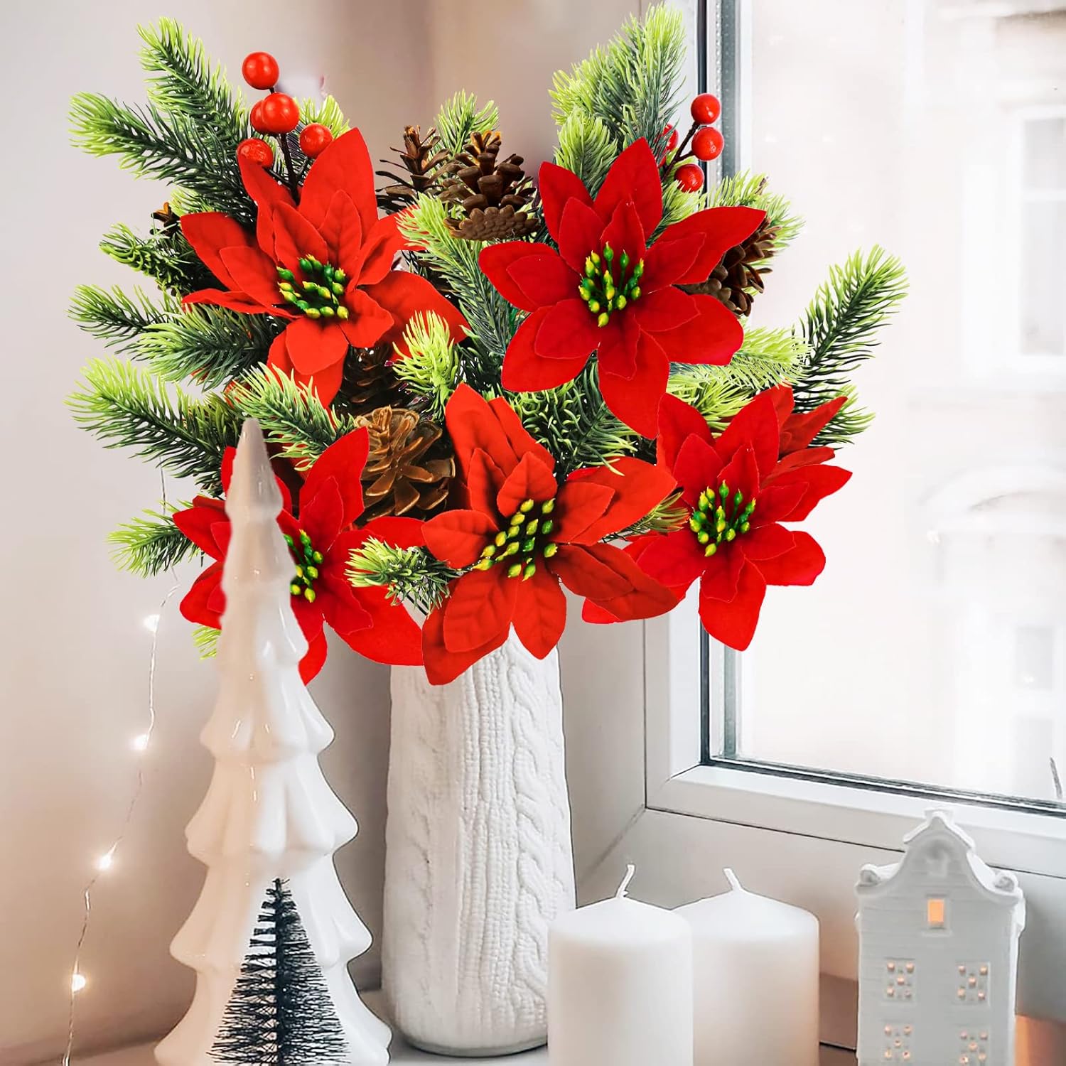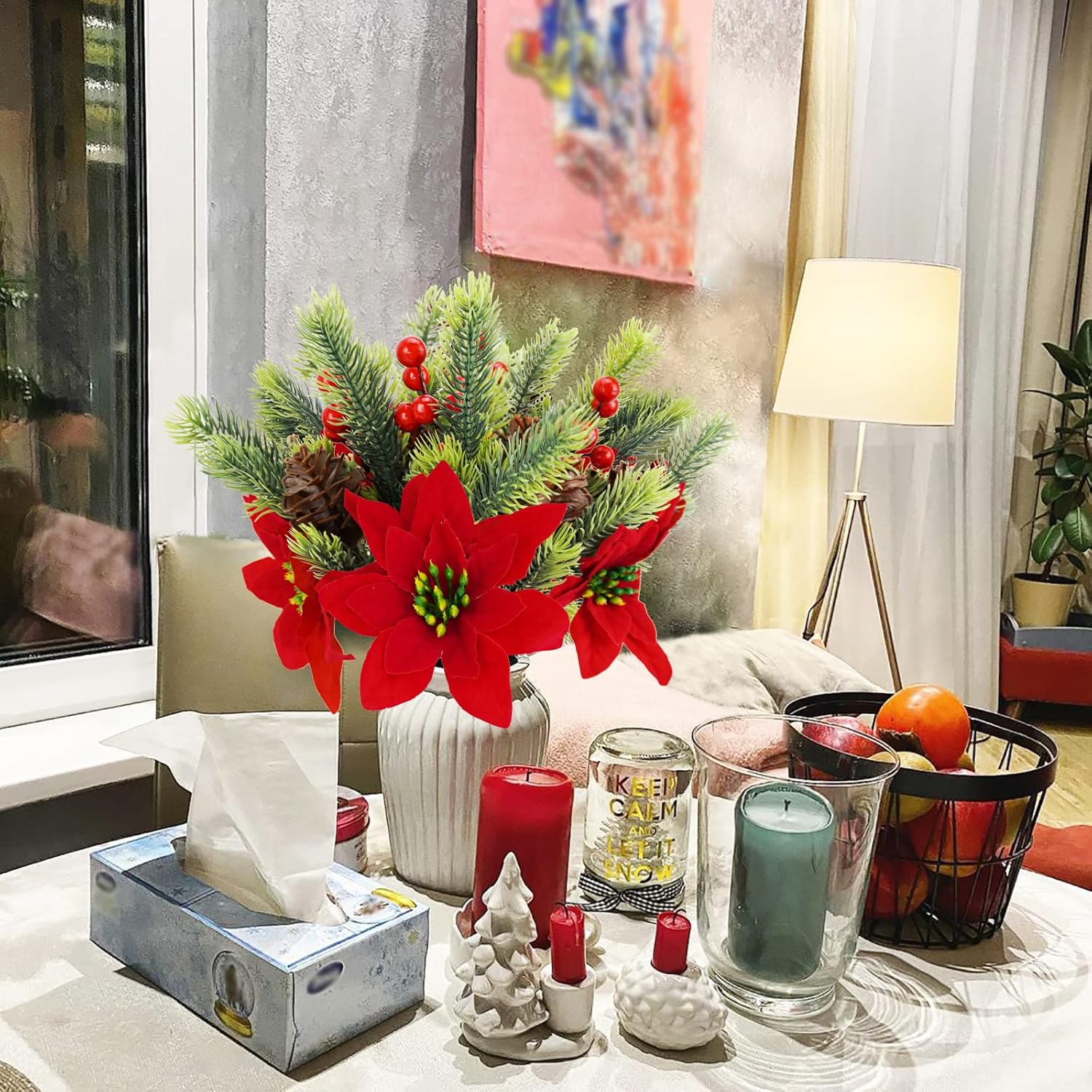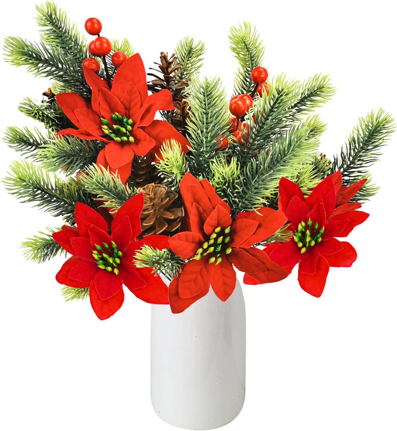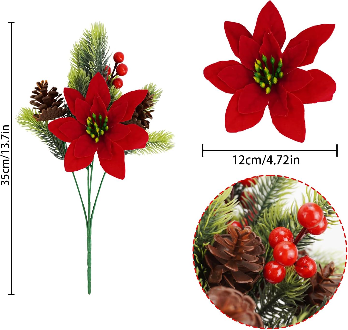 Uieke 4 PCS Artificial Christmas Picks Pine Branches with Red Berry Stems, 13.6'' Poinsettia Christmas Tree Picks Faux Evergreen Sprigs for Home DIY Wreath Craft Winter Festive Decor
