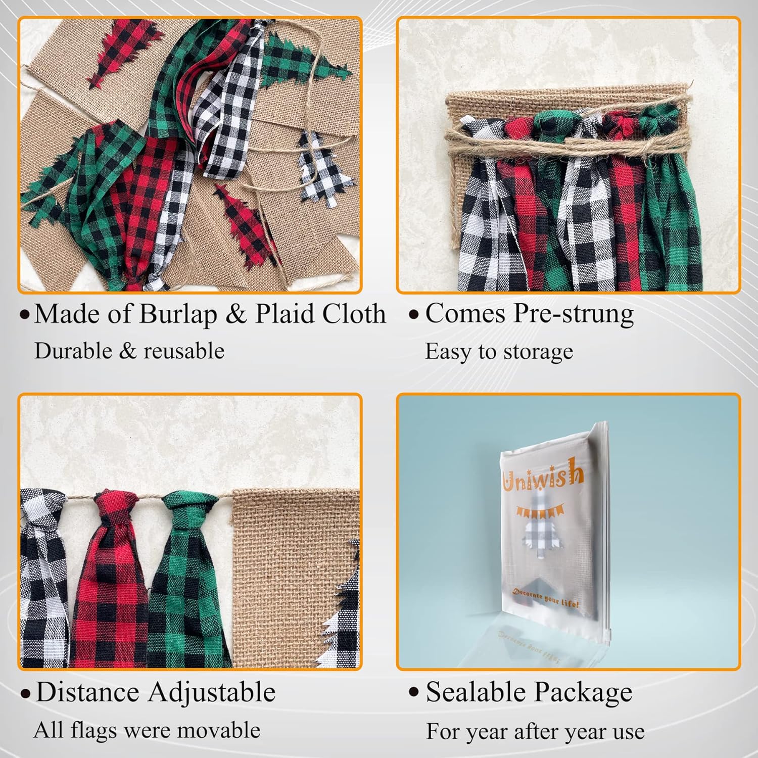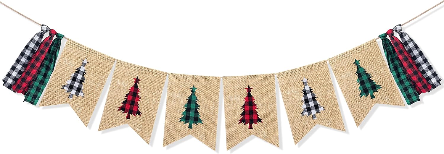 Uniwish Buffalo Plaid Christmas Tree Banner Garland Christmas Decorations for Mantel Fireplace White Red Green Christmas Gingham Tassel Hanging Bunting