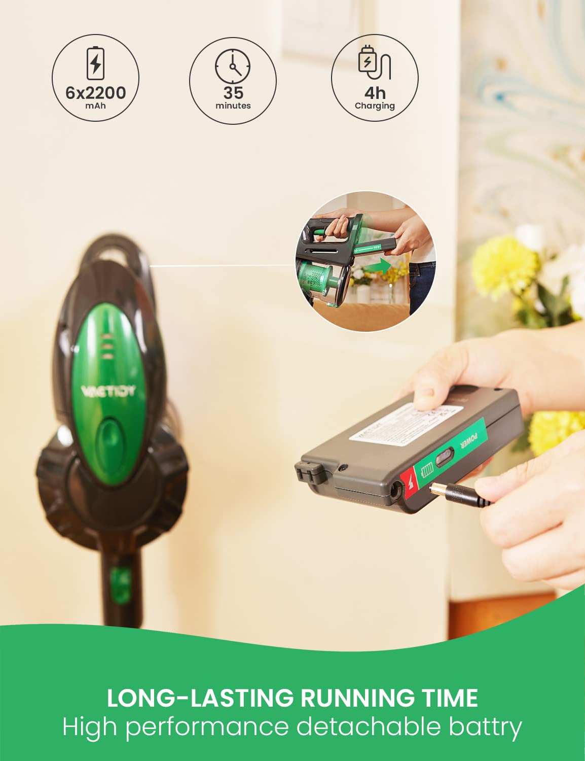 • ✨【Long Running Time】Vactidy vacuum cleaner provides up to 45mins runtime at standard mode, which ensures one thorough cleaning of a whole house. Detachable battery makes it easy to rechargeable separately and doubles the runtime if you buy an additional battery.