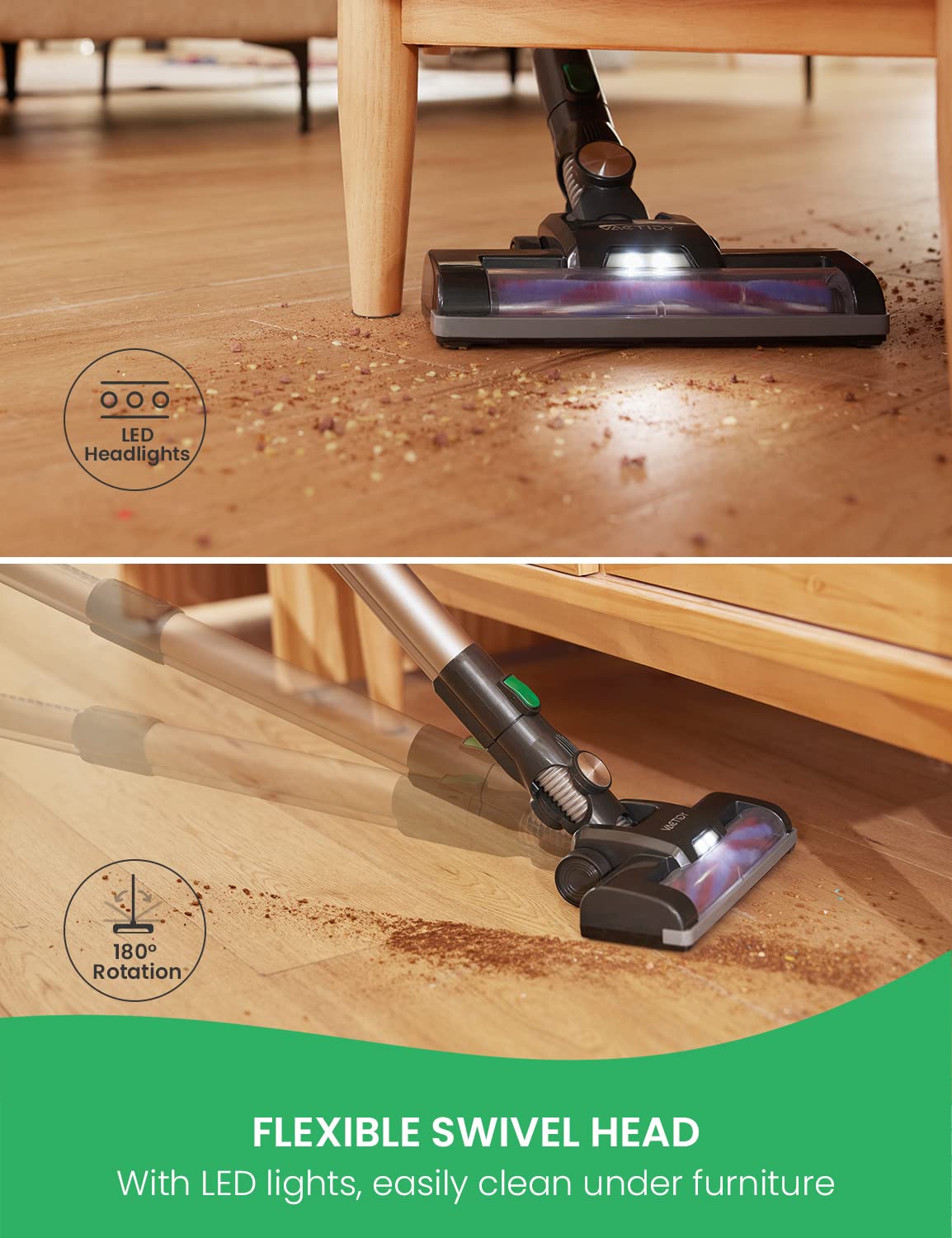 • ✨【Flexible Maneuverability】The motorized floor brush with 2 LED headlights helps track dirt in dark and hardtoreach places. swivels 180° sideways and 90° up and down flexible and movable, it glides under furniture and cabinets easily to eliminate dust and debris that is hard to reach.