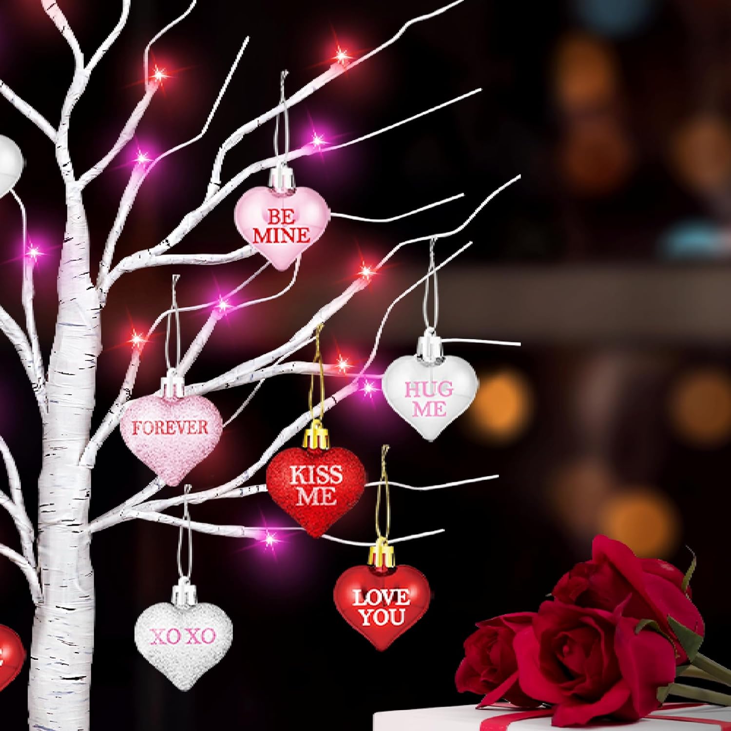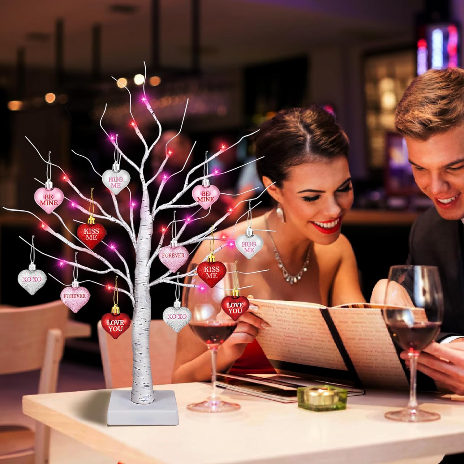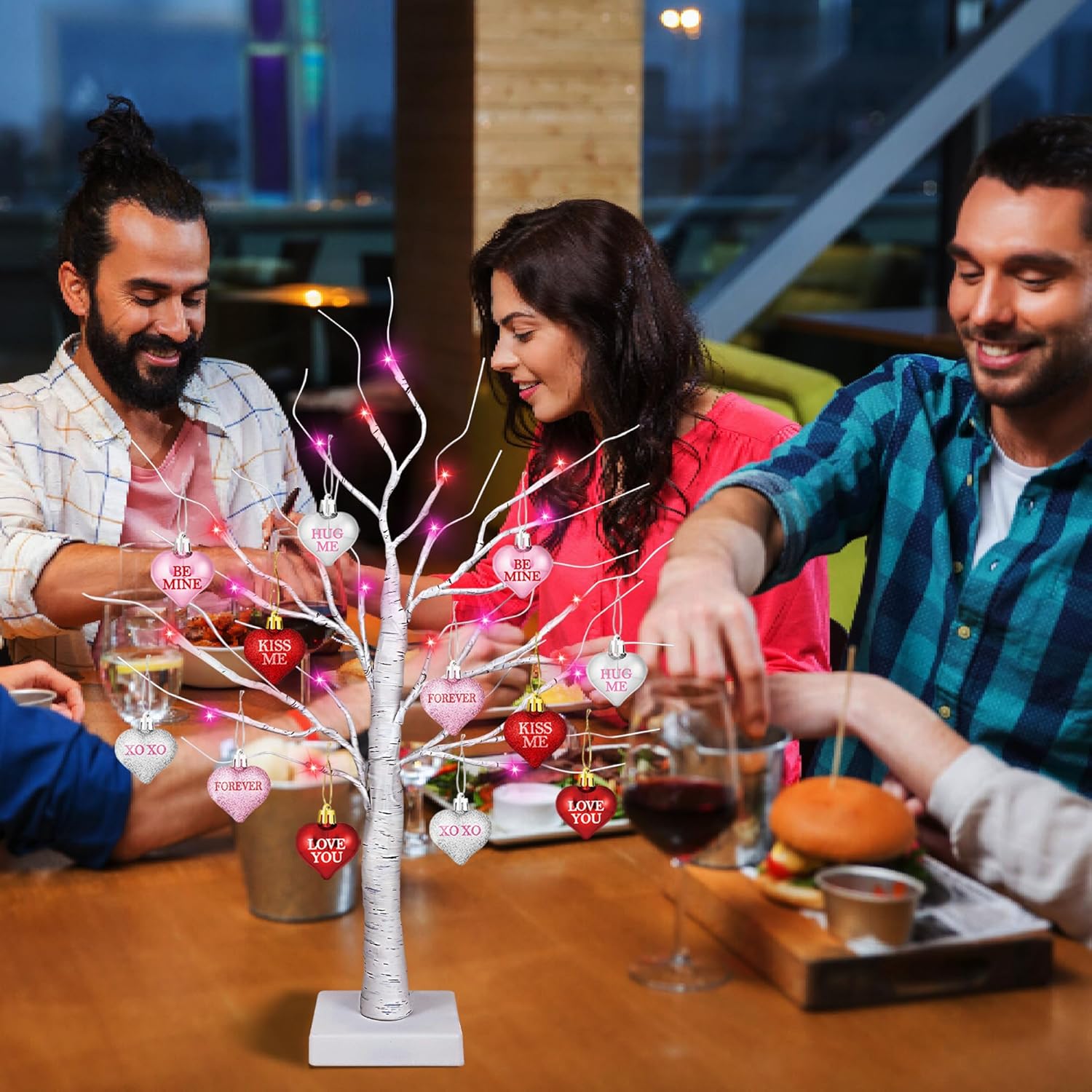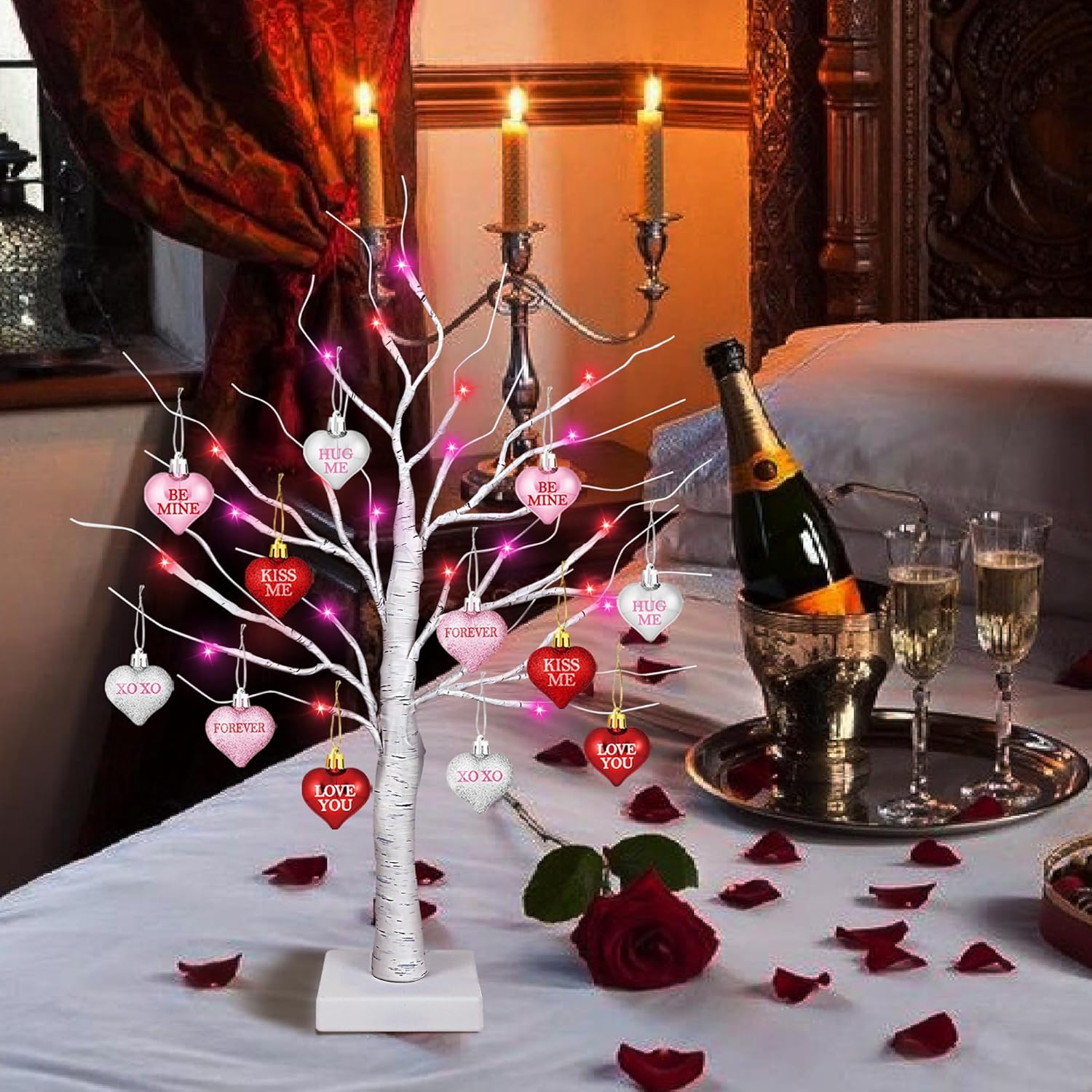 Valentines Day Decorations 24 Inch Lighted Valentines Decor Tree with 12 Heart Ornament, Timer/USB/Battery Operated Valentine's Decoration Tree, Valentines Day Decor for Home Table Bedroom Party