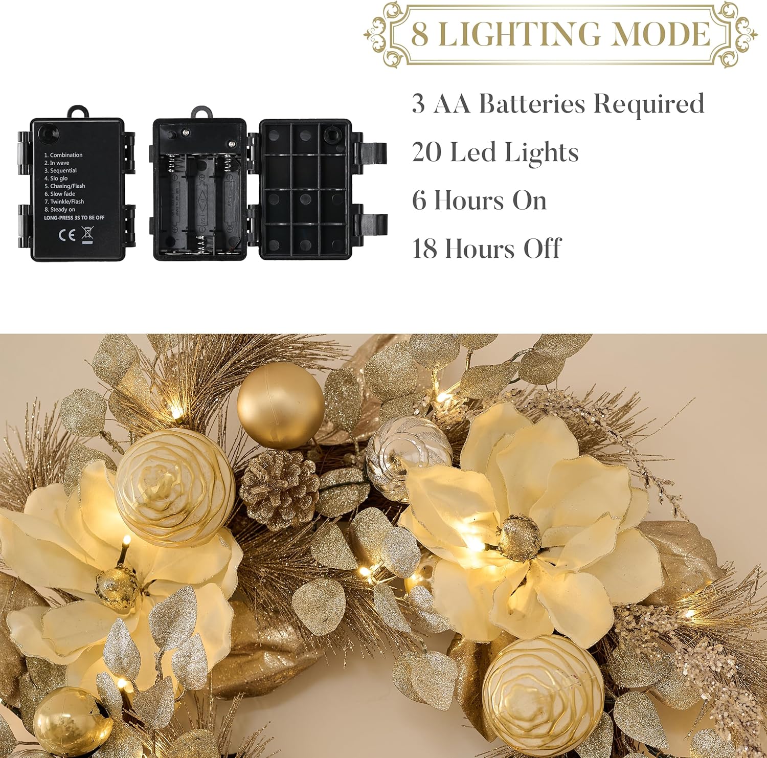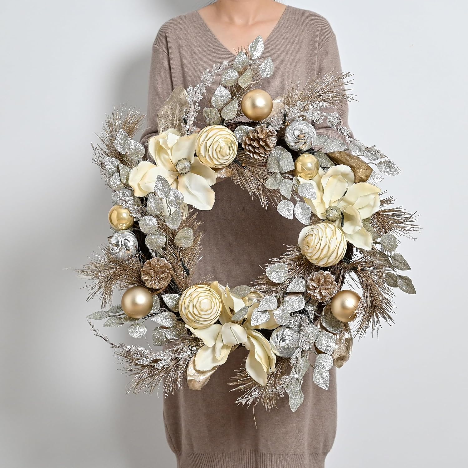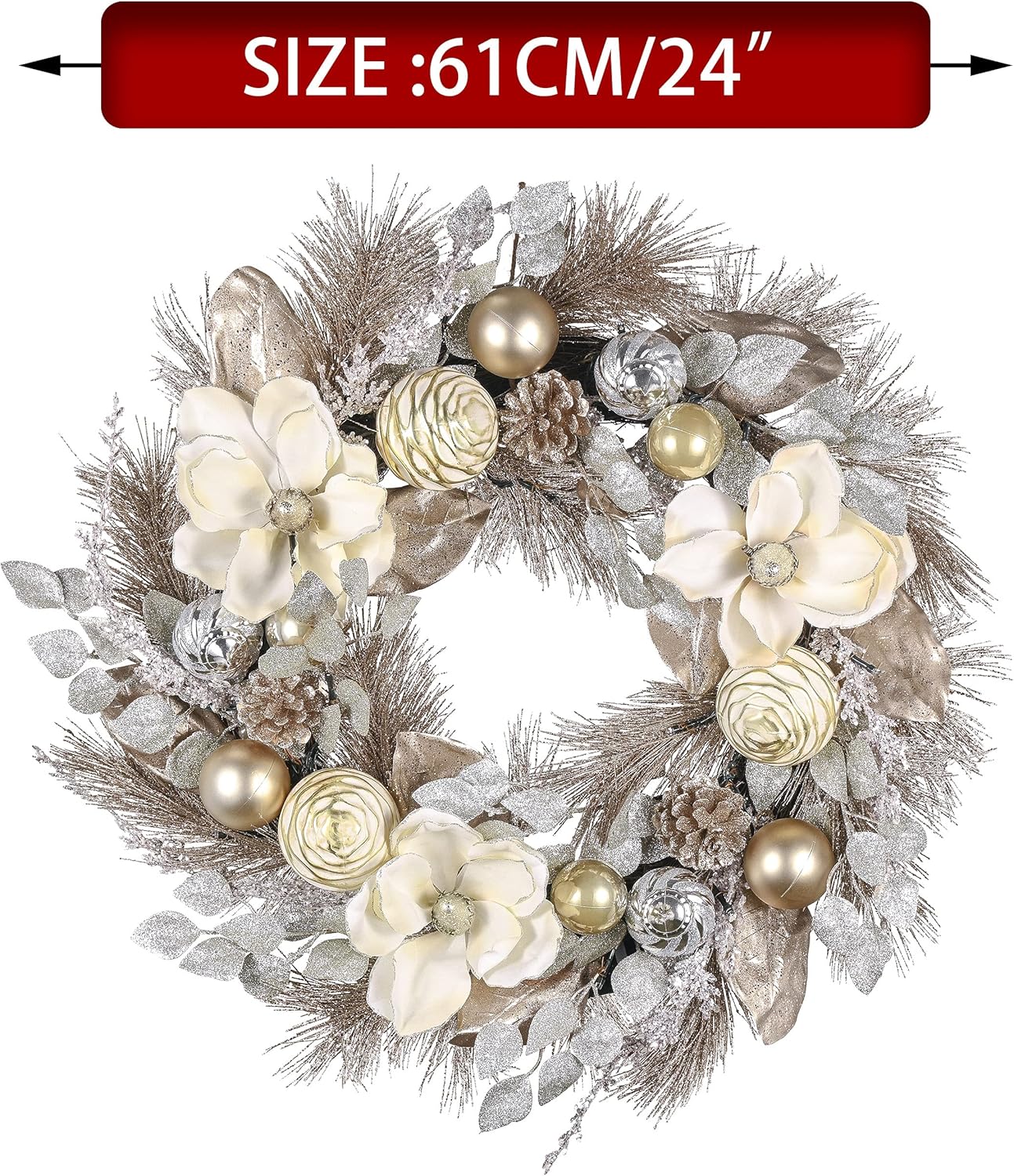 Valery Madelyn 24 Inch Pre-Lit Christmas Wreath for Front Door with Lights, Large Lighted Christmas Wreath with Champagne Gold Xmas Balls for Fireplace Window Outdoor Table Centerpiece Home Decoration
