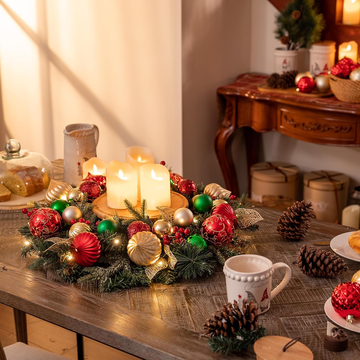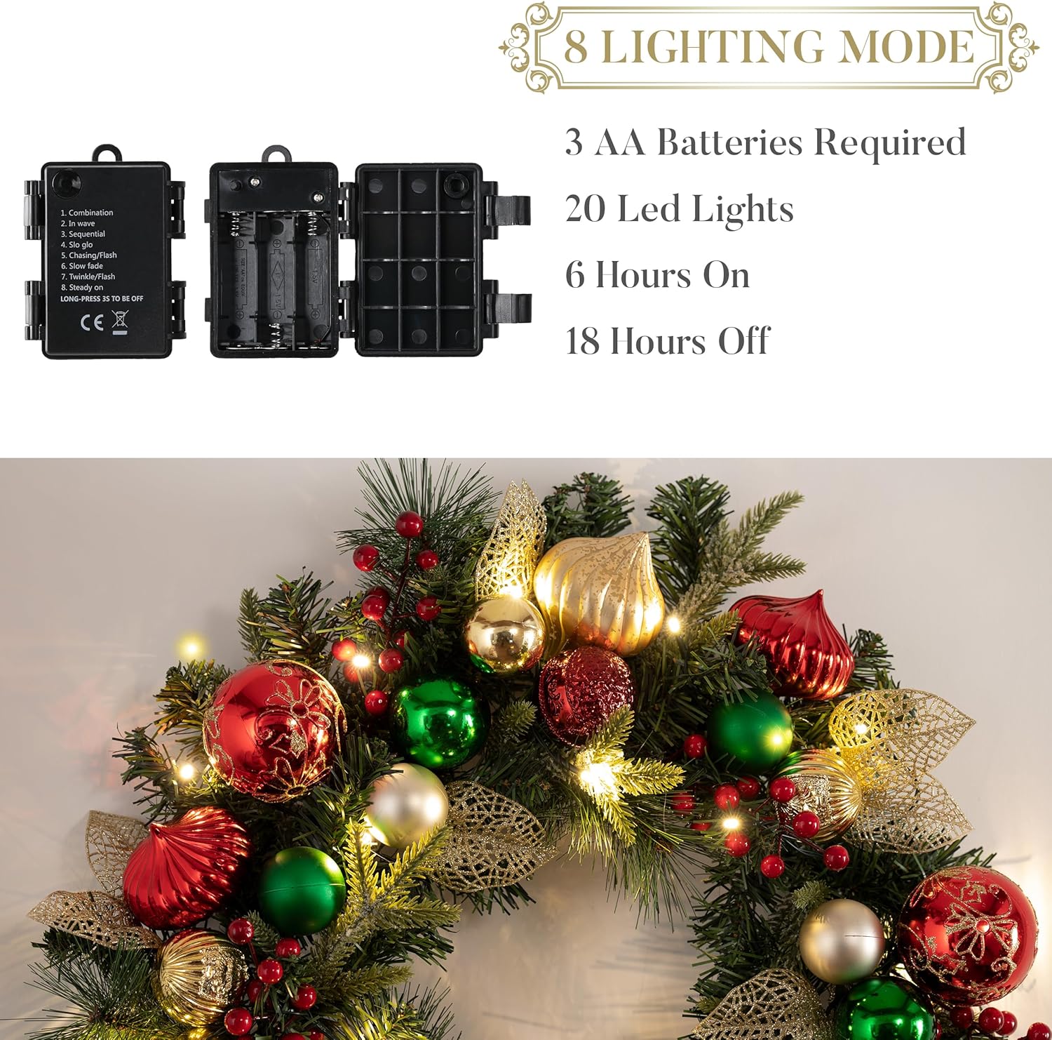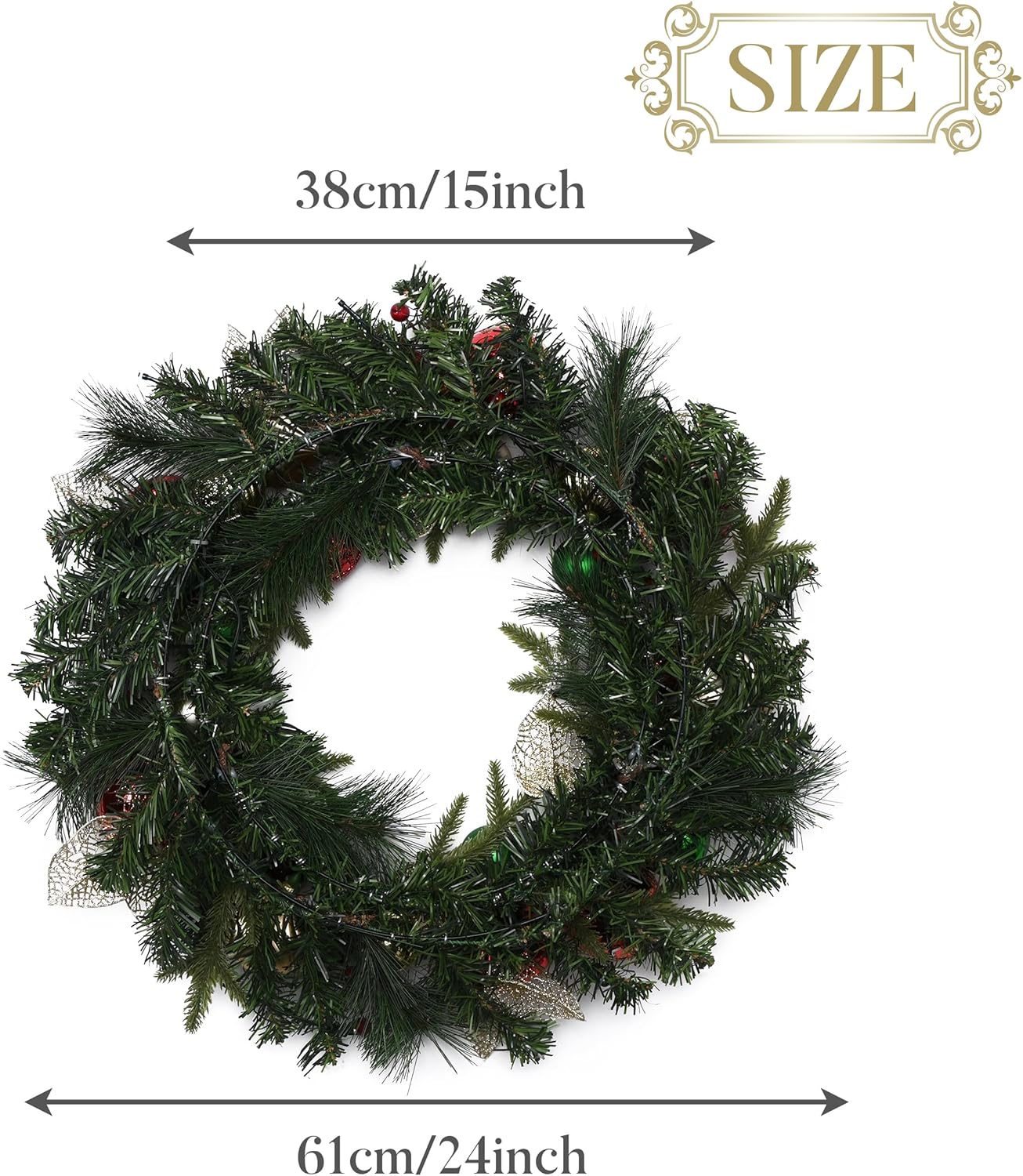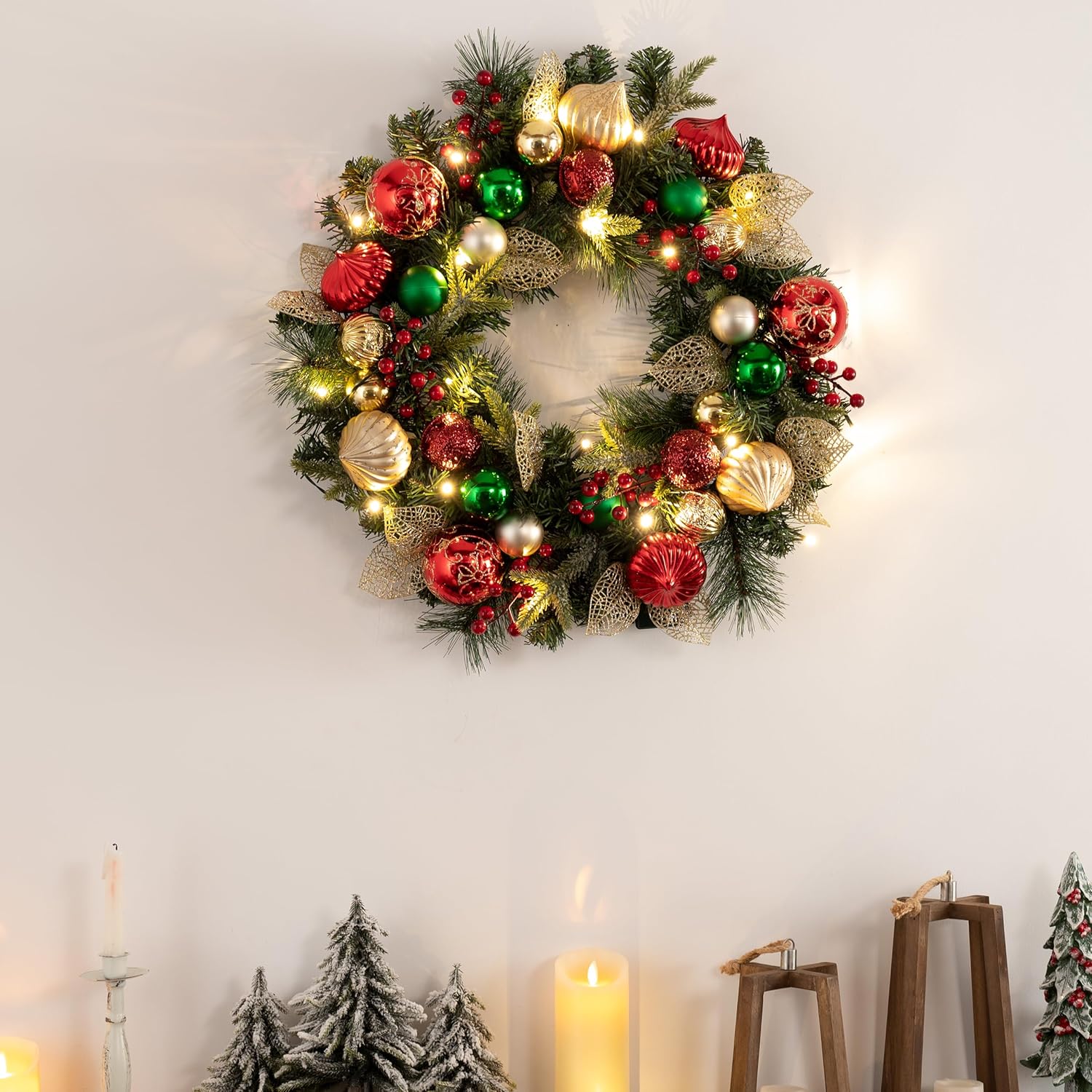 Valery Madelyn 24 Inch Pre-Lit Christmas Wreath for Front Door with Lights, Large Lighted Christmas Wreath with Red Green Gold Xmas Ball for Fireplace Window Outdoor Table Centerpiece Home Decoration