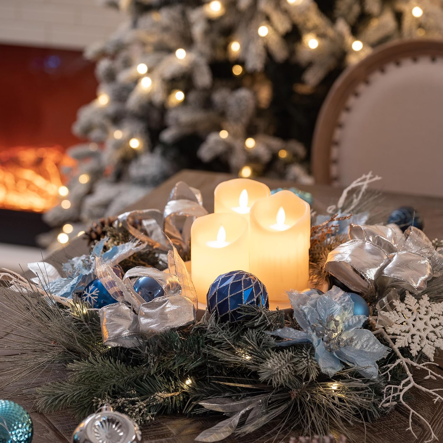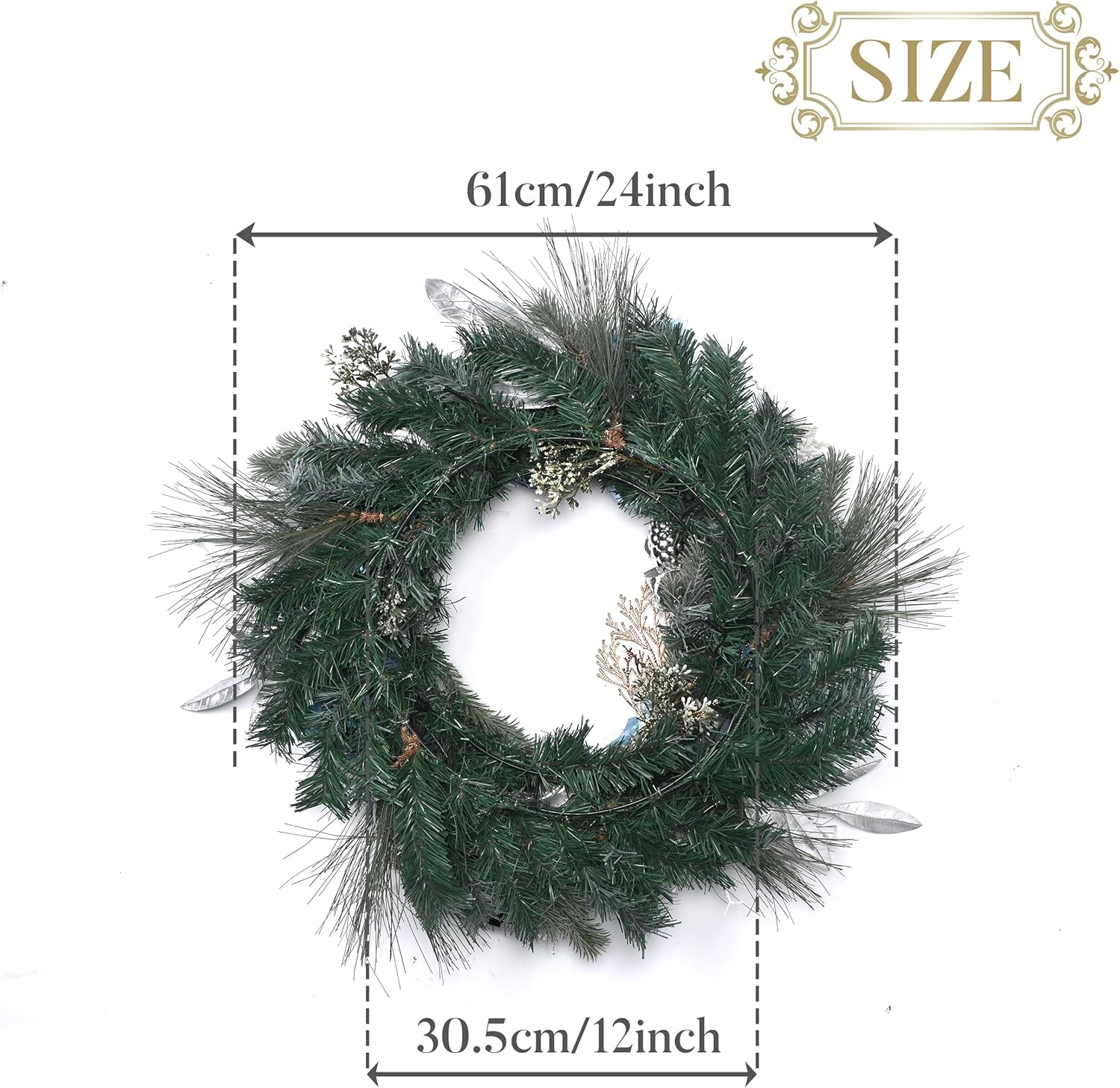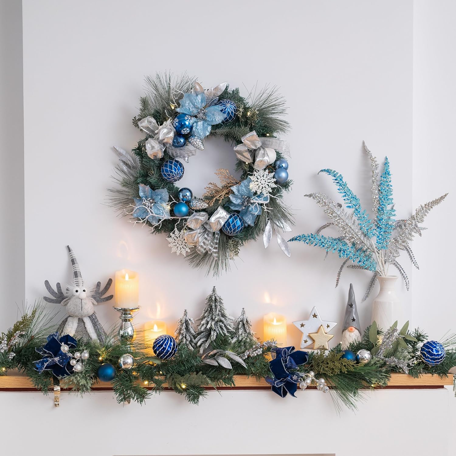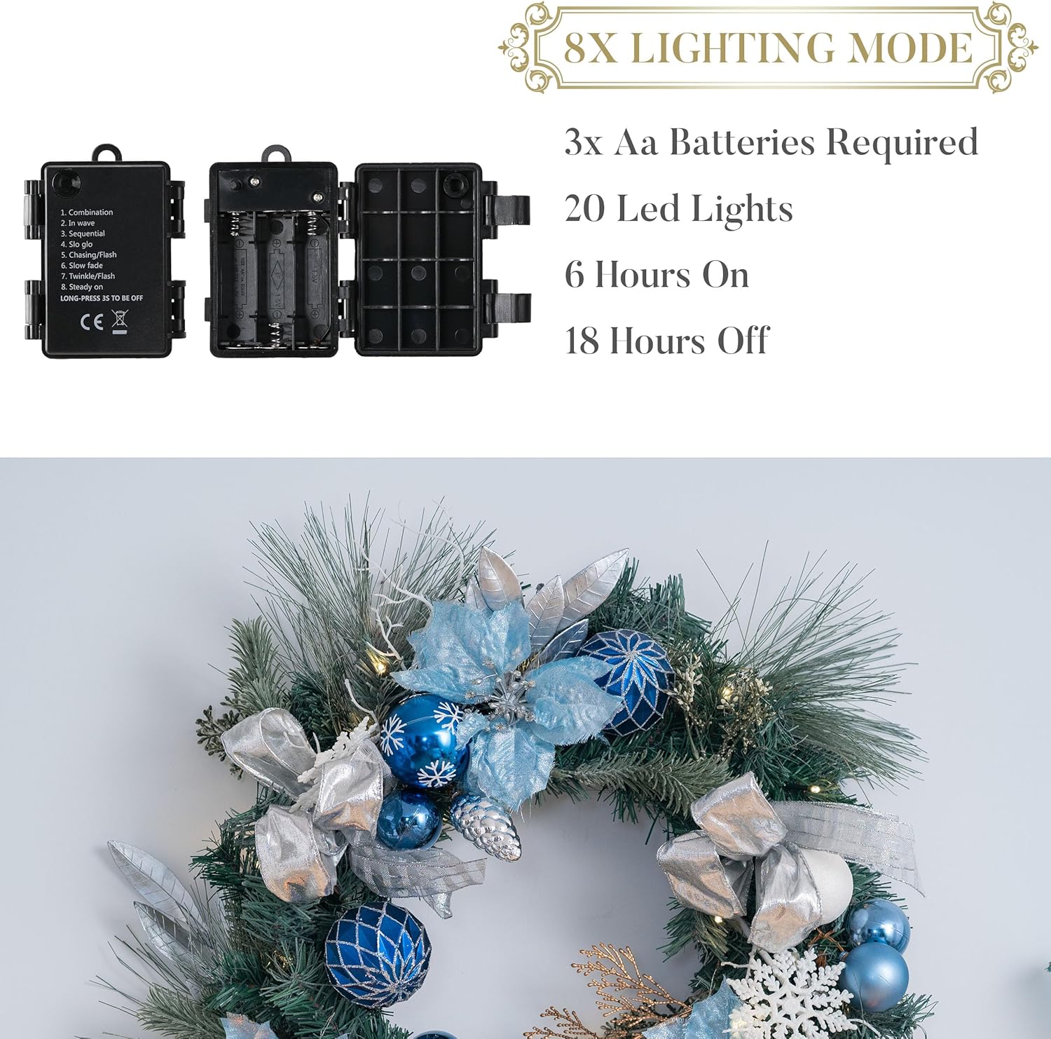 Valery Madelyn 24 Inch Pre-Lit Christmas Wreath for Front Door with Lights, Large Lighted Christmas Wreath with Silver Blue Xmas Ball for Fireplace Window Outdoor Table Centerpiece Holiday Decoration