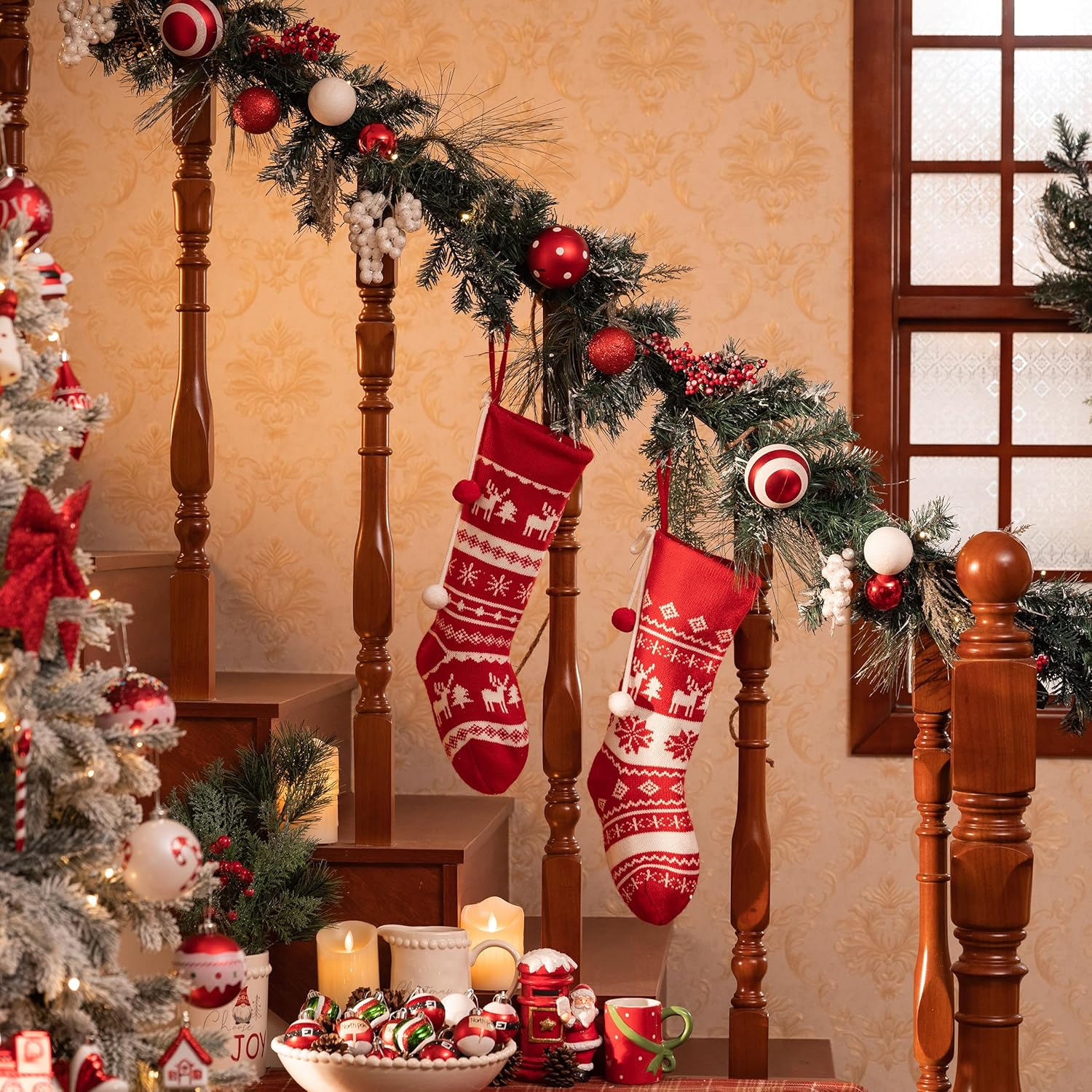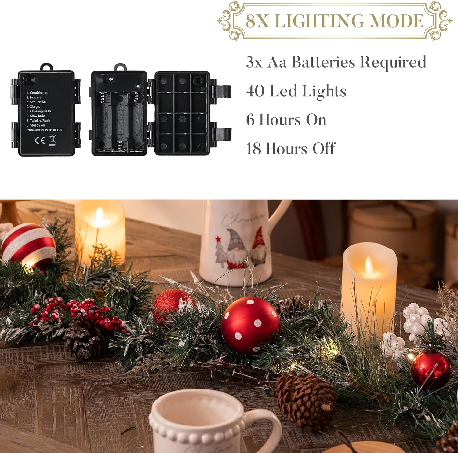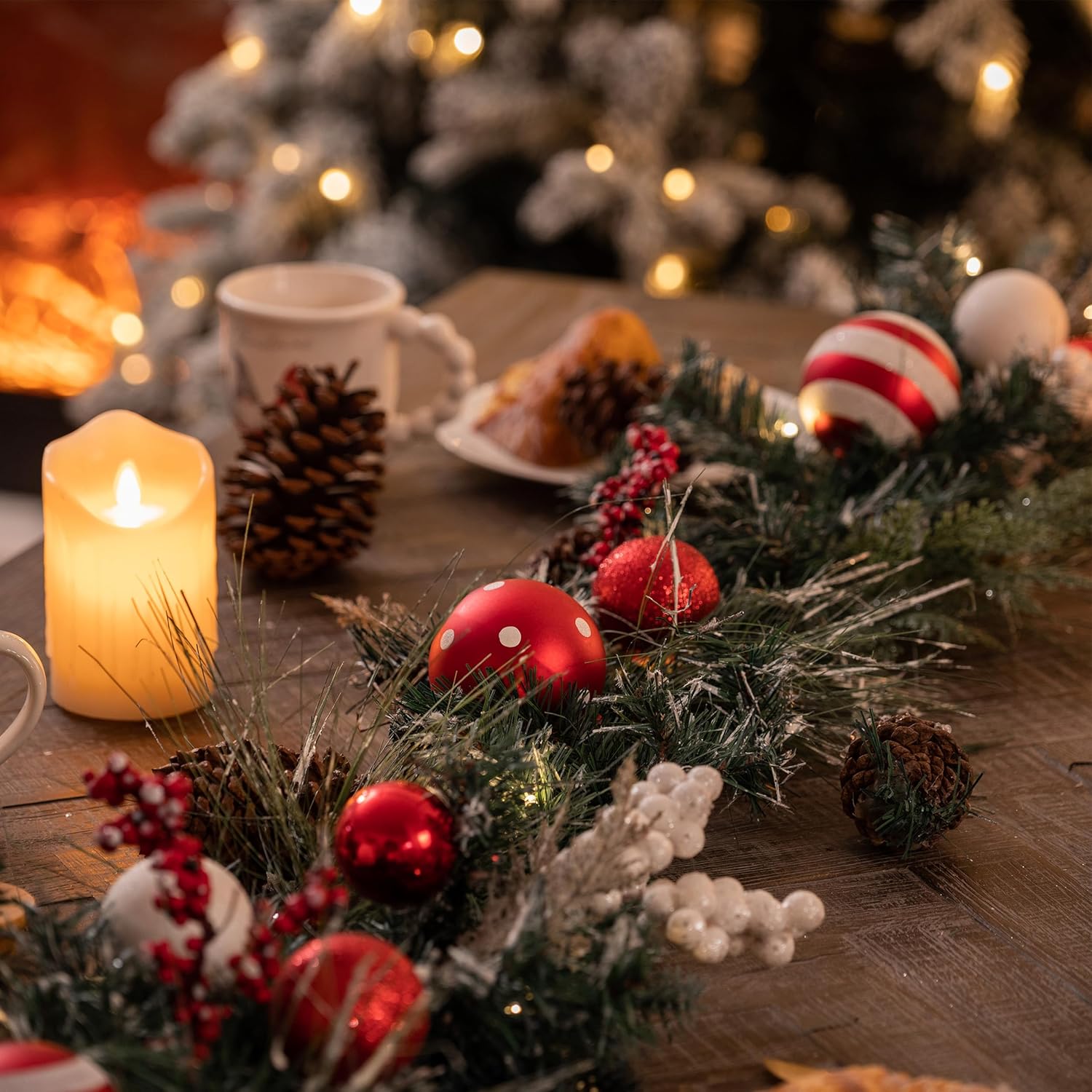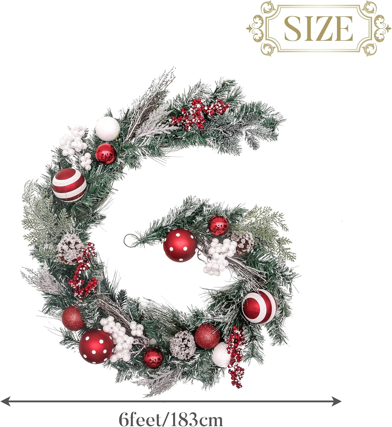 Valery Madelyn 6 feet Pre-Lit Christmas Garland with Lights for Mantle, Lighted Battery Operated Xmas Garland with Red White Balls for Front Door Fireplace Table Centerpiece Outdoor Window Home Decor