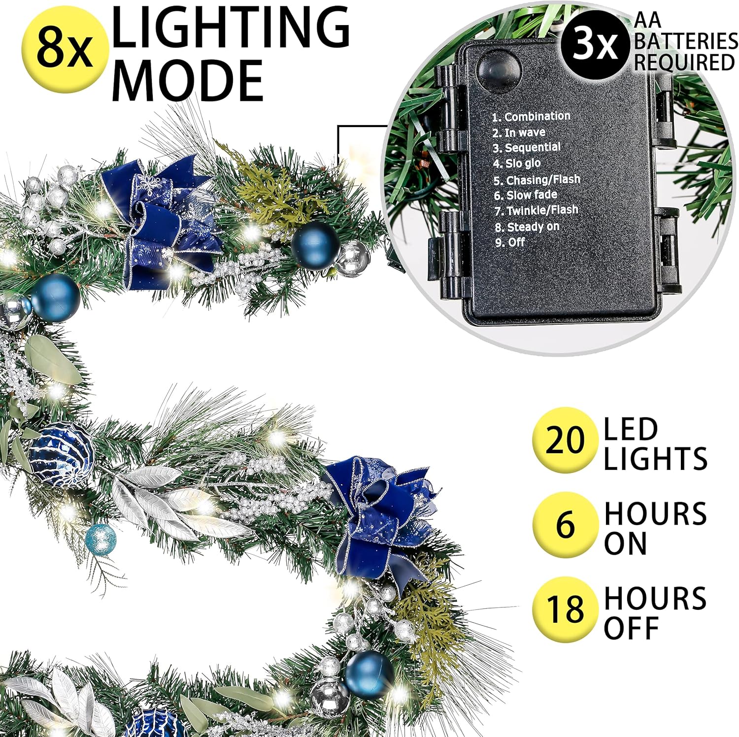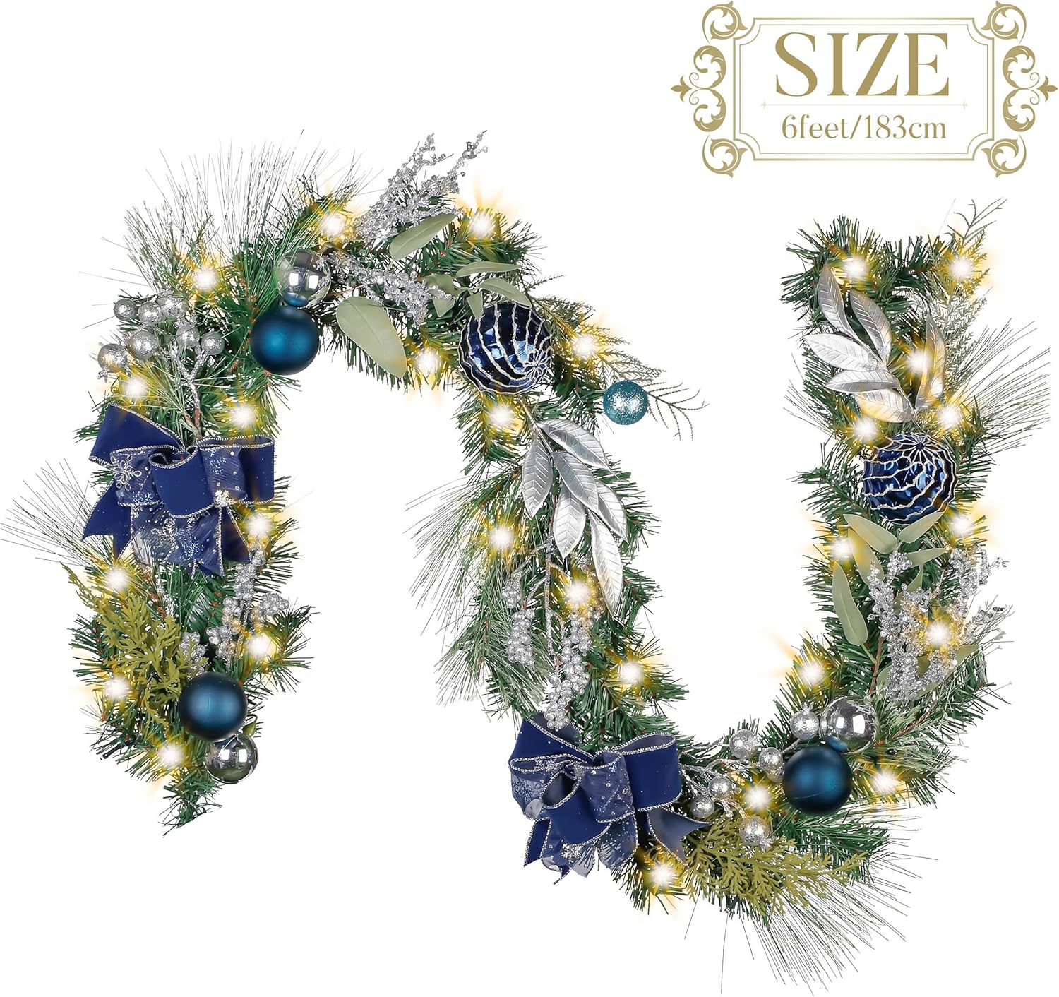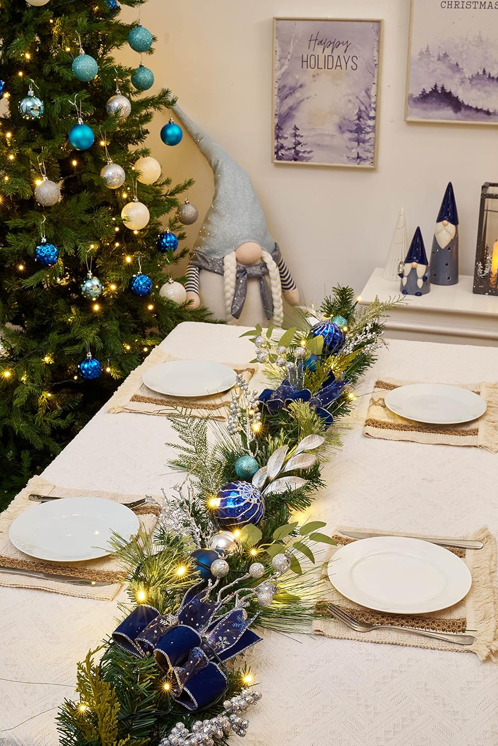 Valery Madelyn 6 feet Pre-Lit Christmas Garland with Lights for Mantle, Lighted Battery Operated Xmas Garland with Silver Blue Balls Ribbons for Front Door Fireplace Table Centerpiece Outdoor Decor