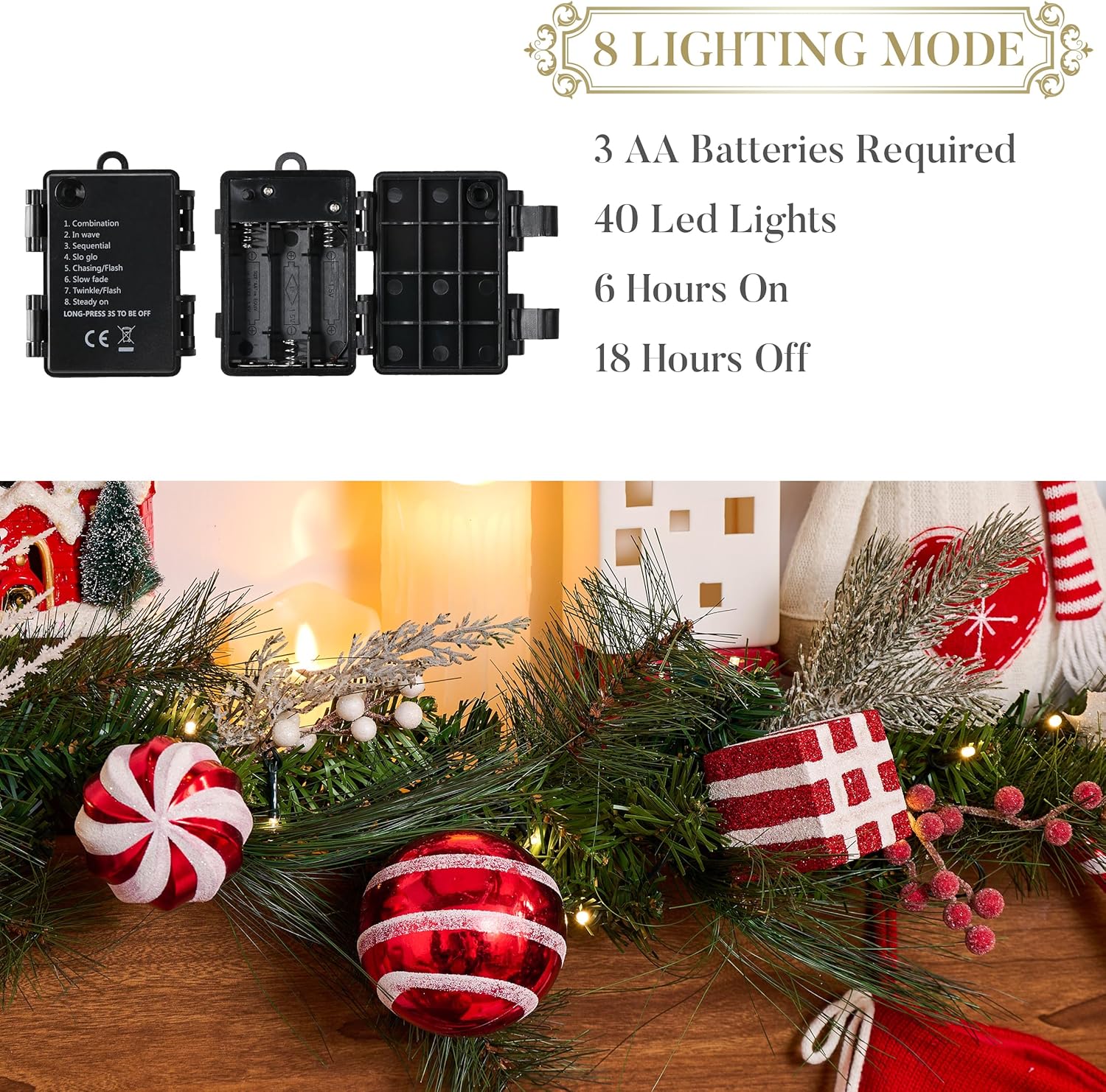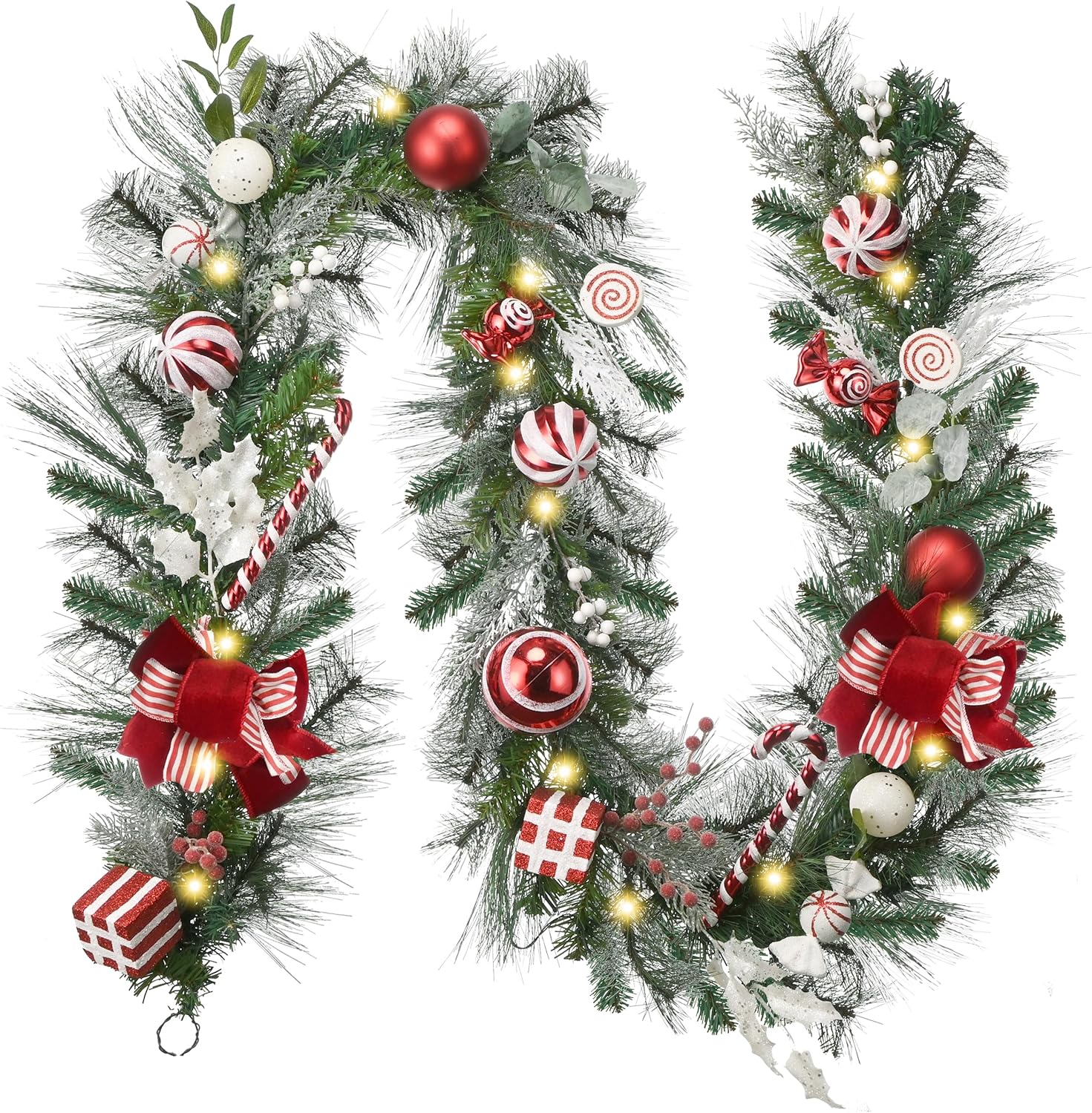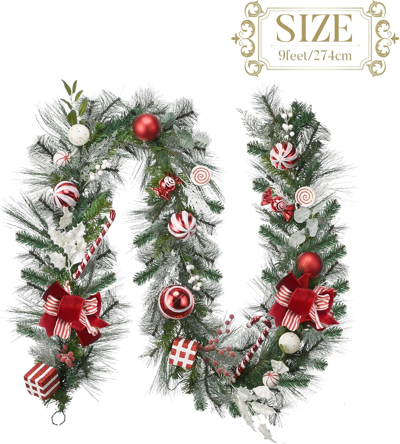 Valery Madelyn 9 feet Pre-Lit Christmas Garland with Lights for Mantle, Lighted Battery Operated Candy Cane Xmas Garland with Red White Balls for Front Door Fireplace Table Centerpiece Outdoor Decor