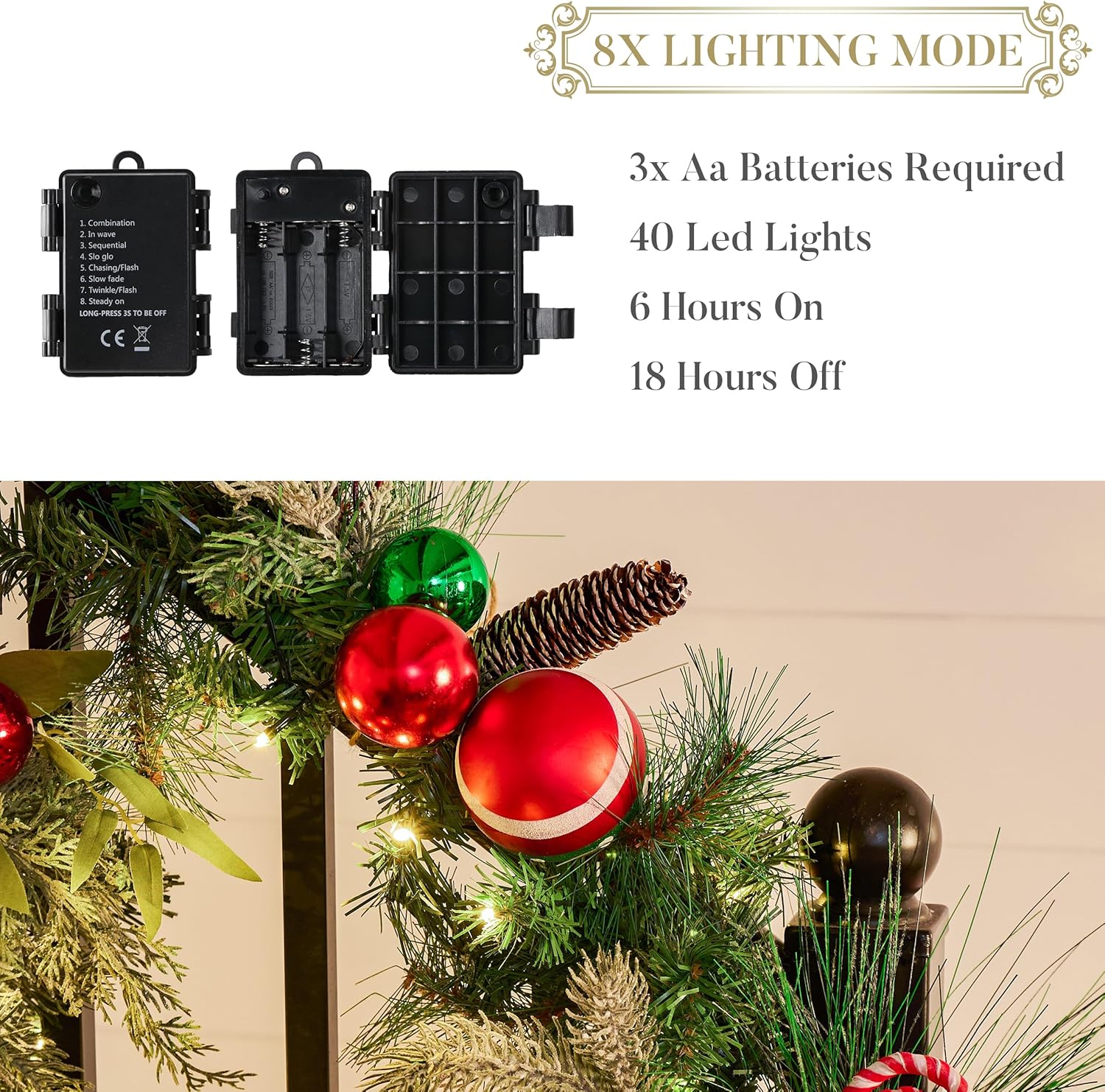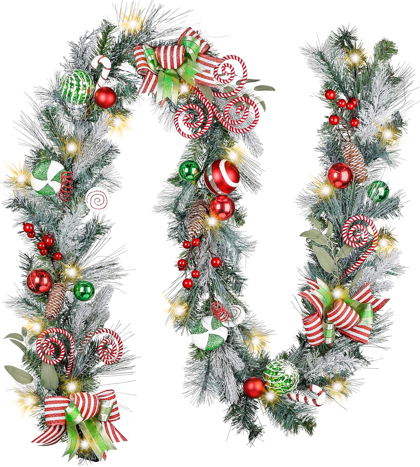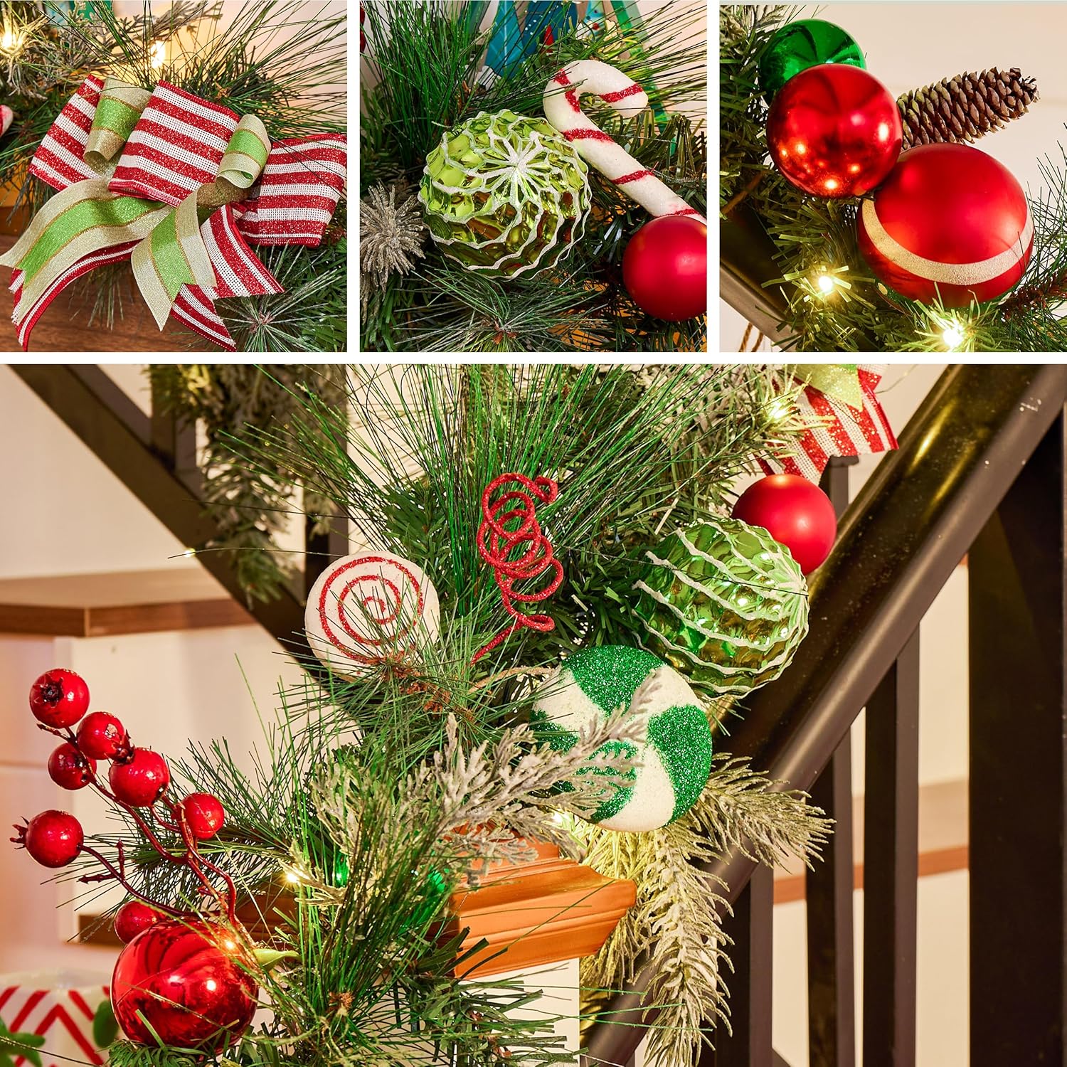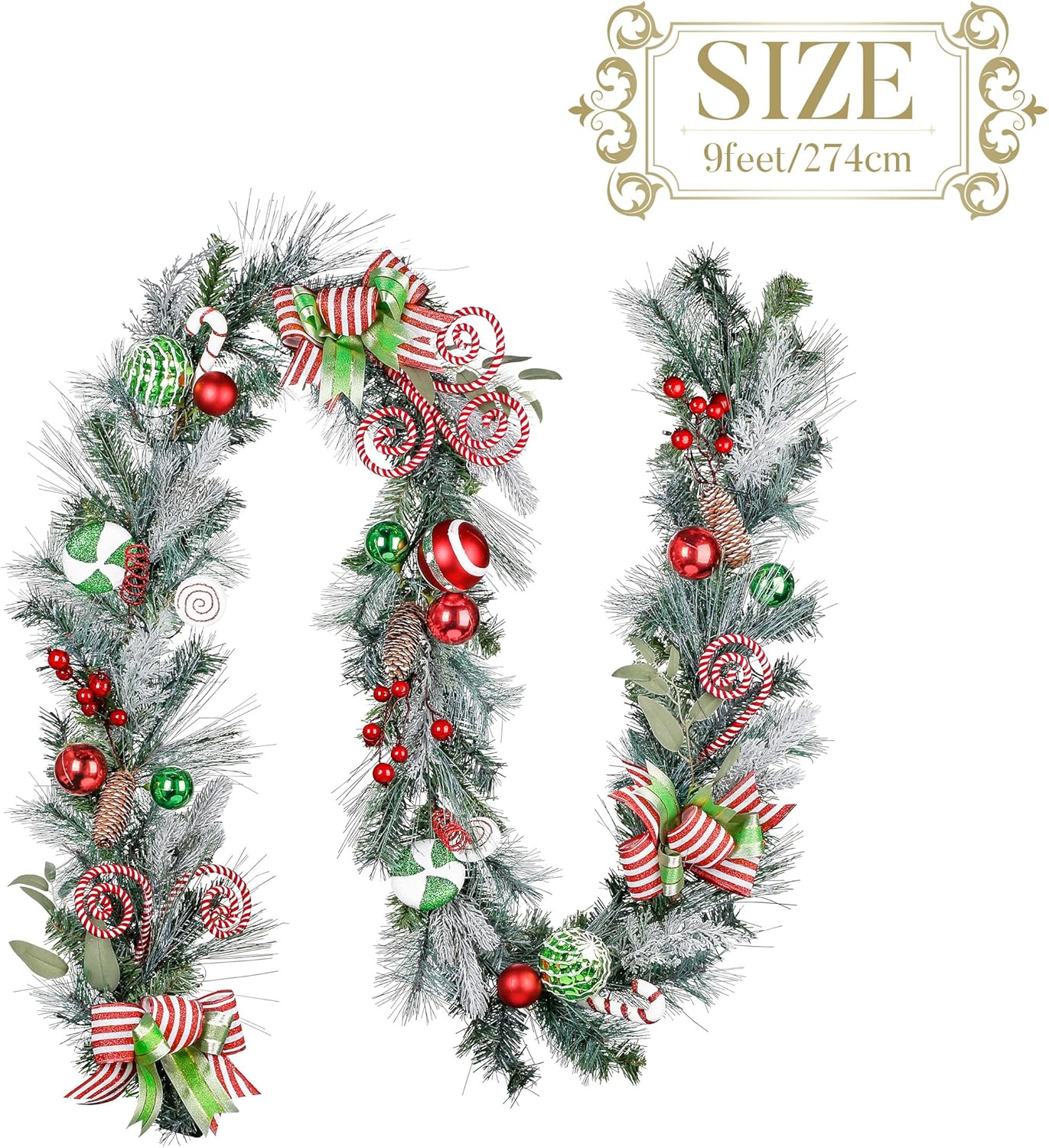 Valery Madelyn 9 feet Pre-Lit Christmas Garland with Lights for Mantle, Lighted Battery Operated Elf Xmas Garland with Red Green White Balls for Front Door Fireplace Table Centerpiece Outdoor Decor