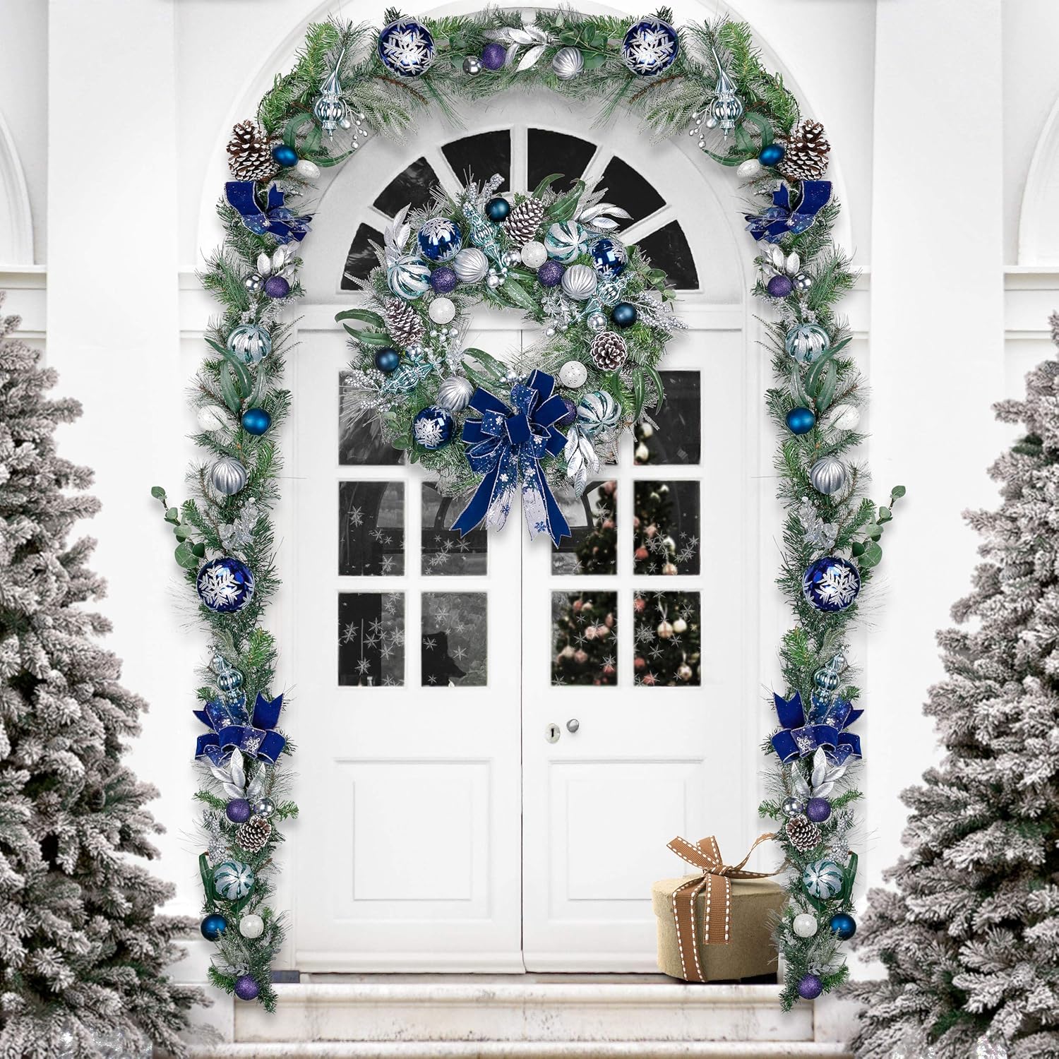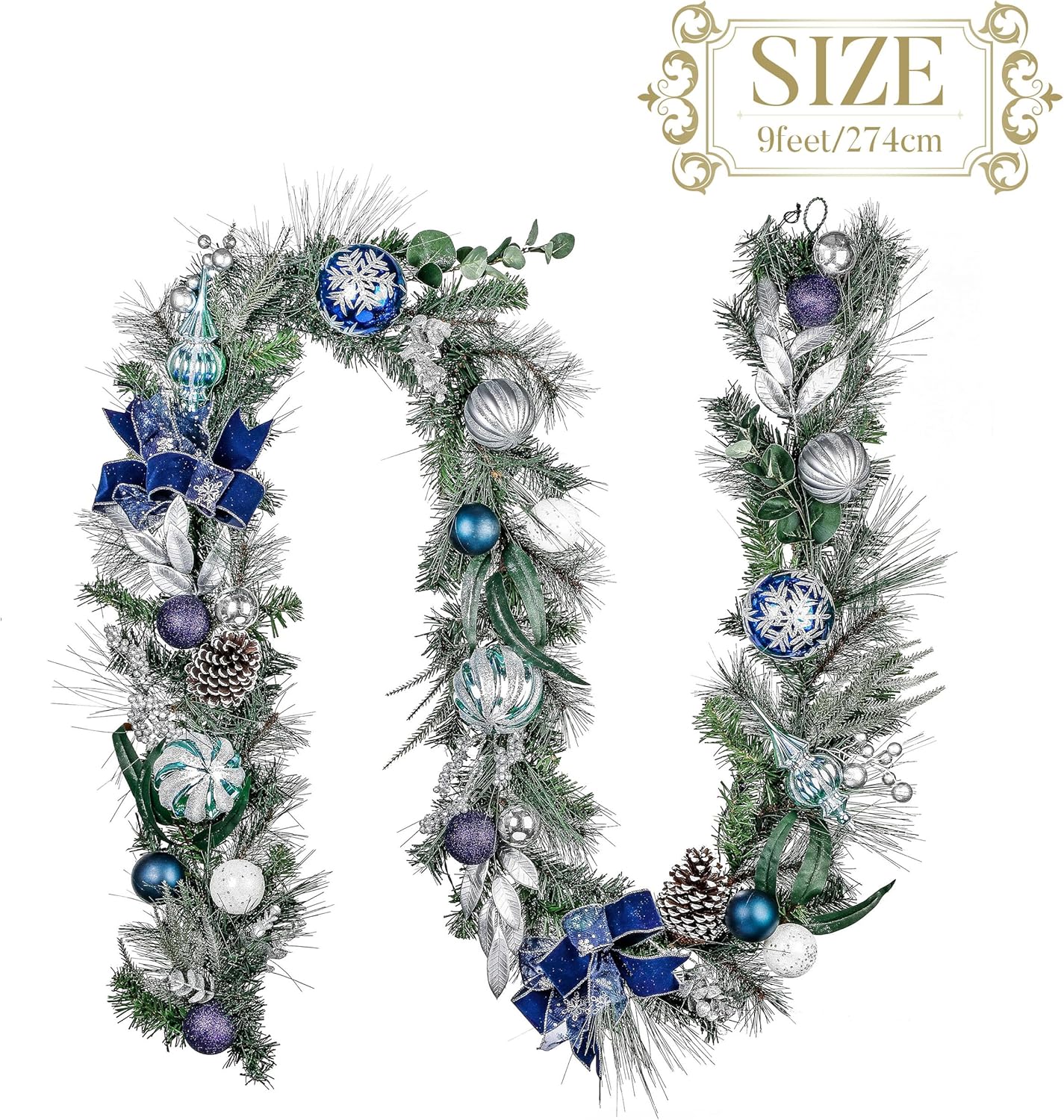 Valery Madelyn 9 feet Pre-Lit Christmas Garland with Lights for Mantle, Lighted Battery Operated Xmas Garland with Silver Blue Balls Ribbons for Front Door Fireplace Table Centerpiece Outdoor Decor