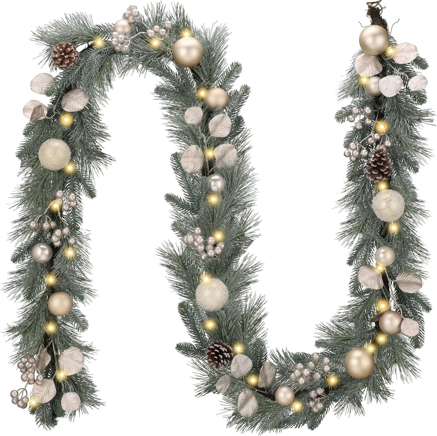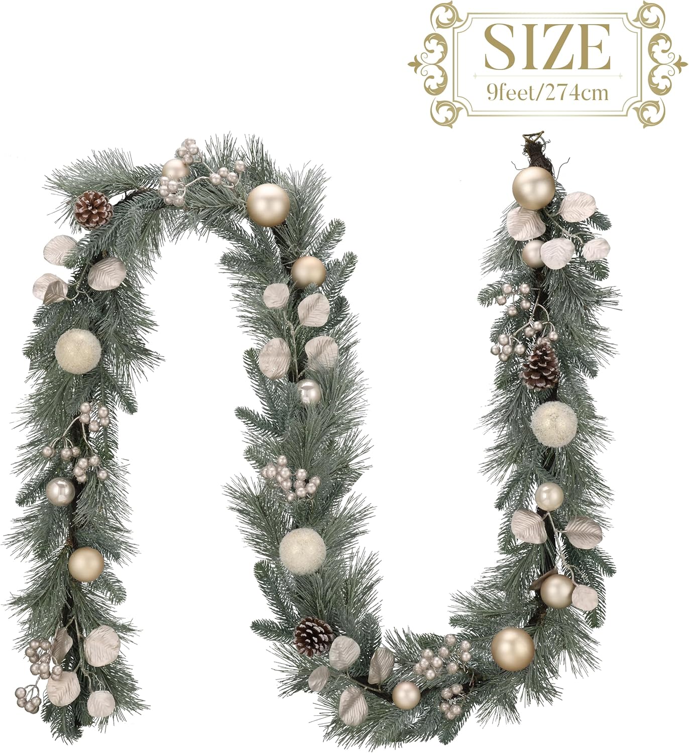Valery Madelyn 9 feet Pre-Lit Christmas Garland with Lights for Mantle, Lighted Battery Operated Xmas Garland with White Gold Ball for Front Door Fireplace Table Centerpiece Outdoor Window Home Decor