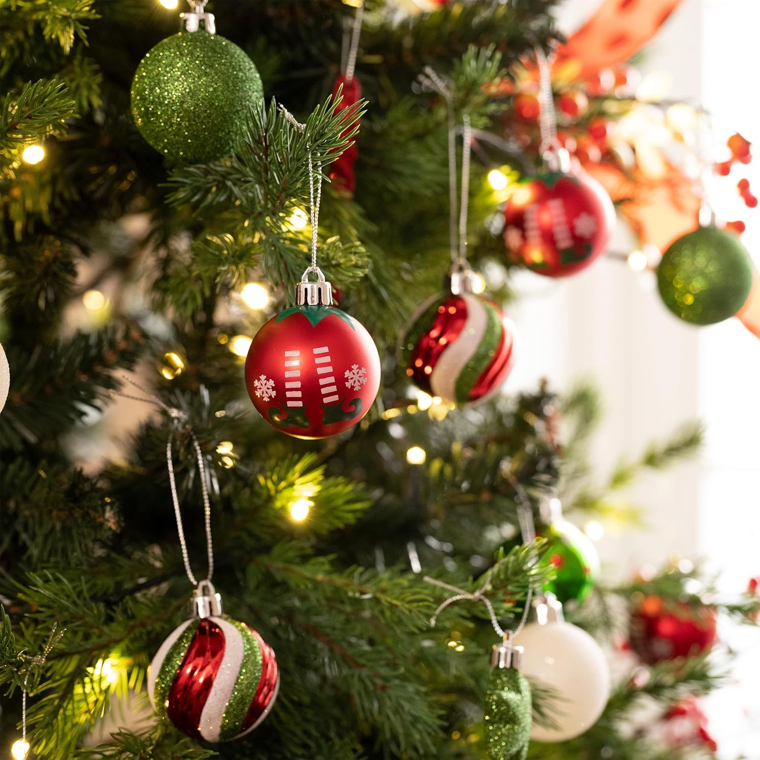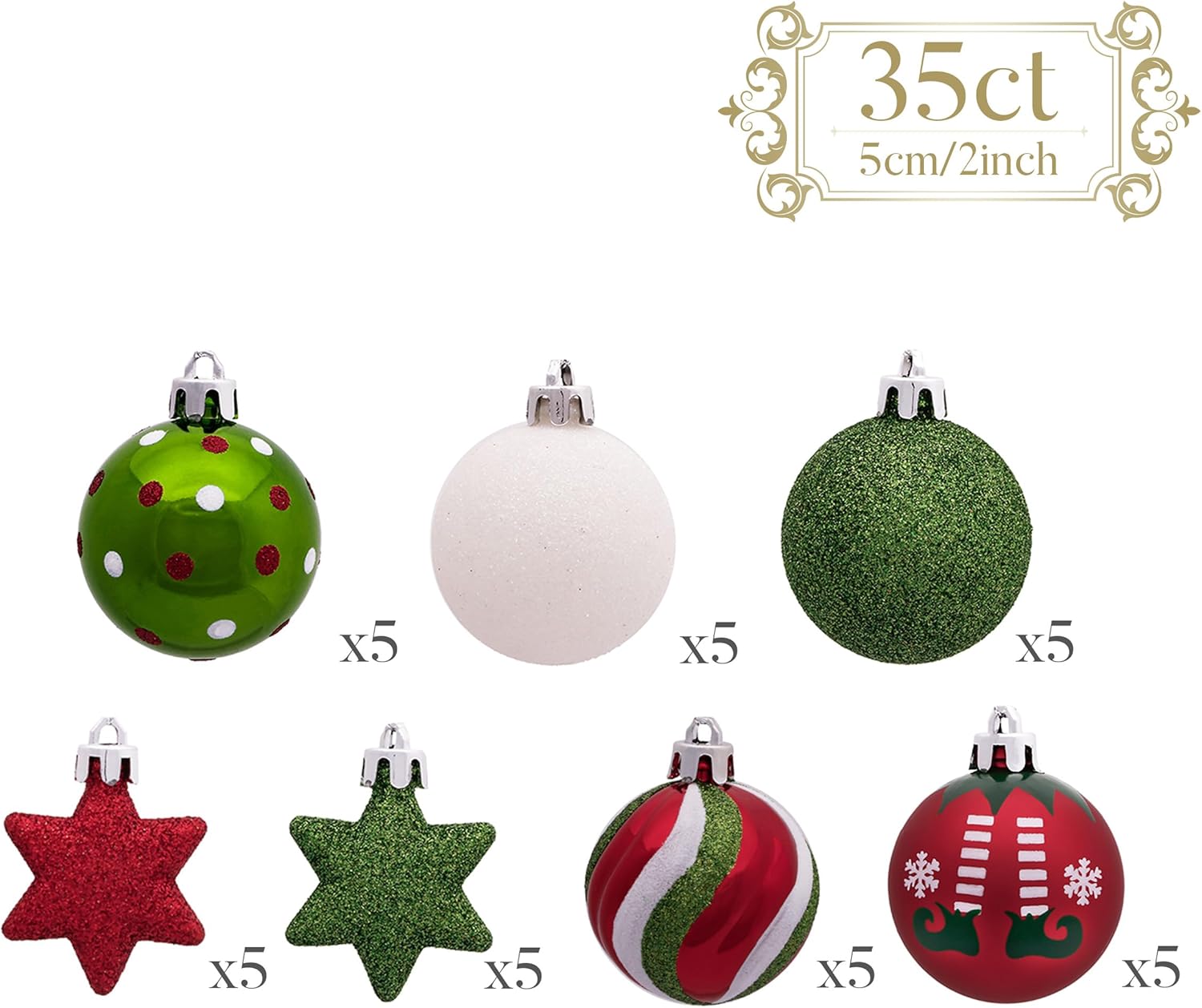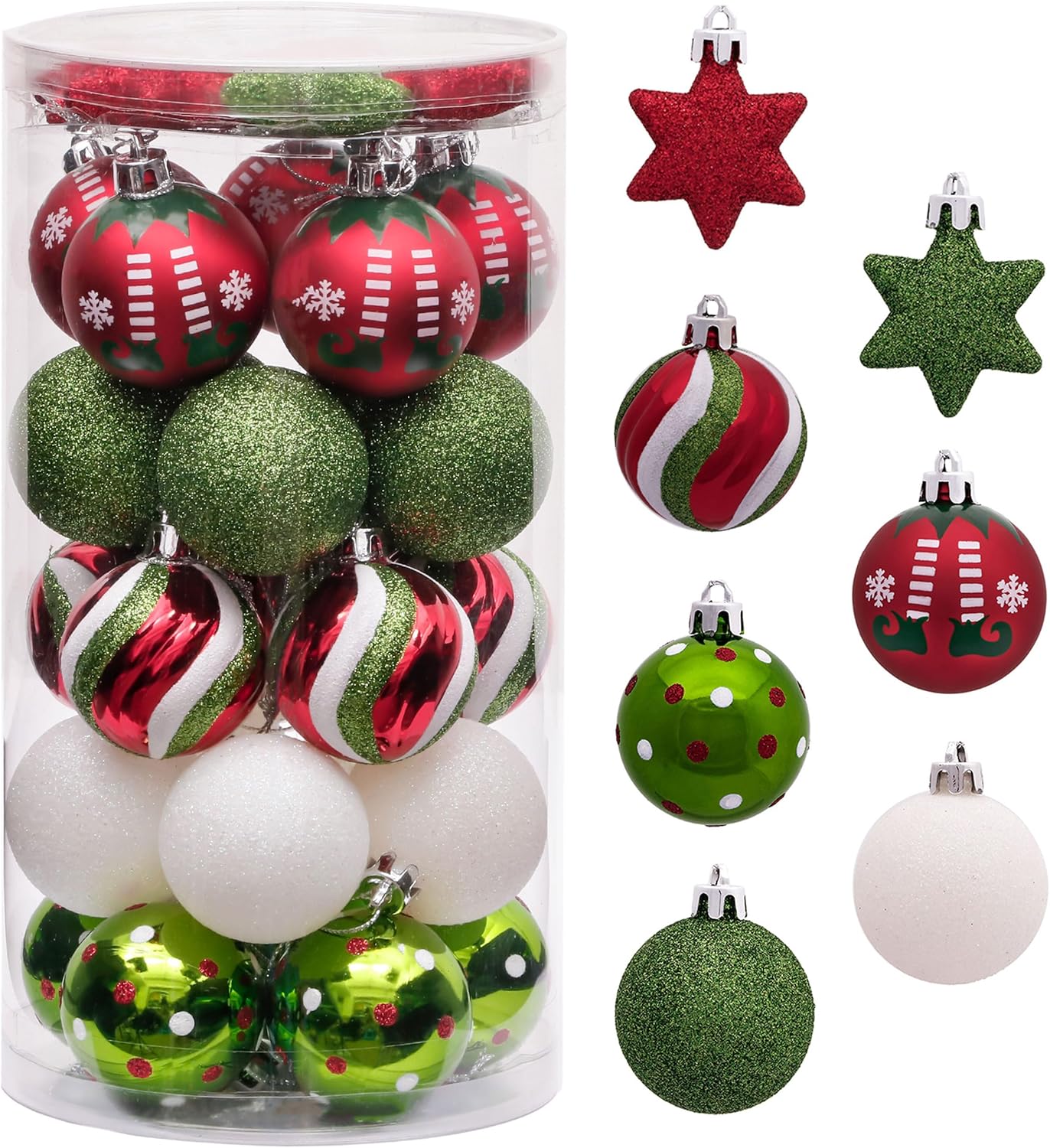 Valery Madelyn Christmas Ball Ornaments, 35ct Elf Red Green White Shatterproof Christmas Tree Decorations Set, 1.97 Inch Whimsical Decorative Hanging Ornament Bulk for Xmas Holiday Party Decor