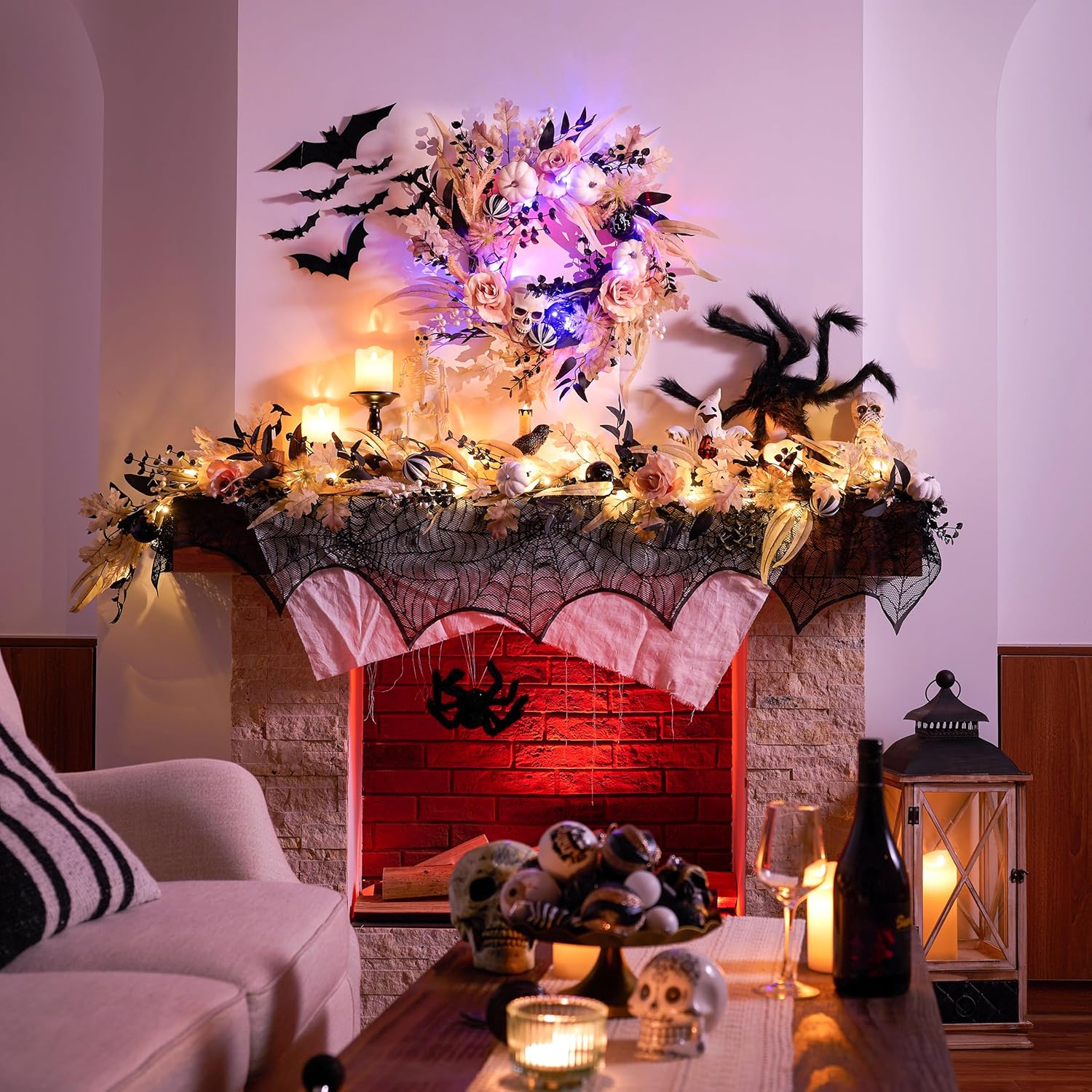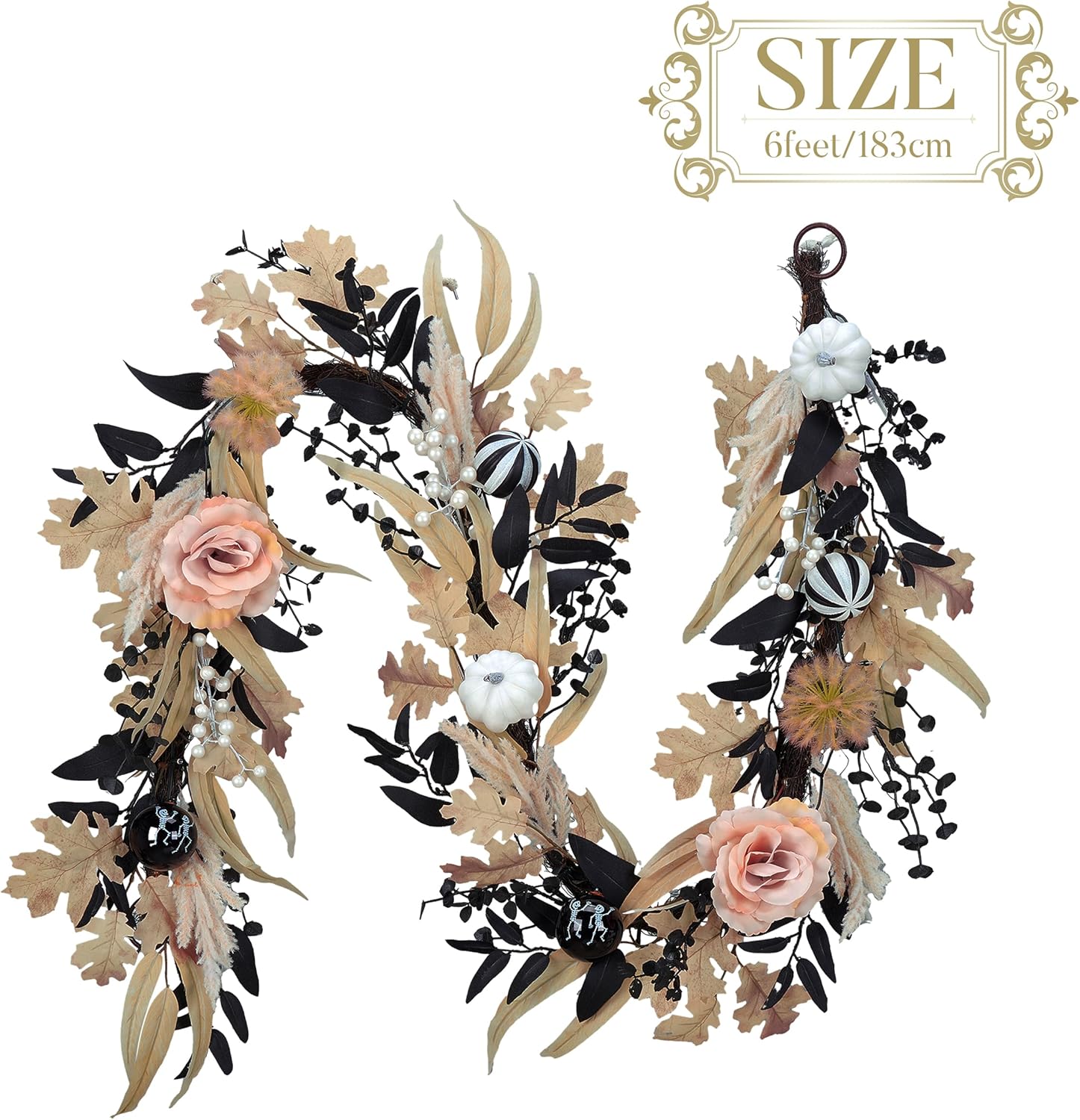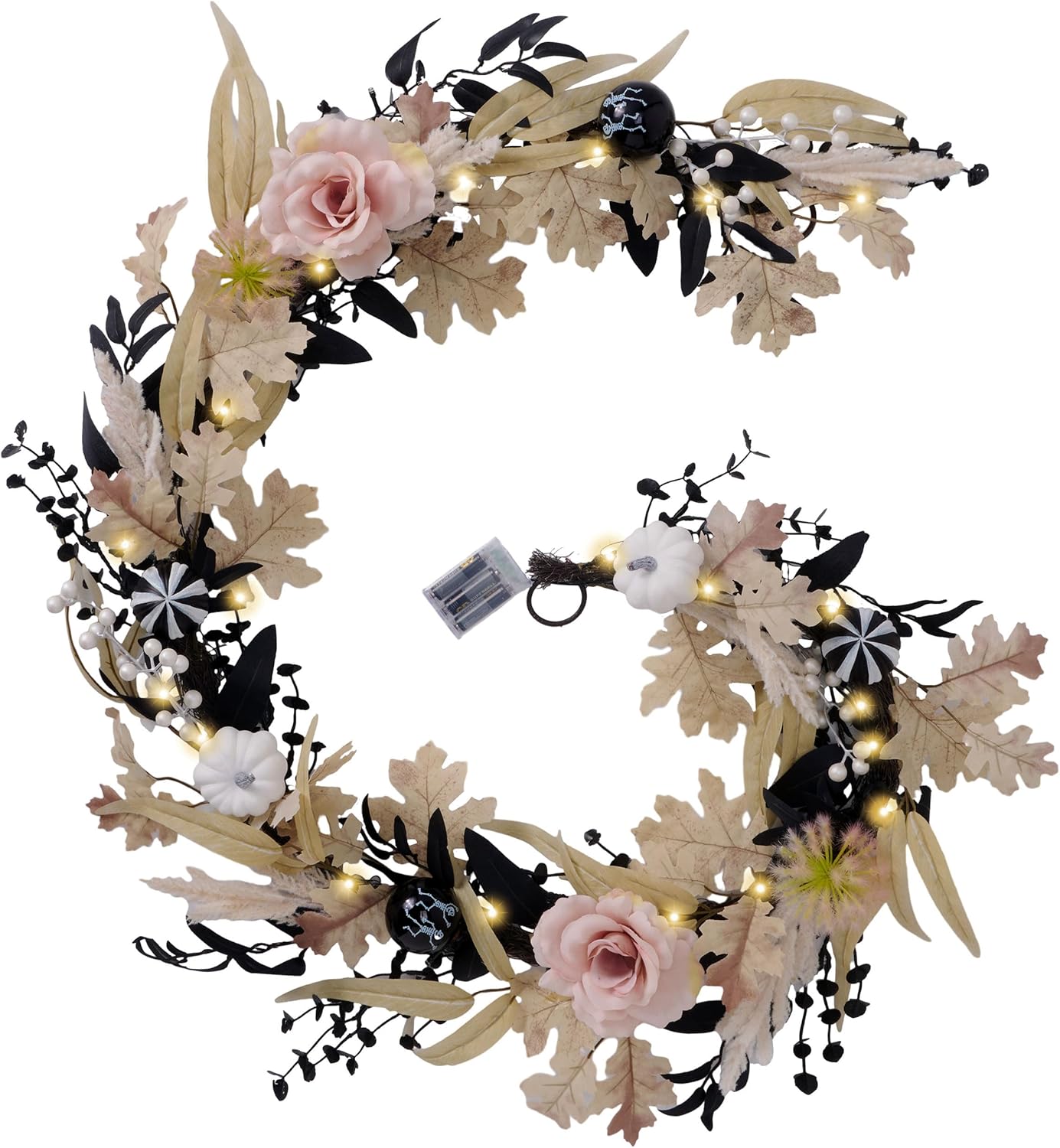 Valery Madelyn Christmas Halloween Fall Garland for Mantle with Lights, 6 Feet Pre-Lit Pink Roses White Pumpkin Garland Decorations for Table Centerpiece Indoor Stair Party Holiday Autumn Home Decor