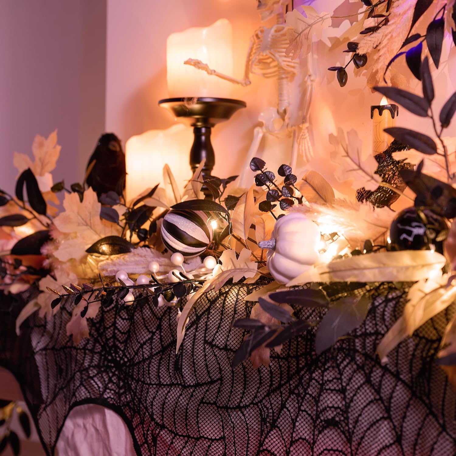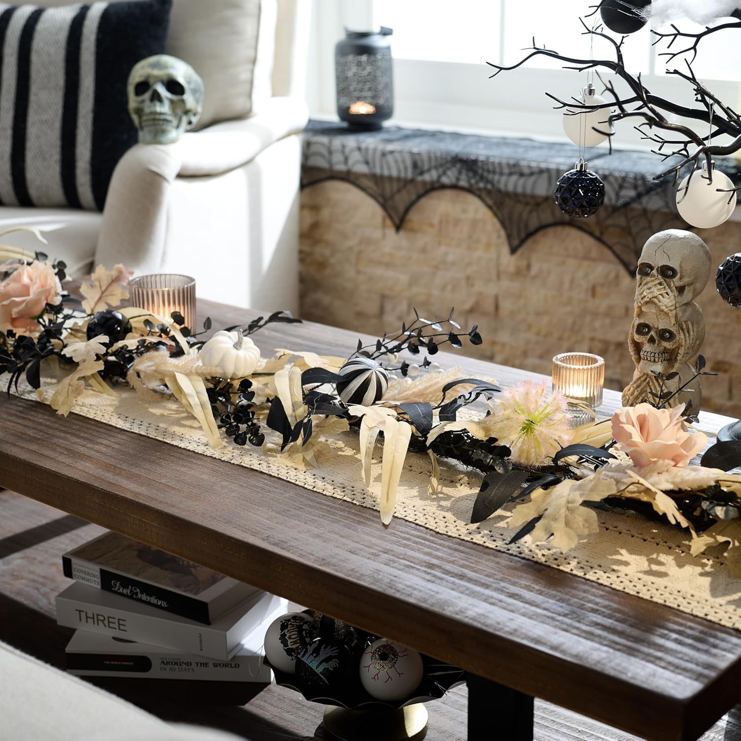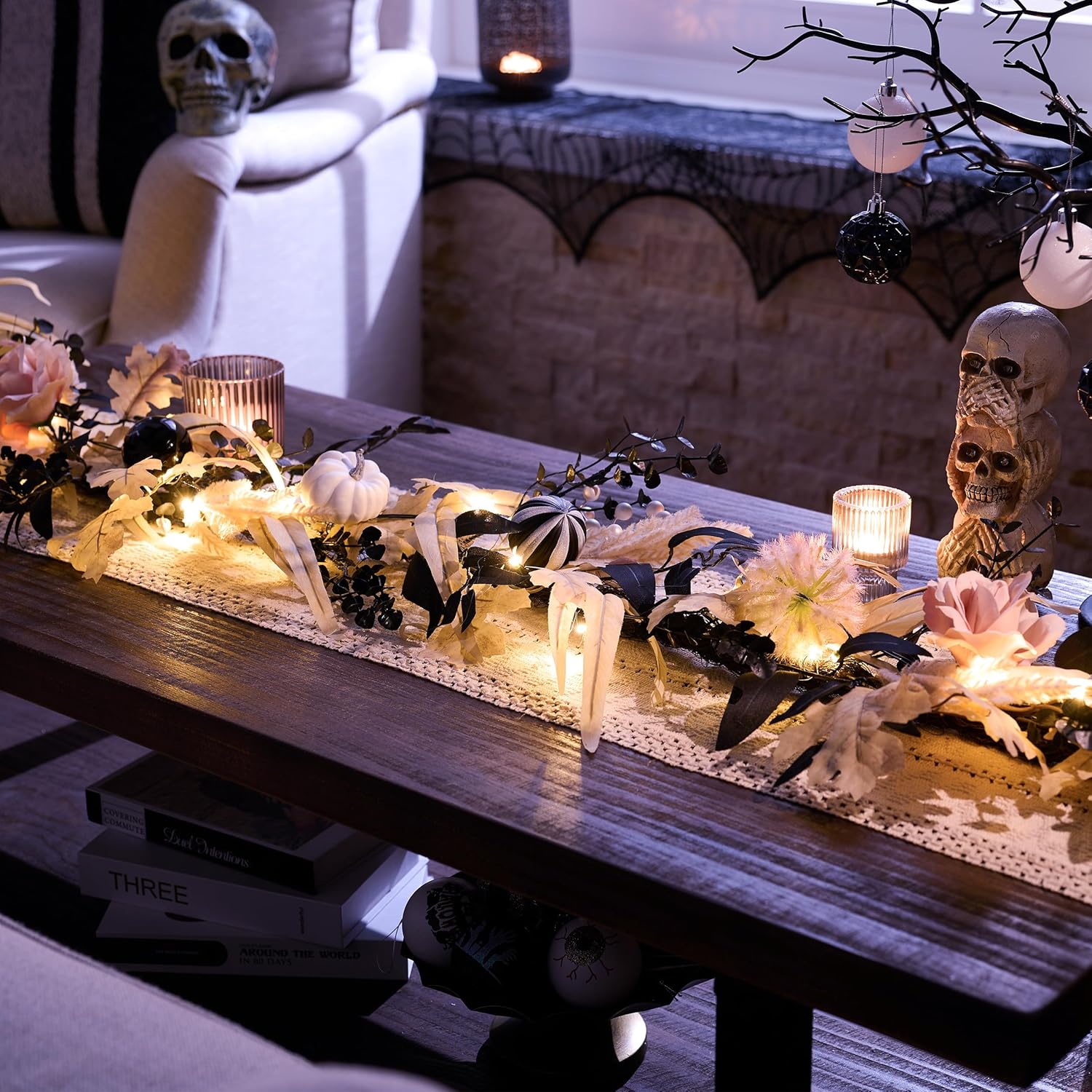 Valery Madelyn Christmas Halloween Fall Garland for Mantle with Lights, 6 Feet Pre-Lit Pink Roses White Pumpkin Garland Decorations for Table Centerpiece Indoor Stair Party Holiday Autumn Home Decor
