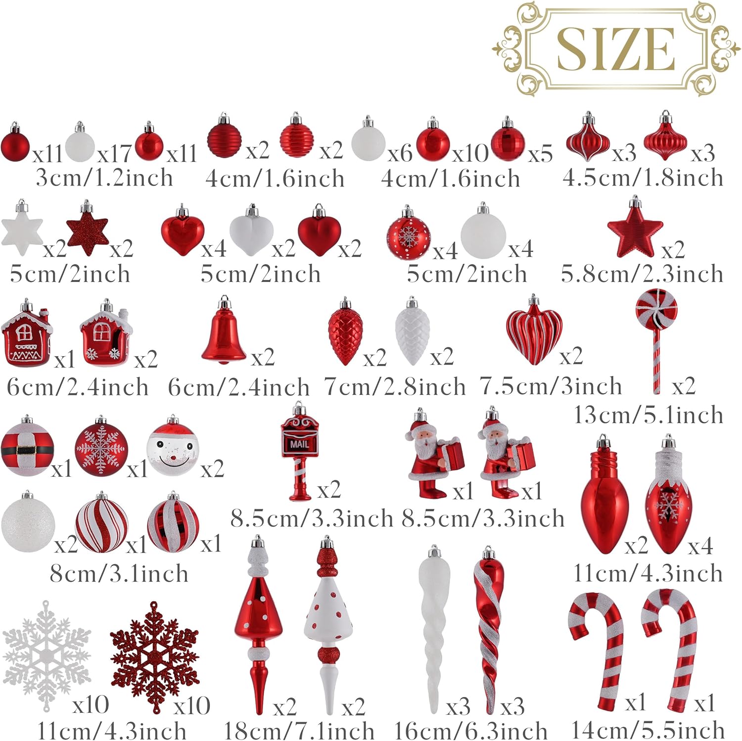 【Original Design】Valery Madelyn is a retail brand adhering to original seasonal decorations. This set of Christmas balls belongs to the American Tradition theme. It applies red and white colors to create a classic and traditional atmosphere【Variety of Patterns and Molds】This set includes a variety of Christmas-themed ornaments, featuring round balls with snowman, snowflake, stripe, and belt designs, as well as Santa Claus, bells, houses, pinecones, stars, hearts, candy canes, finials, onion-shaped balls, lightbulbs, mailboxes, snowflakes, and icicles. The diverse patterns complement each other well, adding interest and charm to your overall decor
