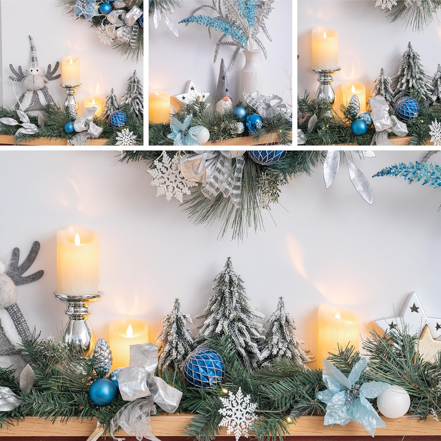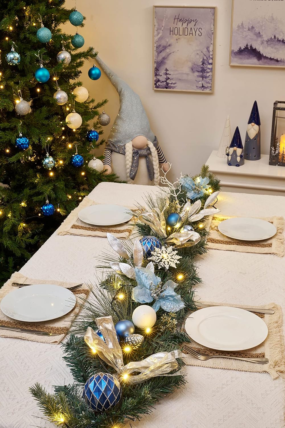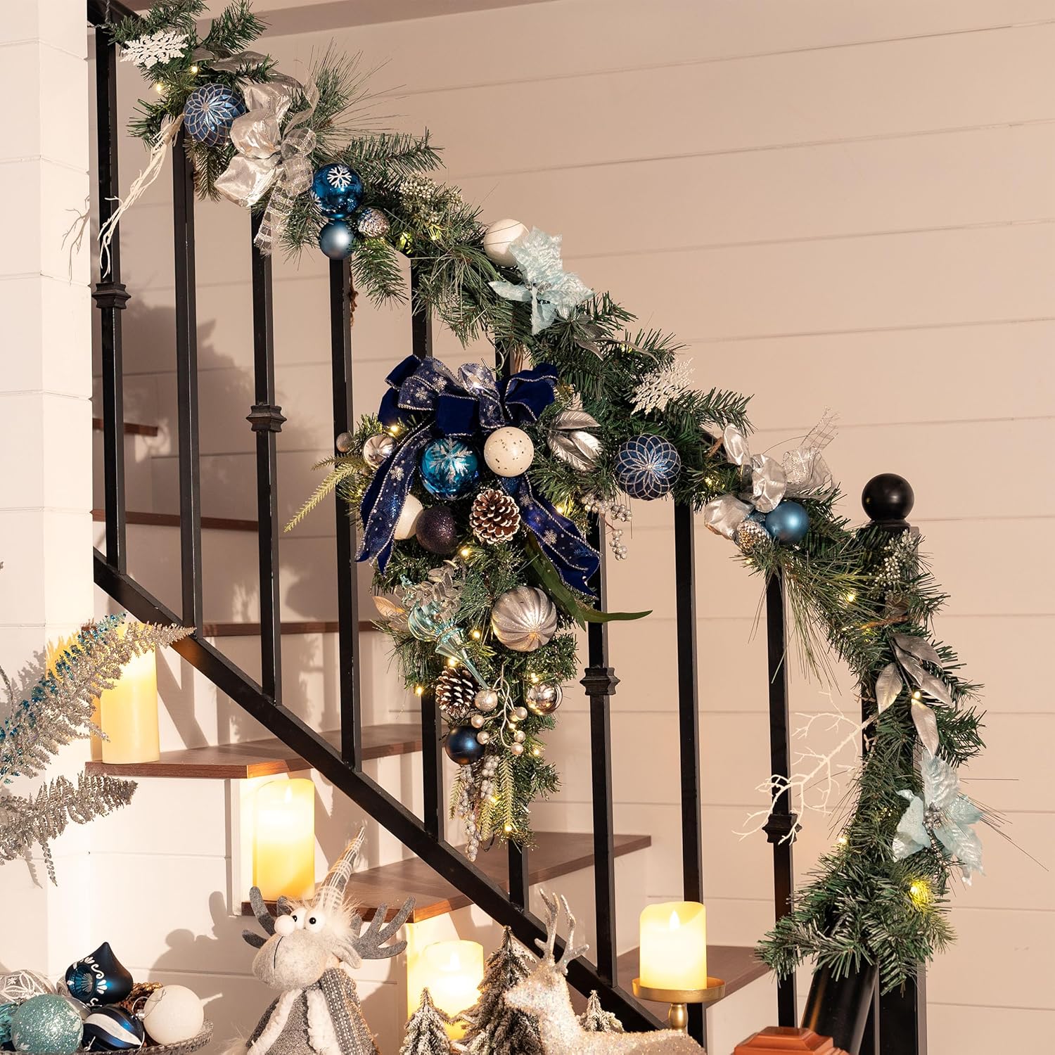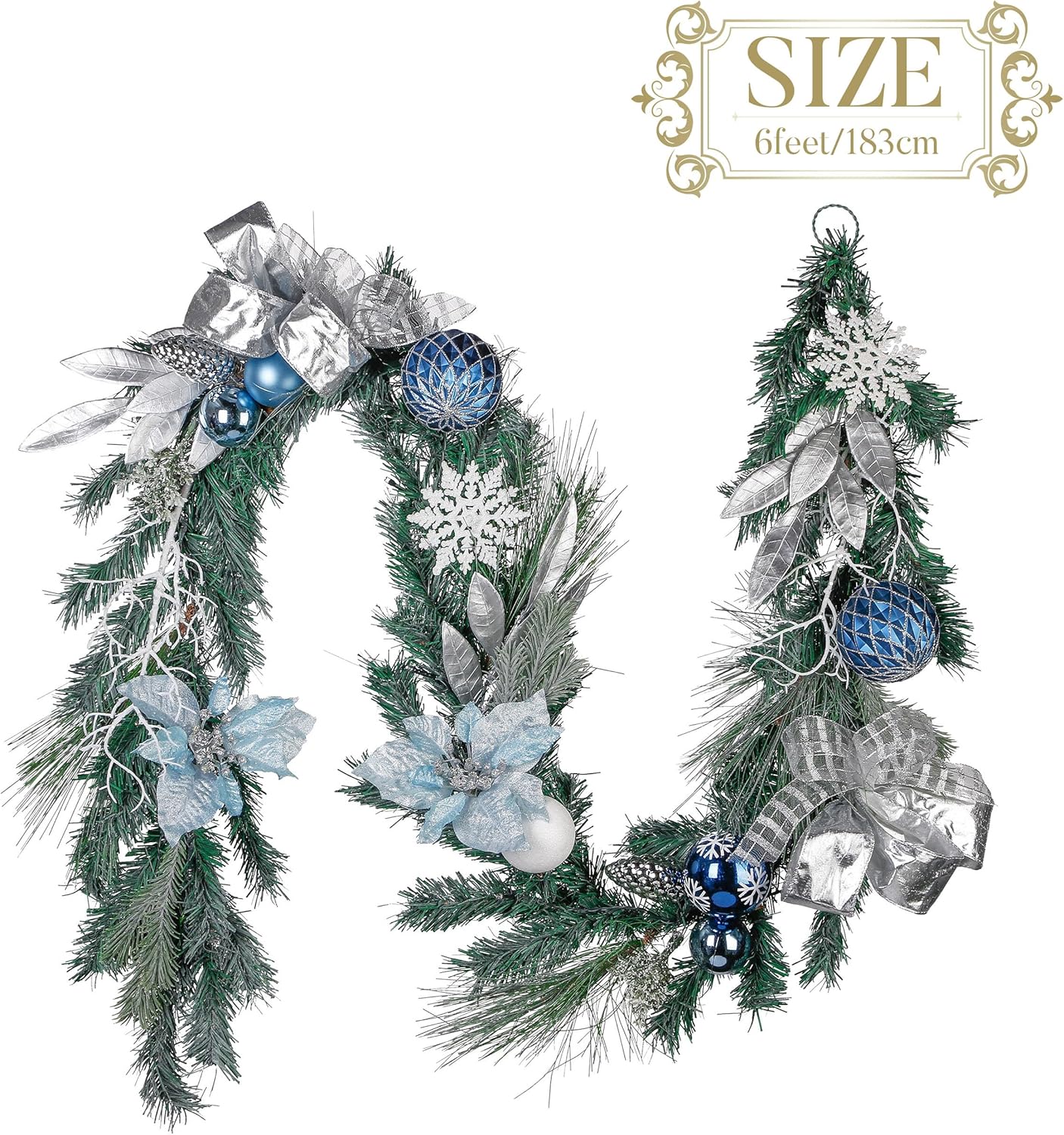 Valery Madelyn Pre-Lit Christmas Garland with Lights for Mantle, 6 feet Lighted Battery Operated Xmas Garland with Silver Light Blue Balls for Front Door Fireplace Table Centerpiece Outdoor Decor